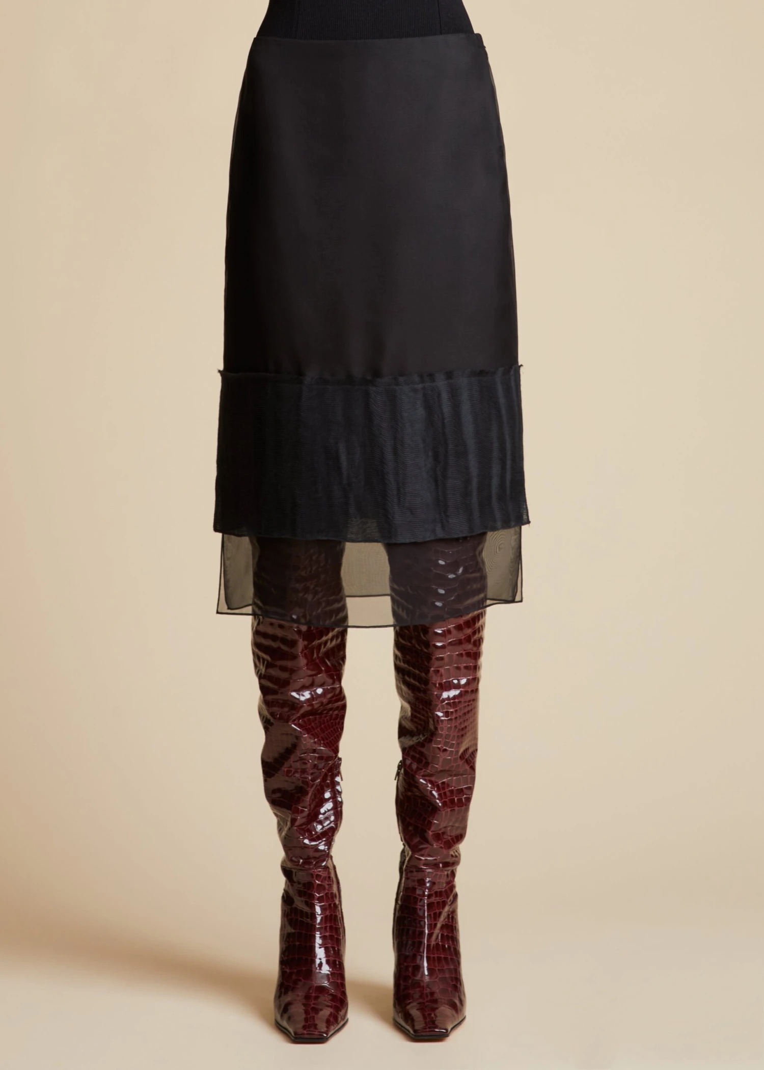 With its play of translucency and opacity, this paneled silk skirt demonstrates the intensified silhouettes, heightened tactility, and decisive yet playful details of the Pre-Fall collection’s wardrobe of intuition. Layers of silk-lined organza are joined by a tonal band traced by undulating lines. A concealed side zipper ensures a smooth fit.