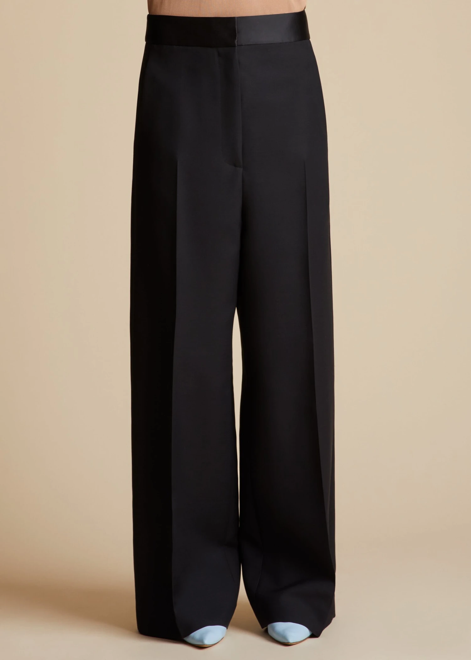 Designed to sit low on the waist and further eased by a slightly dropped crotch, this fluid wide-leg pant is framed by a luminous contrast waistband. The relaxed silhouette is refined by inset side pockets and back welt pockets.