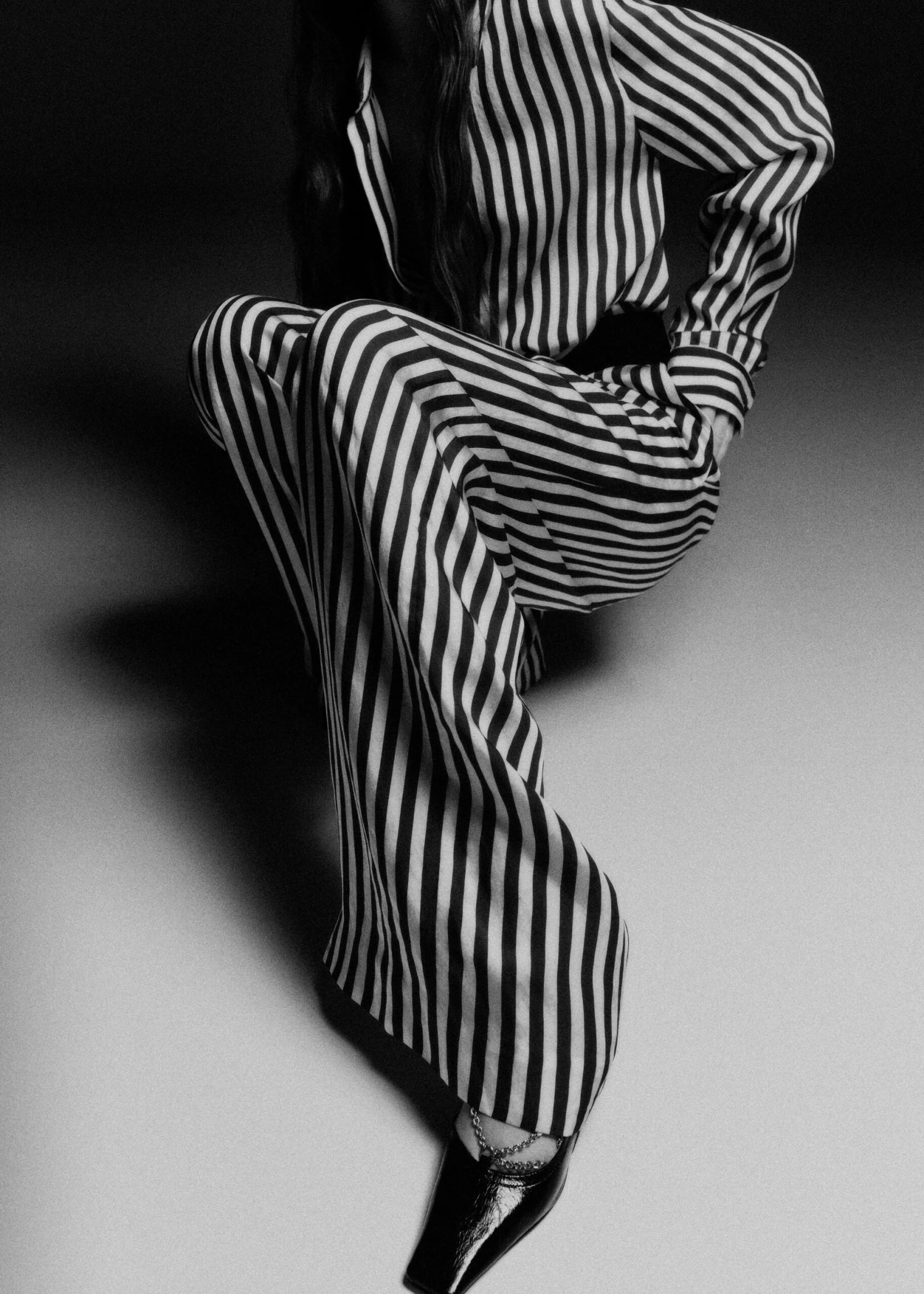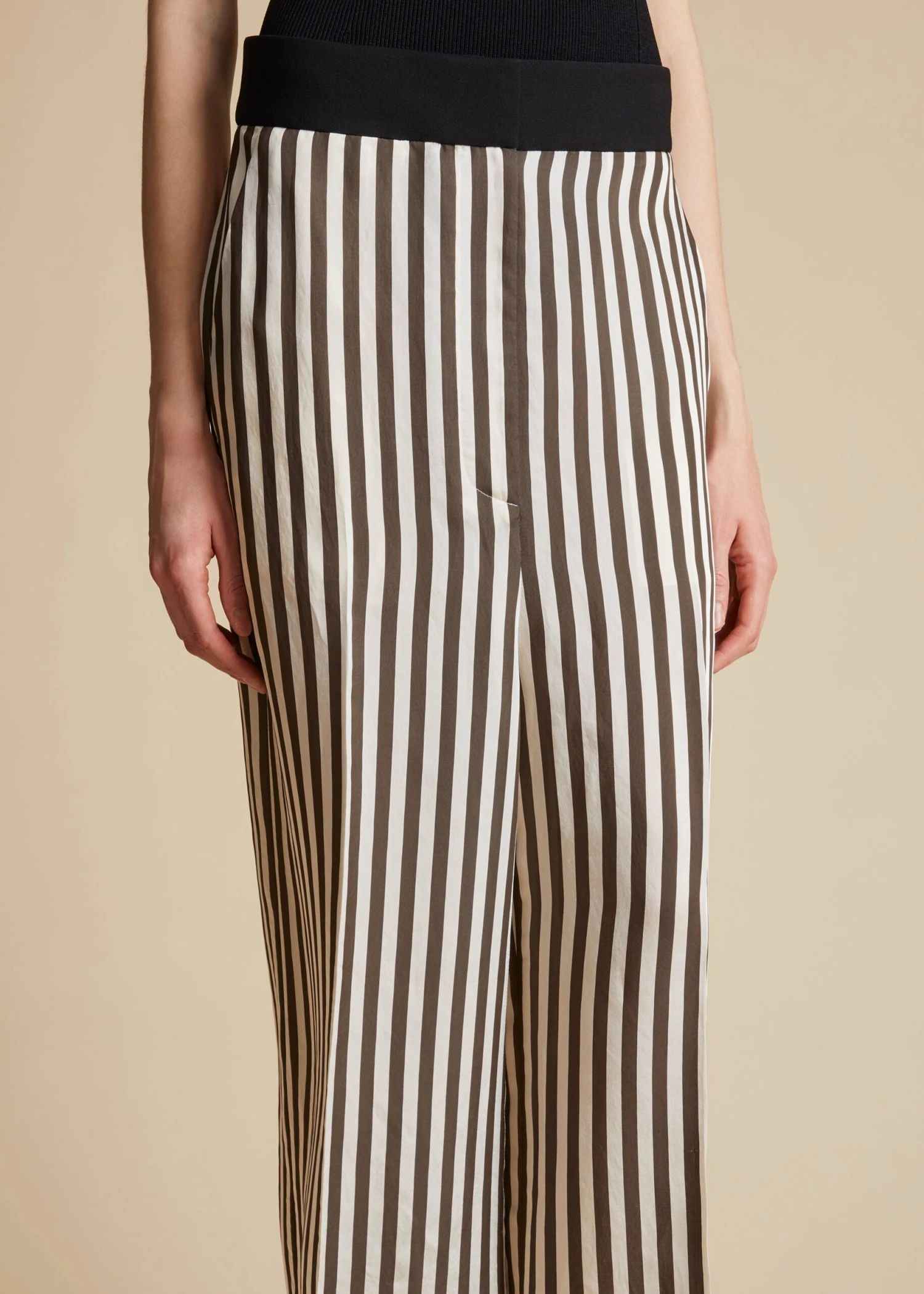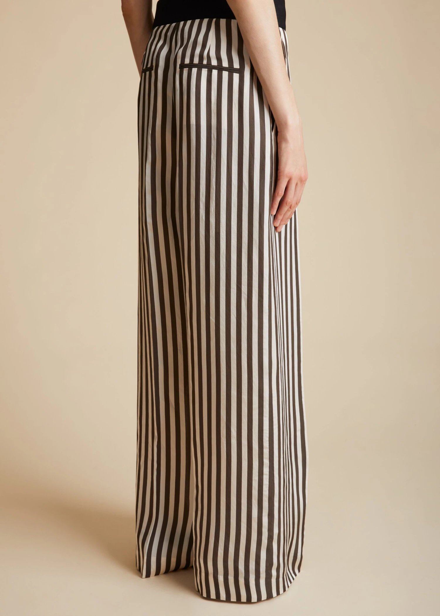 Adding a lively charm to the Pre-Fall collection are graphic lines softened by hues of warm ivory and dark chocolate. Designed to sit low on the waist and further eased by a slightly dropped crotch, this fluid wide-leg pant is framed by a contrast waistband. The relaxed silhouette is refined by inset side pockets and back welt pockets.
