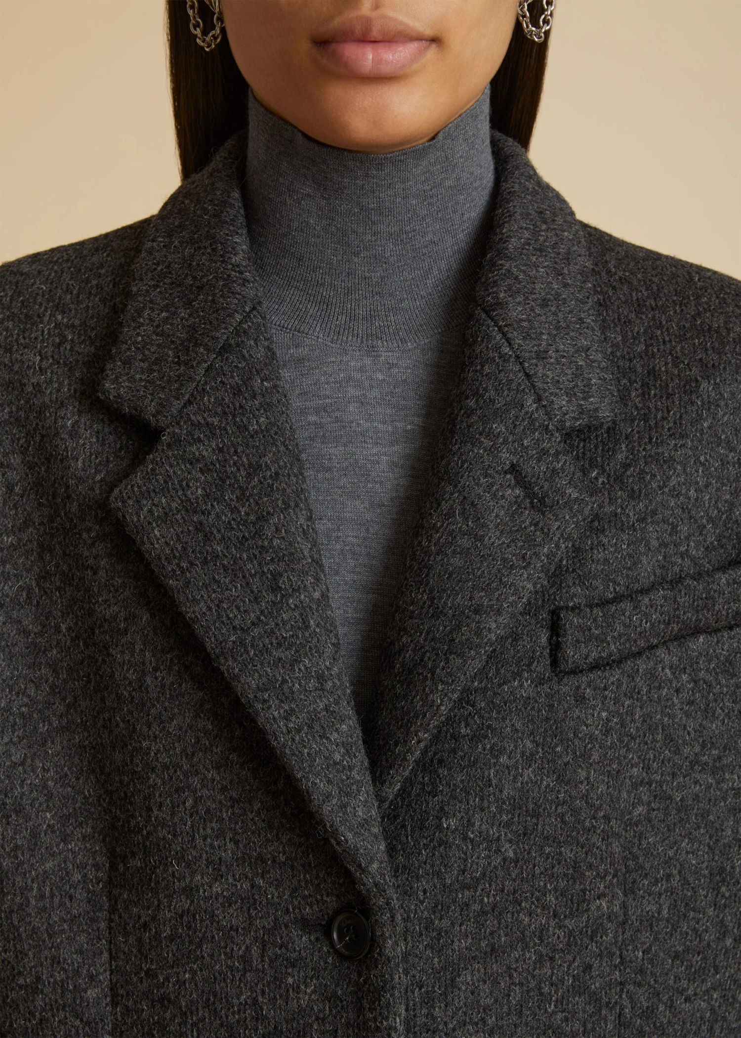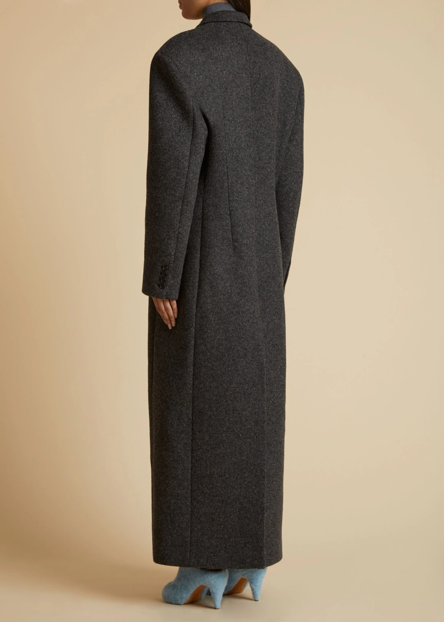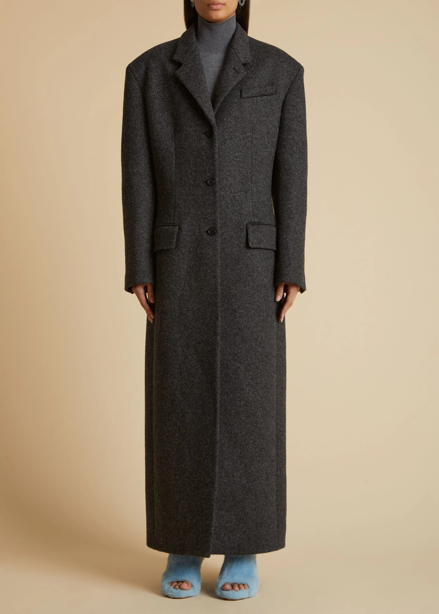 An elongated, menswear-inspired overcoat structured by boldly scaled shoulders. Shaped at the waist. With notched collar and cupro twill lining.