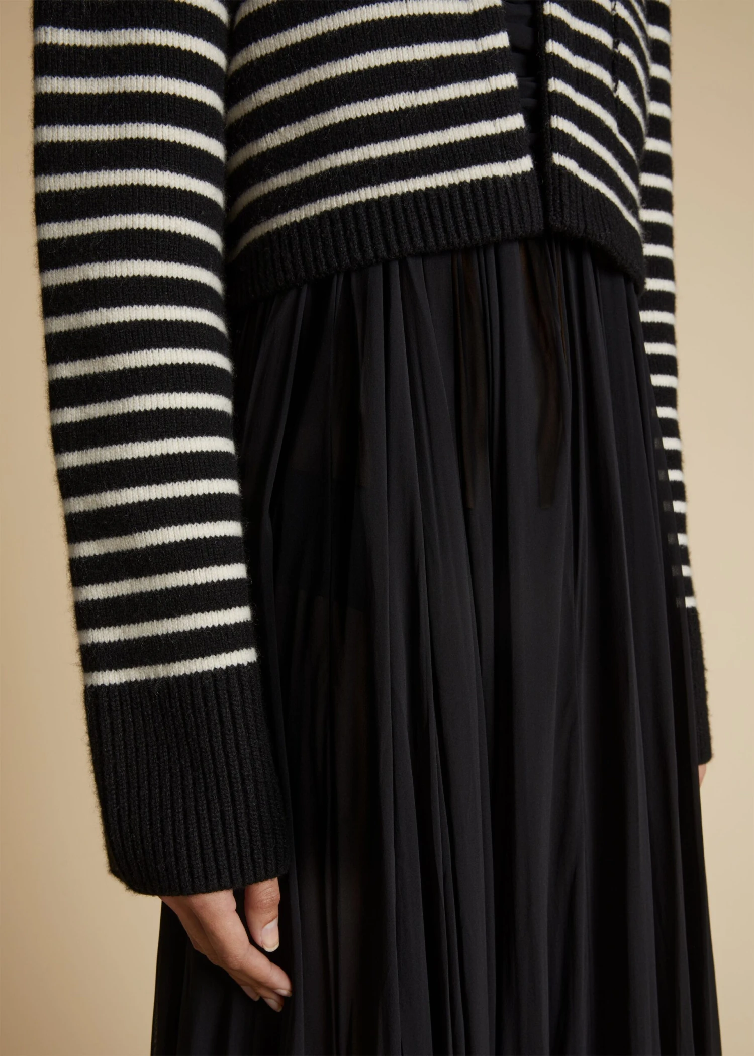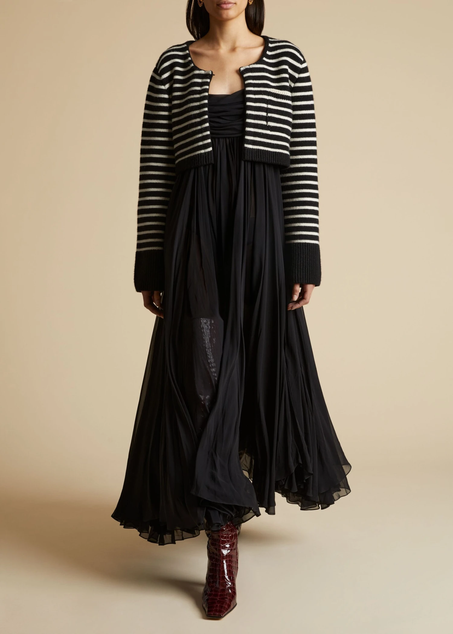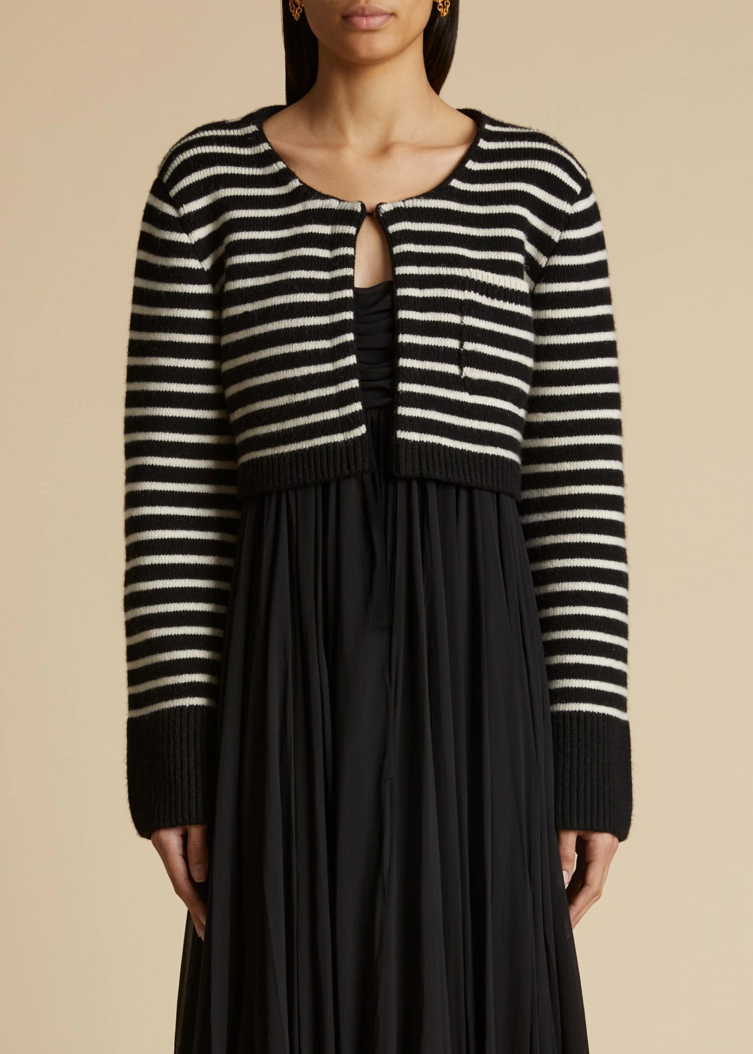 Part of the Pre-Fall collection’s wardrobe of intuition, this luscious cashmere cardigan is a cropped, graphic foil to elongated silhouettes. A lone button closure creates a scooped neckline. Finishing touches include a patch pocket at the chest and solid fisherman rib-stitched trim at the hem and extended cuffs.