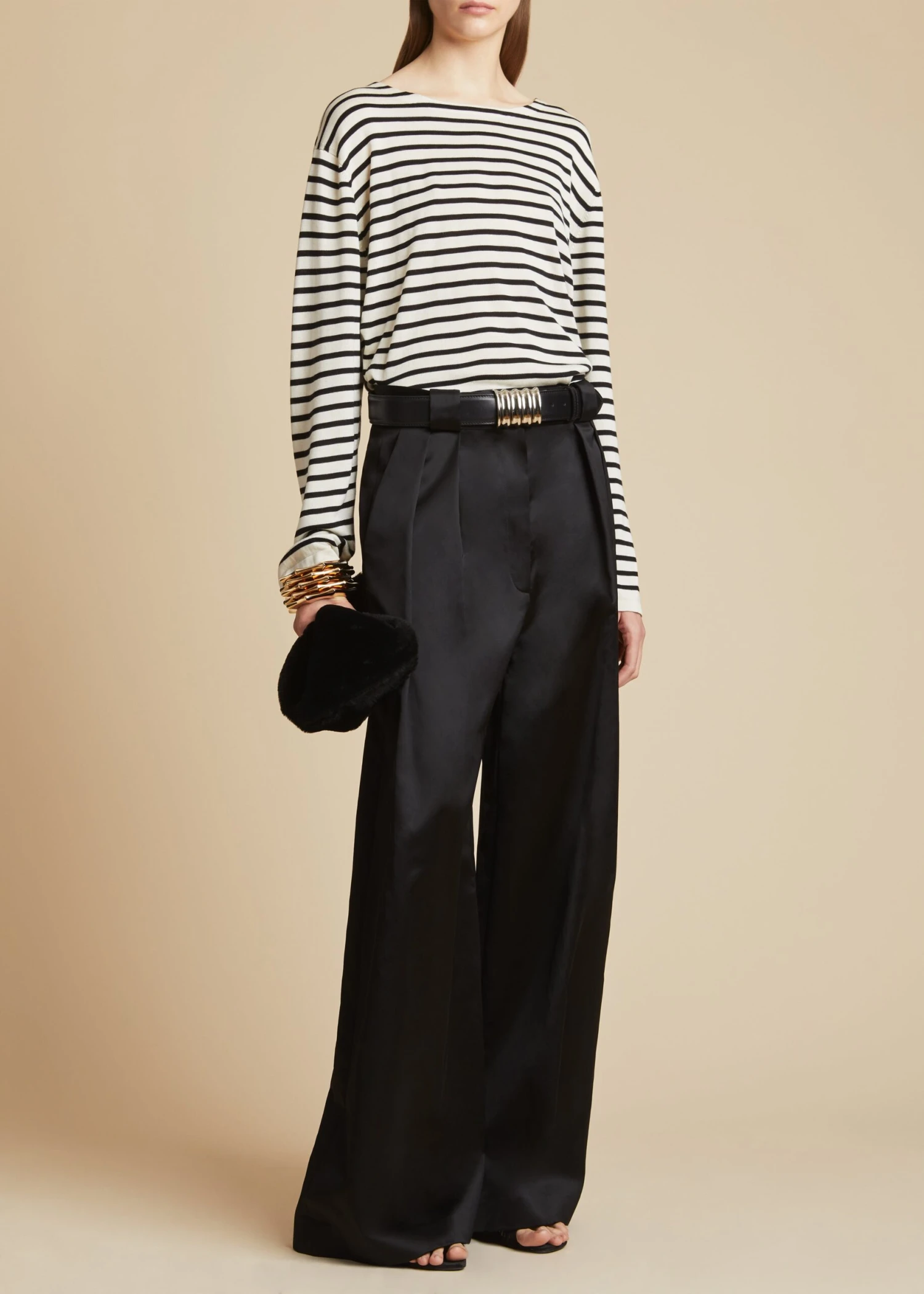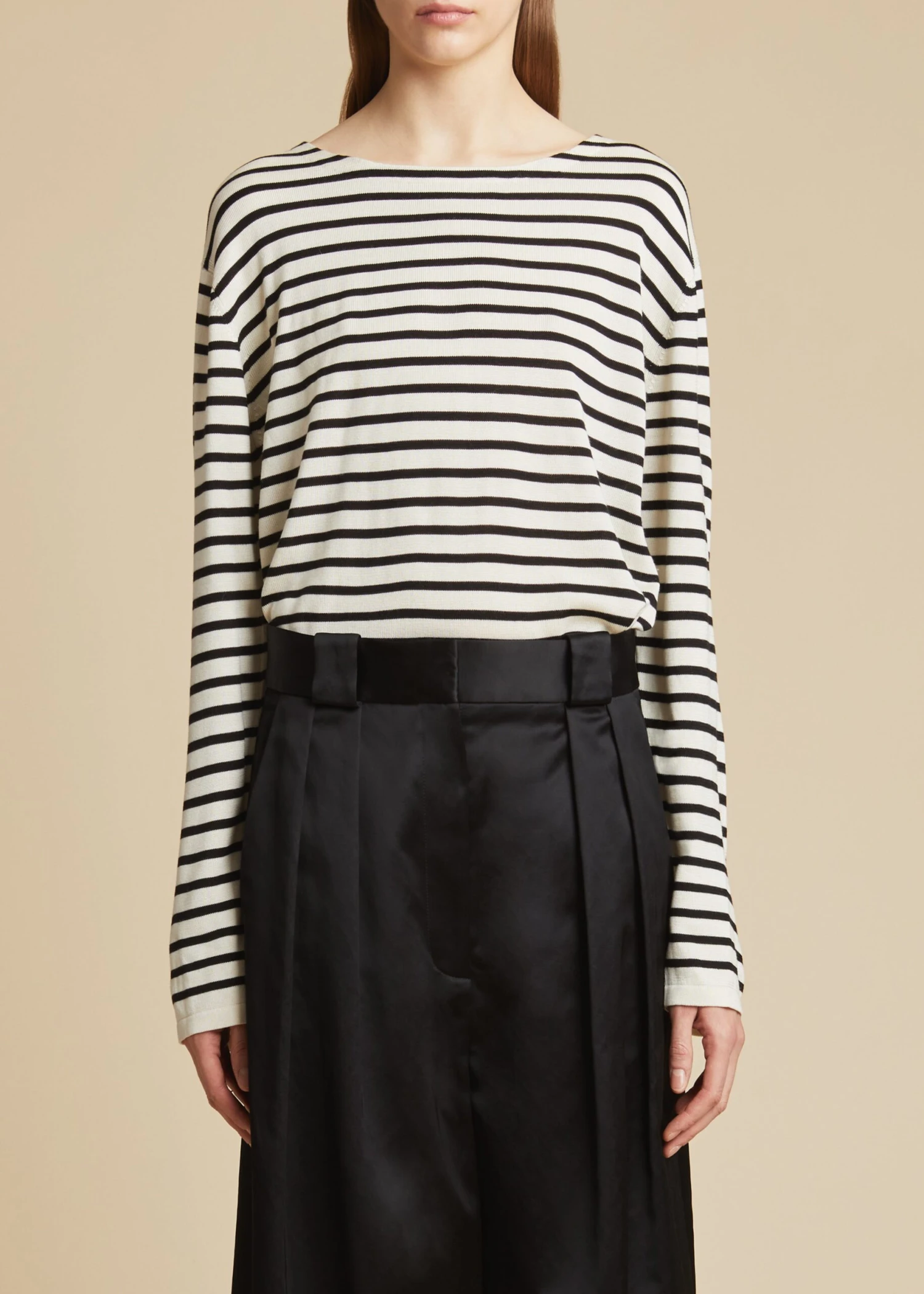 The rich textures, fluid proportions, and nuanced neutral palette of the Resort 2023 collection push ease to elegant new extremes. This relaxed pullover reimagines the classic in pure silk and classic black and ivory stripes. It is made memorable by dropped shoulder seams and extended sleeves designed to reach the fingertips.