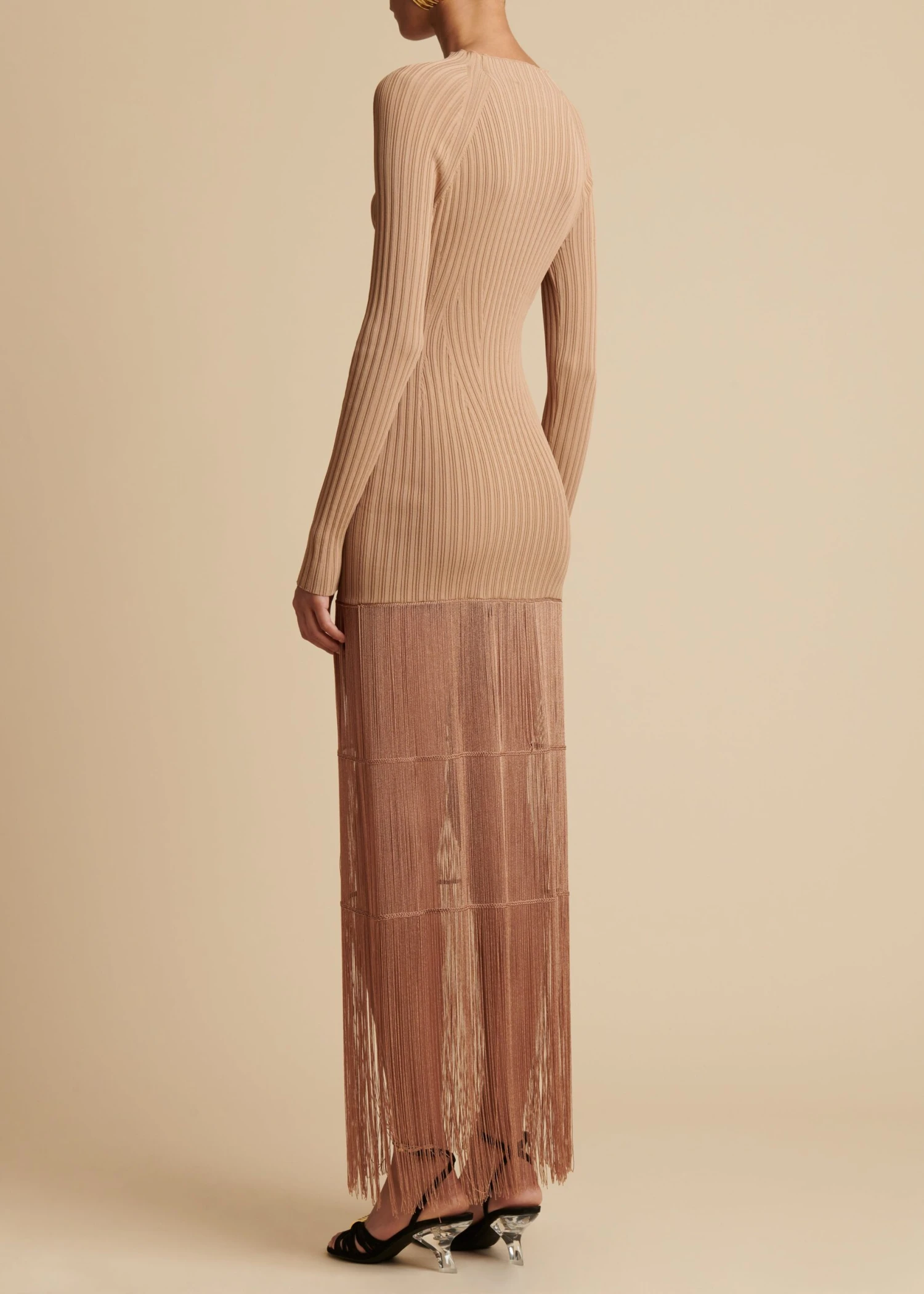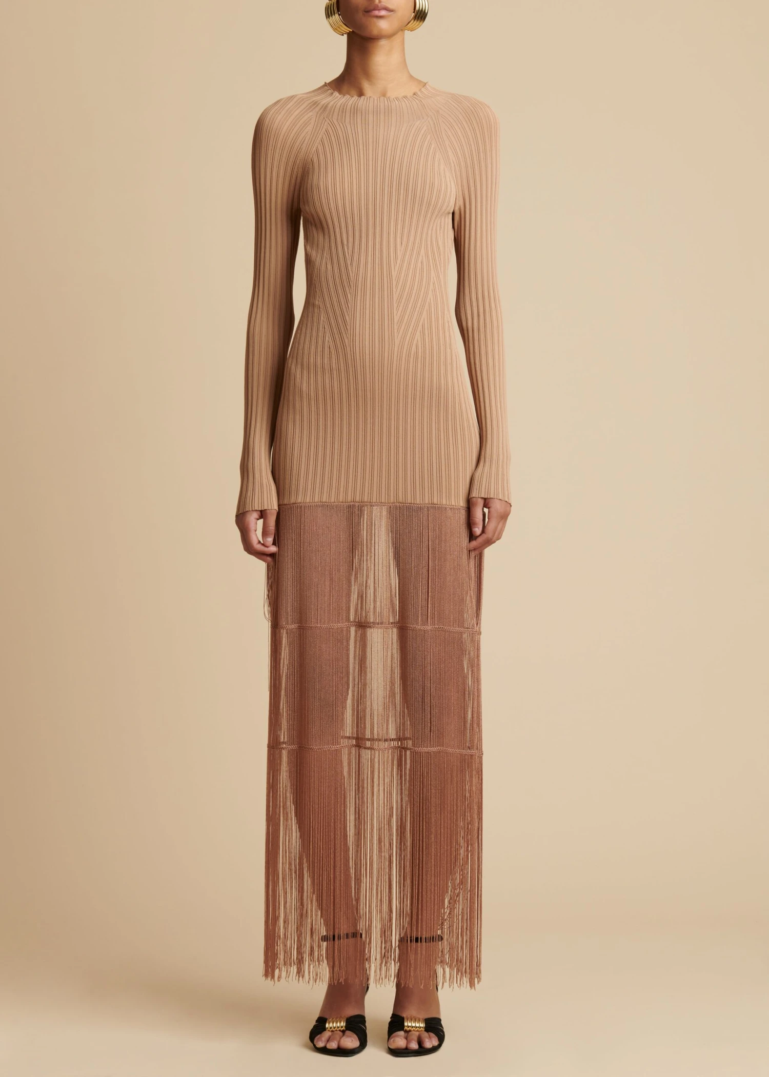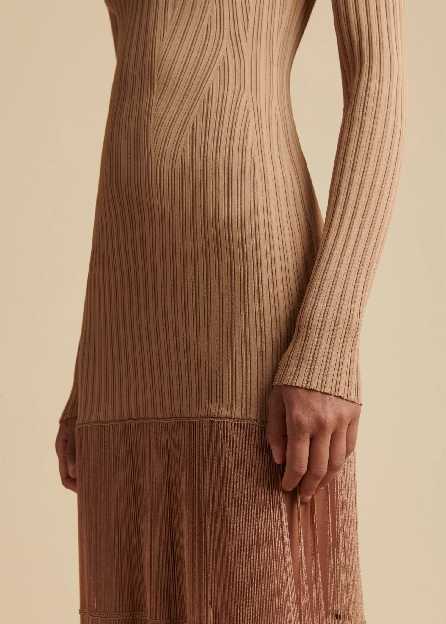 The knitwear of the Spring/Summer 2023 collection engages with concepts of animation and suspension to introduce mesmerizing surfaces developed in dialogue with the body. A runway standout, this sleek, long-sleeved dress combines a mock turtleneck and sculpted ribbing with a skirt of tiered fringe that comes alive with every step.