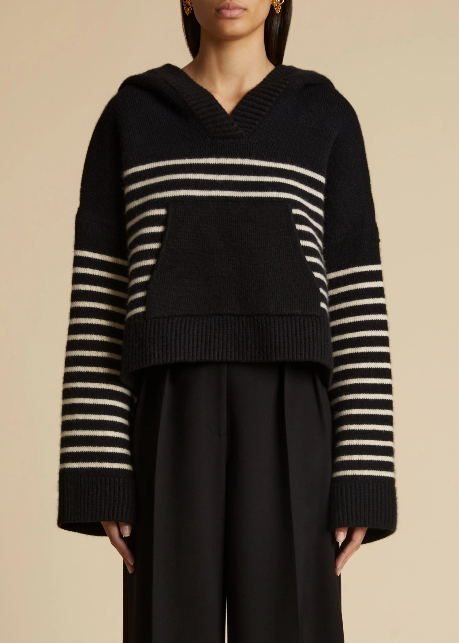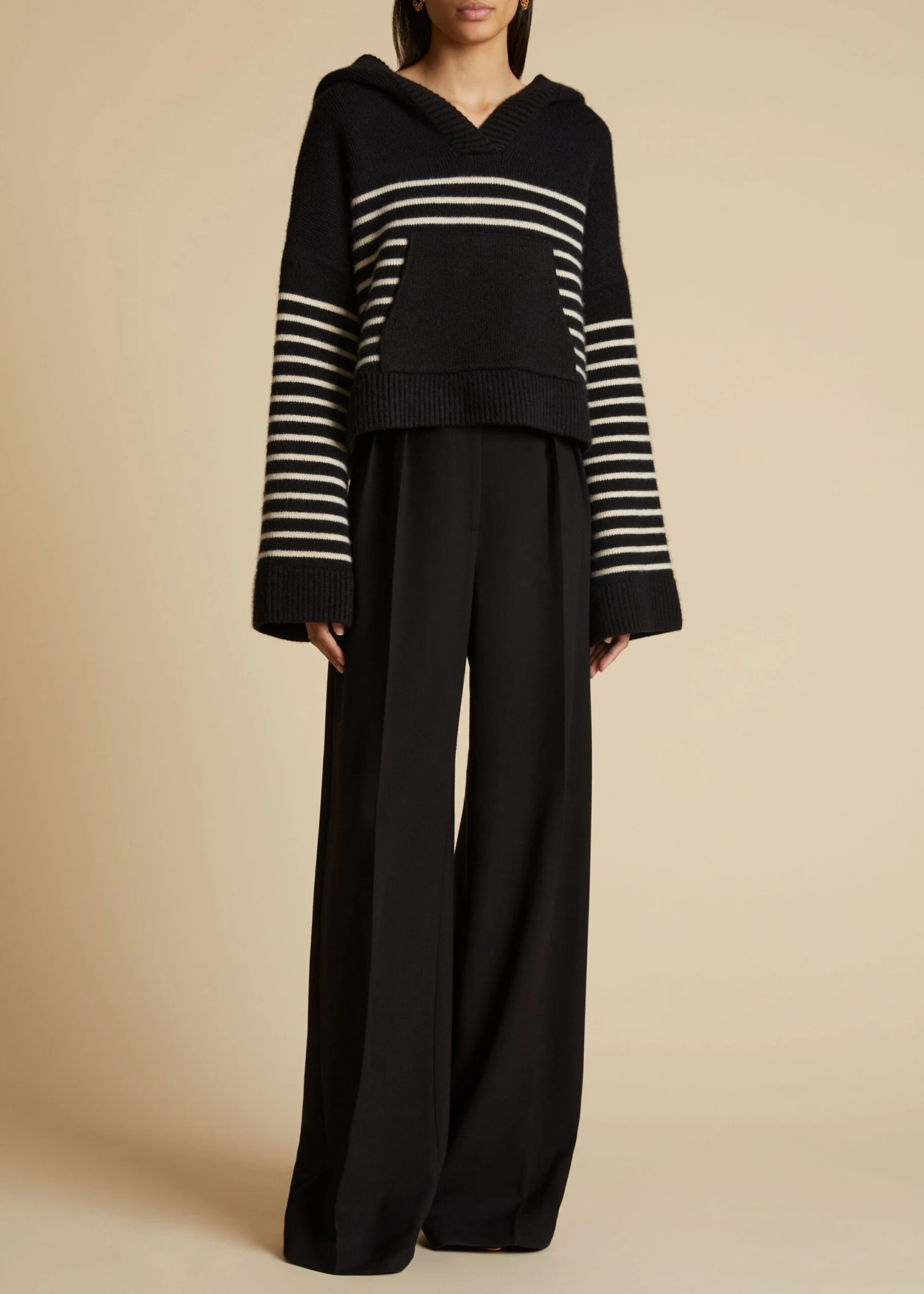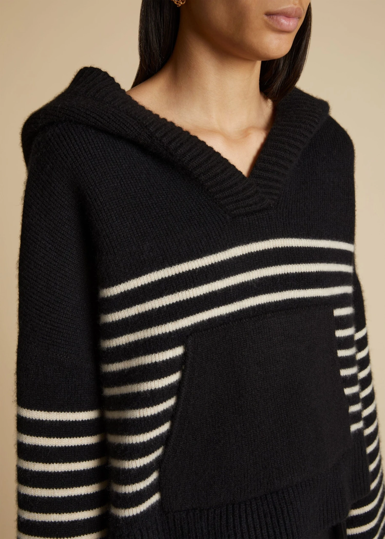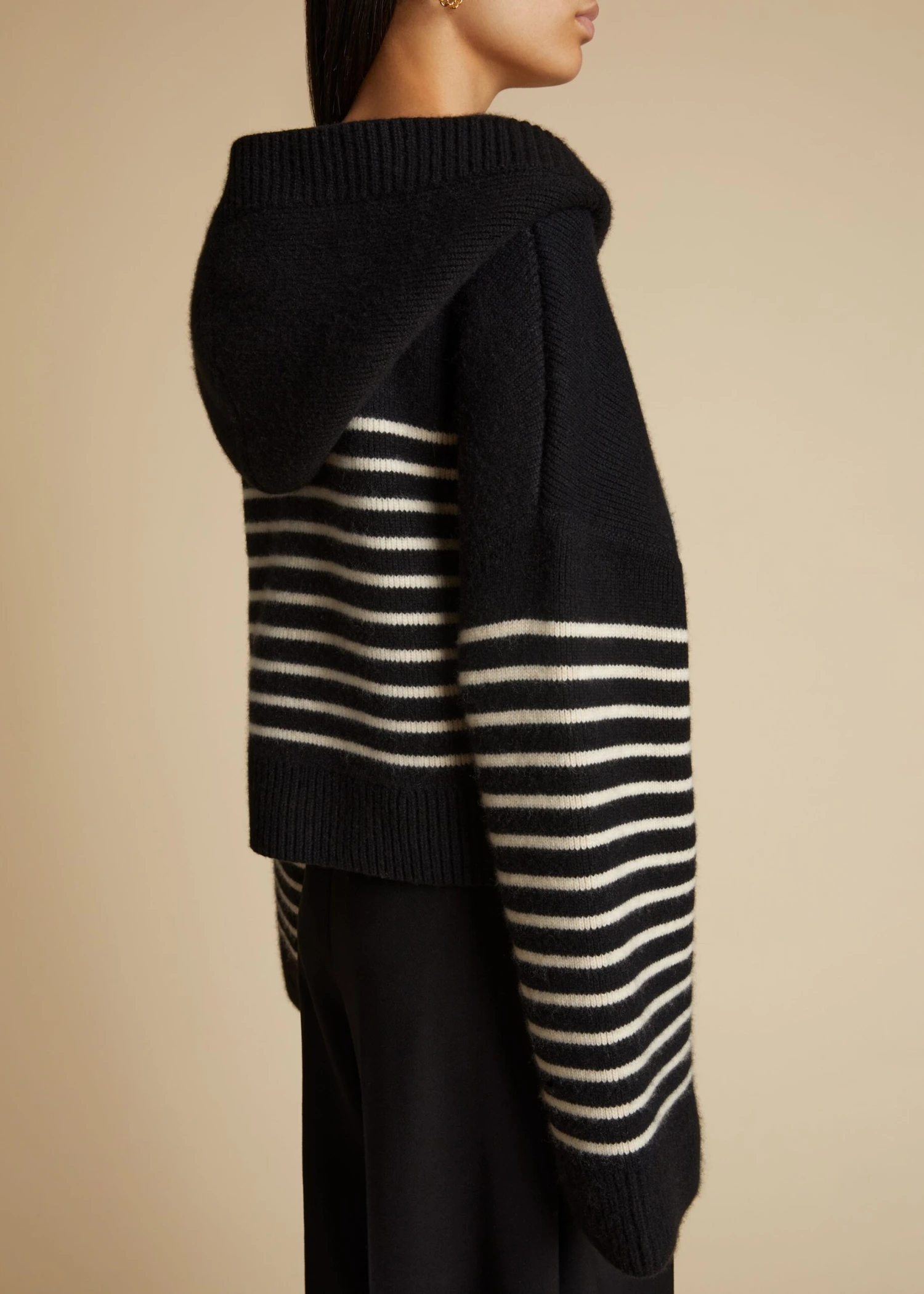 Debuting in graphic stripes for Pre-Fall 2023, this hooded pullover is made of soft and substantial cashmere. The gently cropped silhouette is framed by an open v-neckline and dropped shoulder seams, with a generously scaled kangaroo pocket and extended sleeves. The placket, cuffs, hood, and hem are refined by fisherman’s-rib-stitched trim.