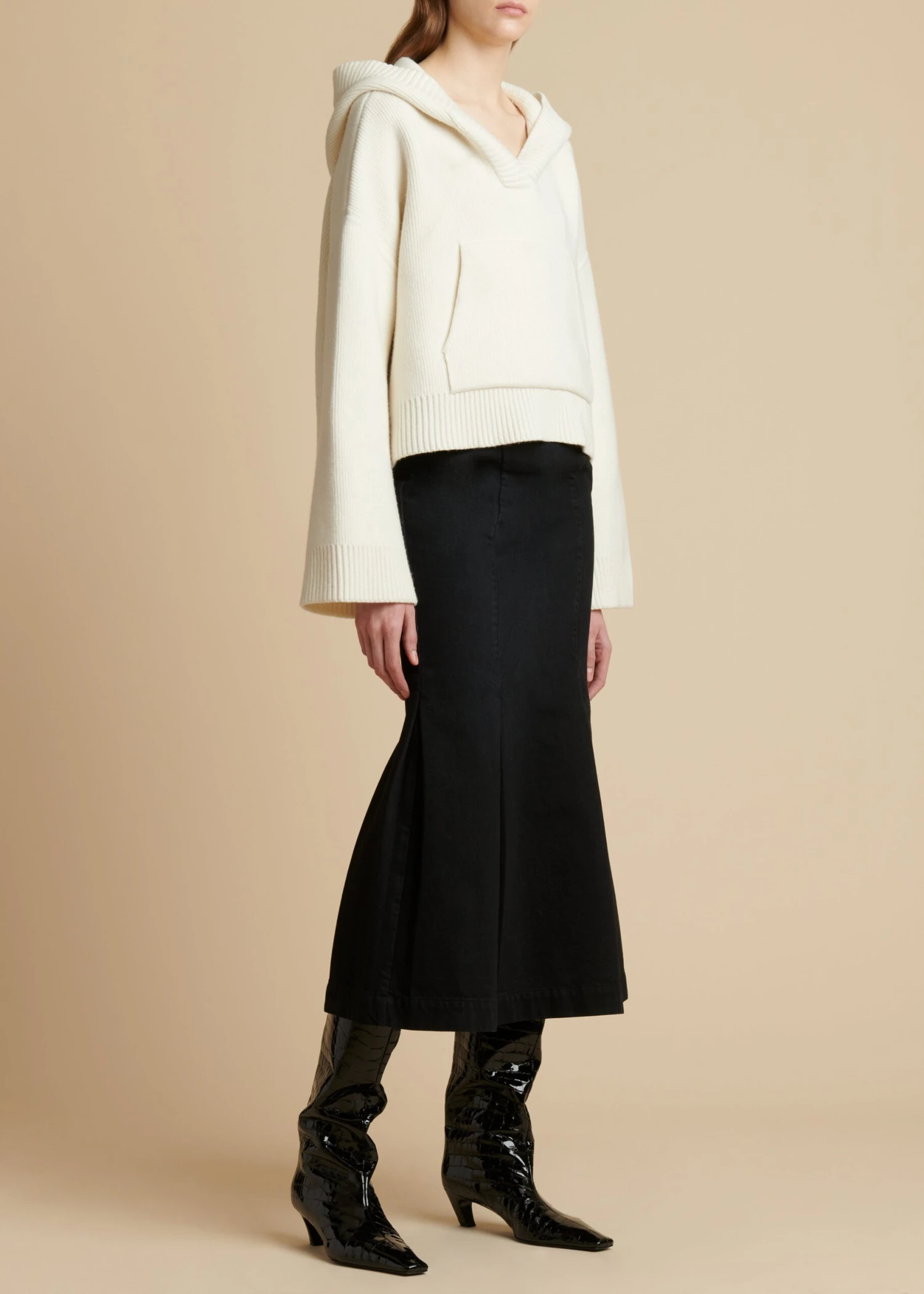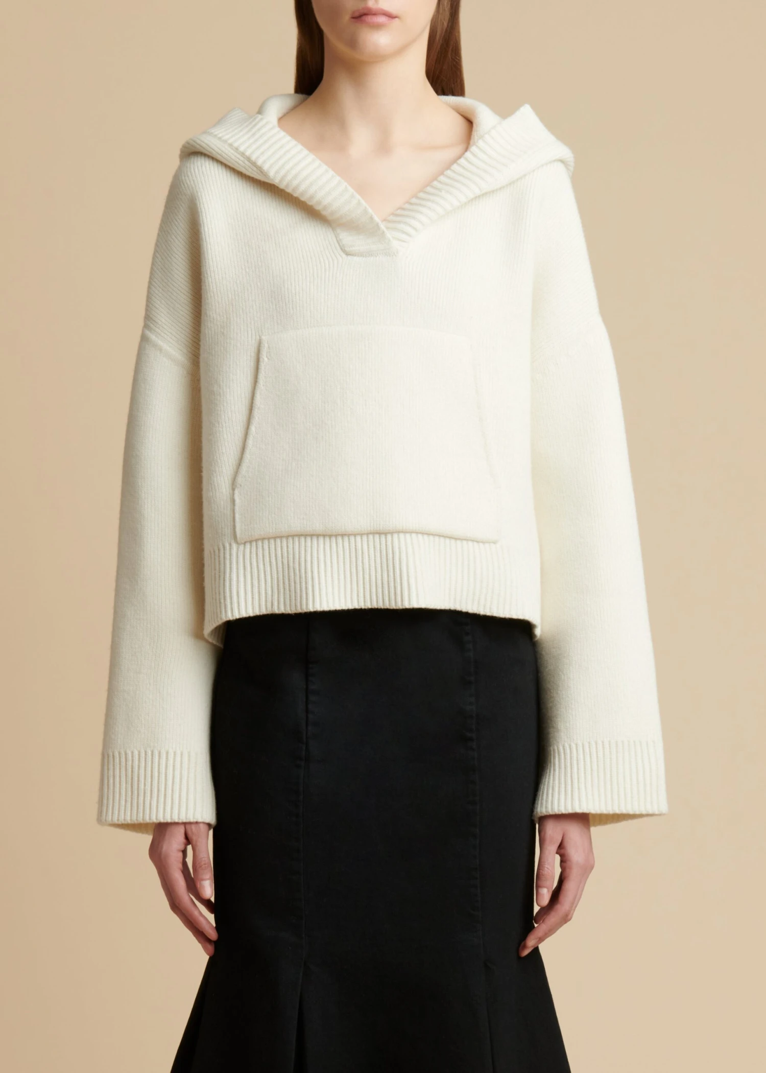 Part of the Resort collection’s wardrobe of momentum, this hooded pullover is made of soft and substantial cashmere: a KHAITE signature. The gently cropped silhouette is framed by an open v-neckline and dropped shoulder seams, with a generously scaled kangaroo pocket and extended sleeves. The placket, cuffs, hood, and hem are refined by fisherman’s-rib-stitched trim.