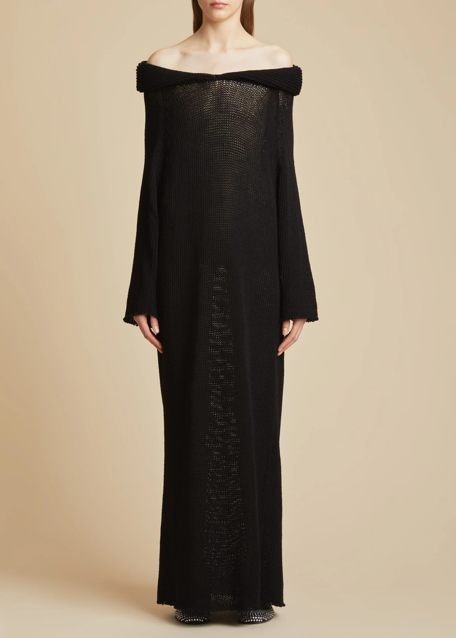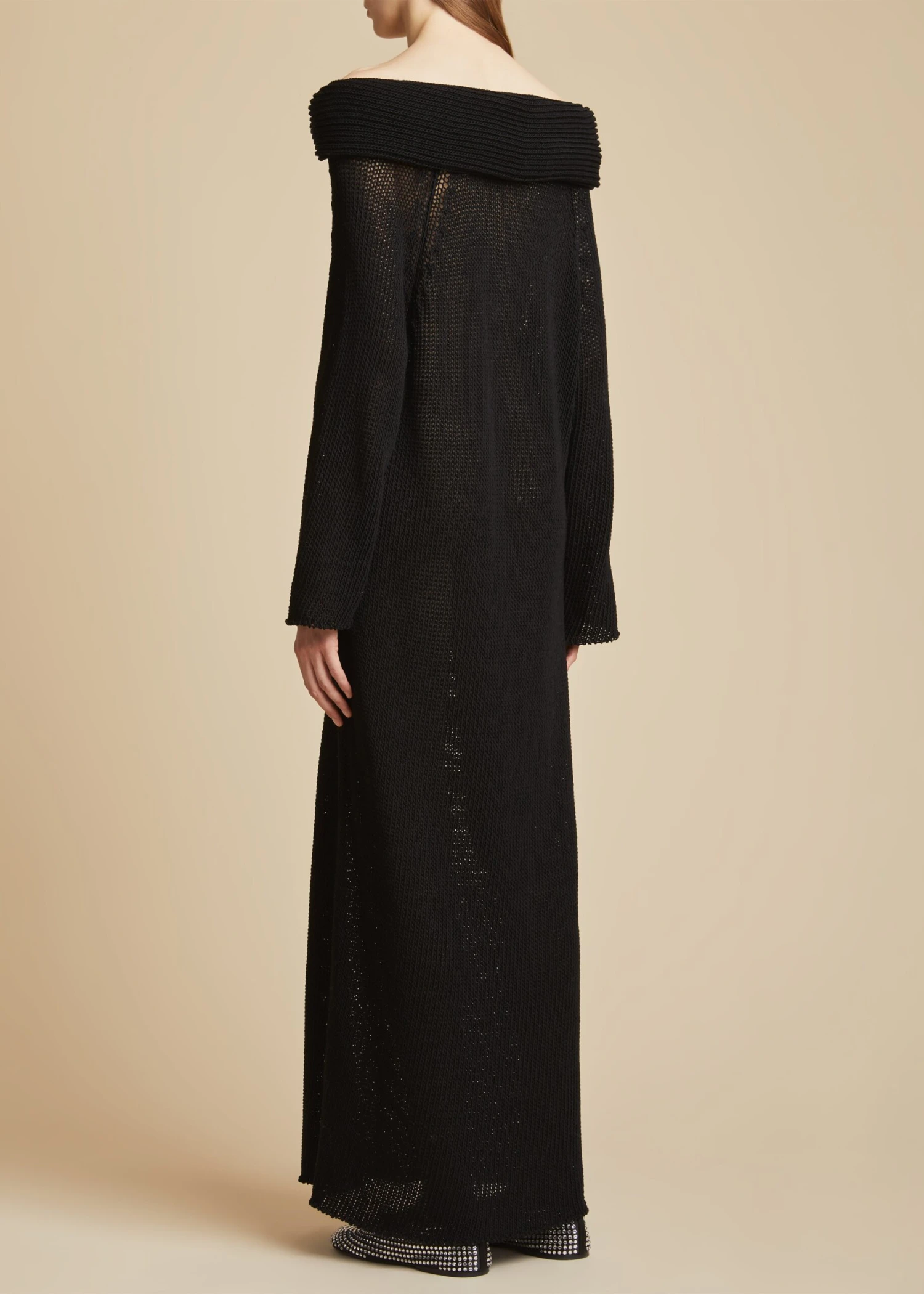 Part of the summer capsule. The knitwear of the Spring/Summer 2023 collection engages with concepts of animation and suspension to introduce mesmerizing surfaces developed in dialogue with the body. Framed by a broad, off-the-shoulder collar, this dress is knit in mercerized cotton that is made especially lightweight by a loose jersey stitch at the lower body. It is free of closures for slip-on ease.