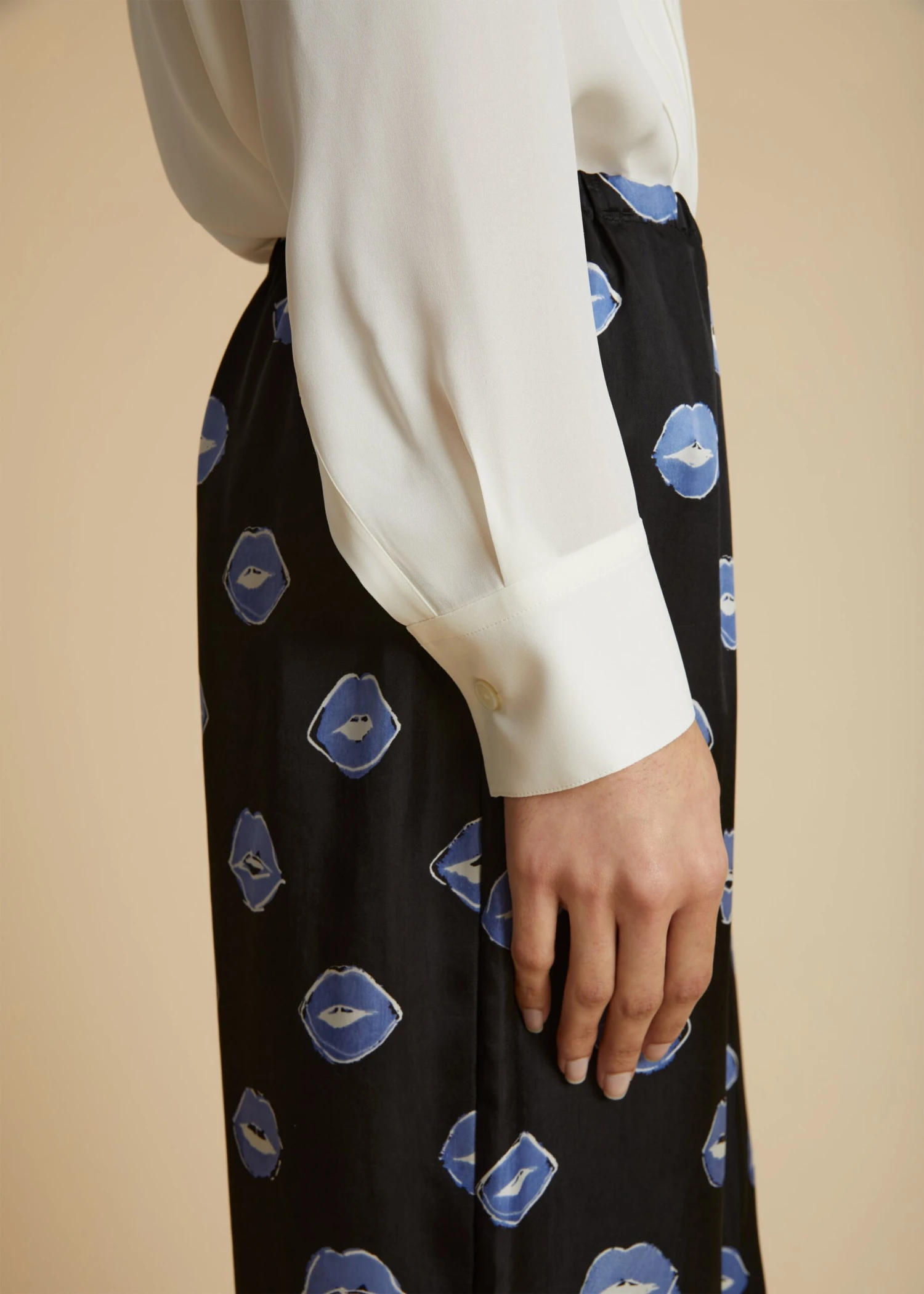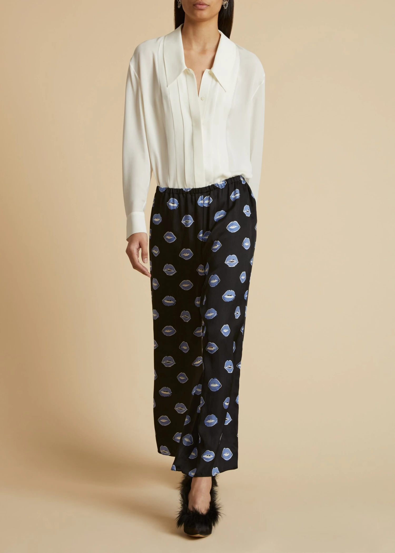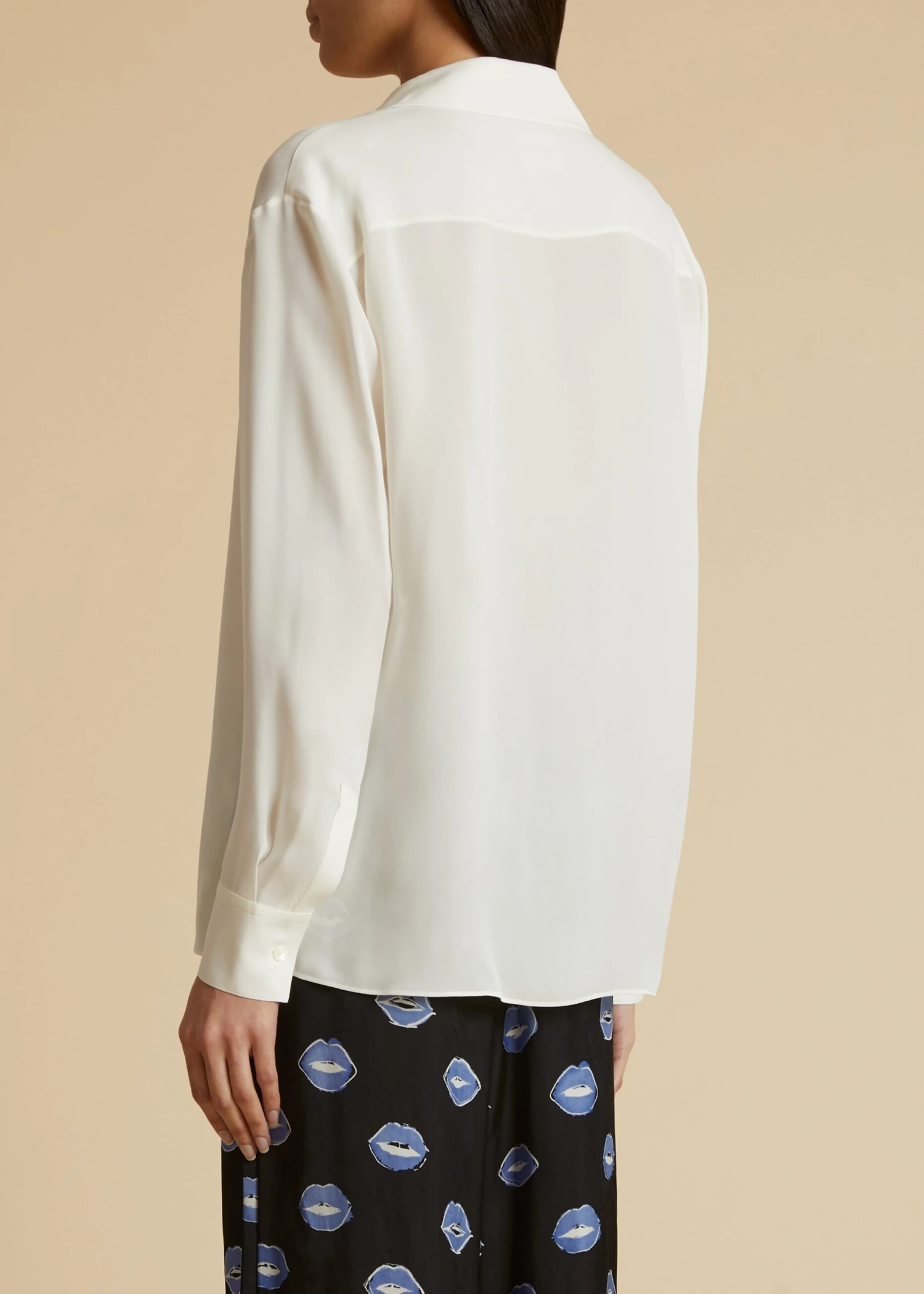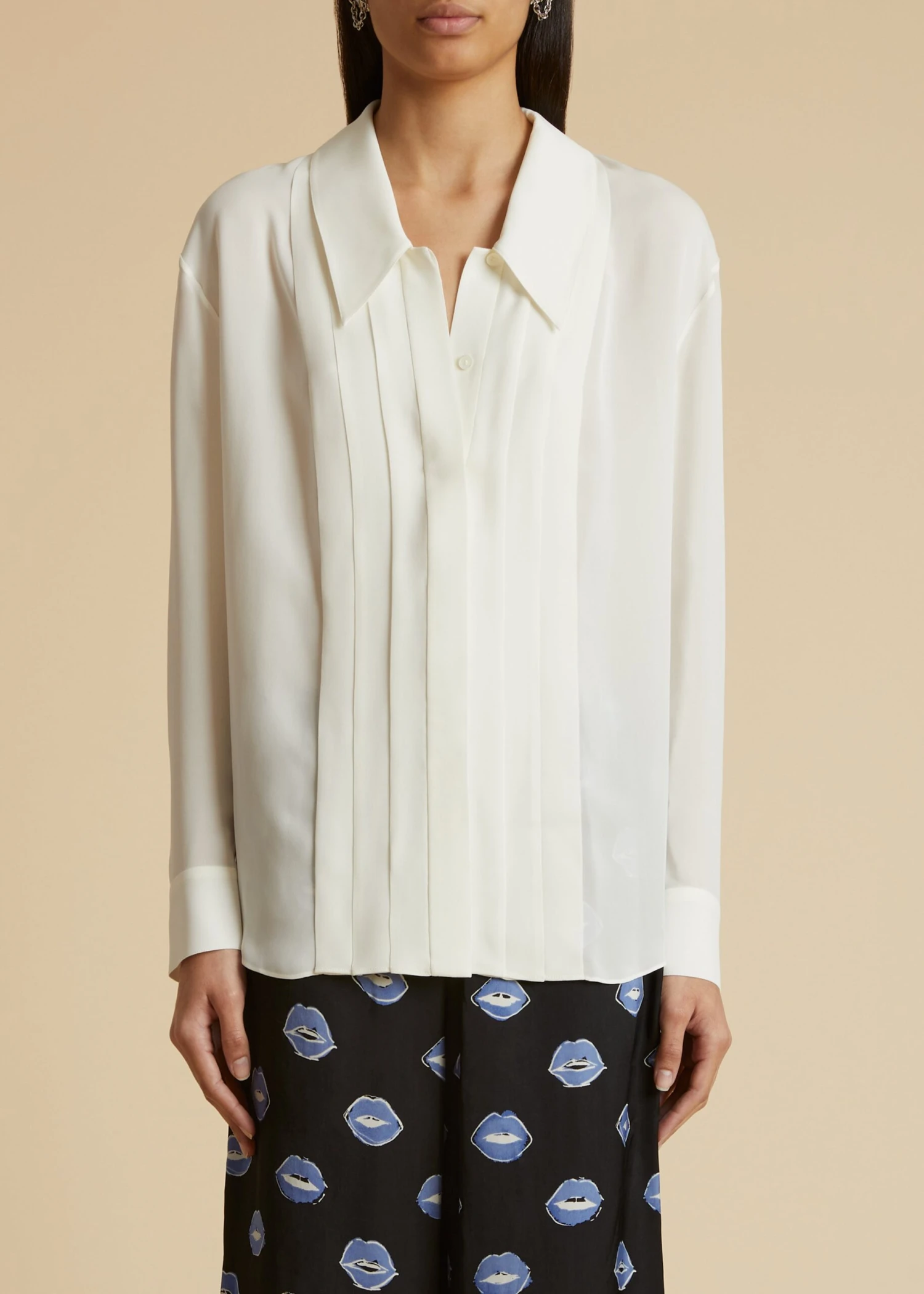 Through elongated and intensified silhouettes like this 19-millimeter silk georgette button-up, the Pre-Fall collection proposes a wardrobe of intuition. The boldly scaled point collar is in dialogue with knife pleats that frame the hidden placket. Finishing touches include a back yoke and pleated, single-button cuffs.