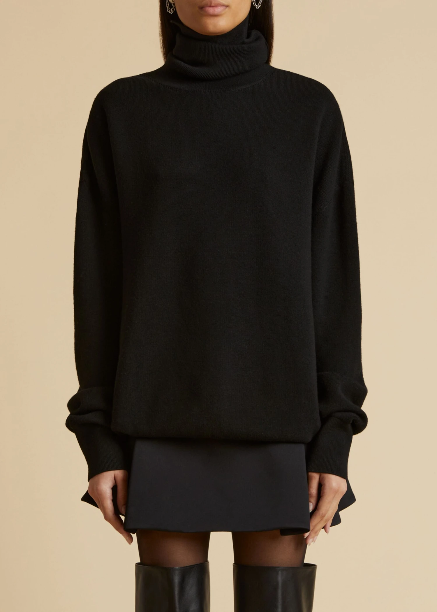 A sculpted turtleneck pullover in soft and robust Merino wool. With dropped shoulder seams and banding at the finely ribbed hem and cuffs.