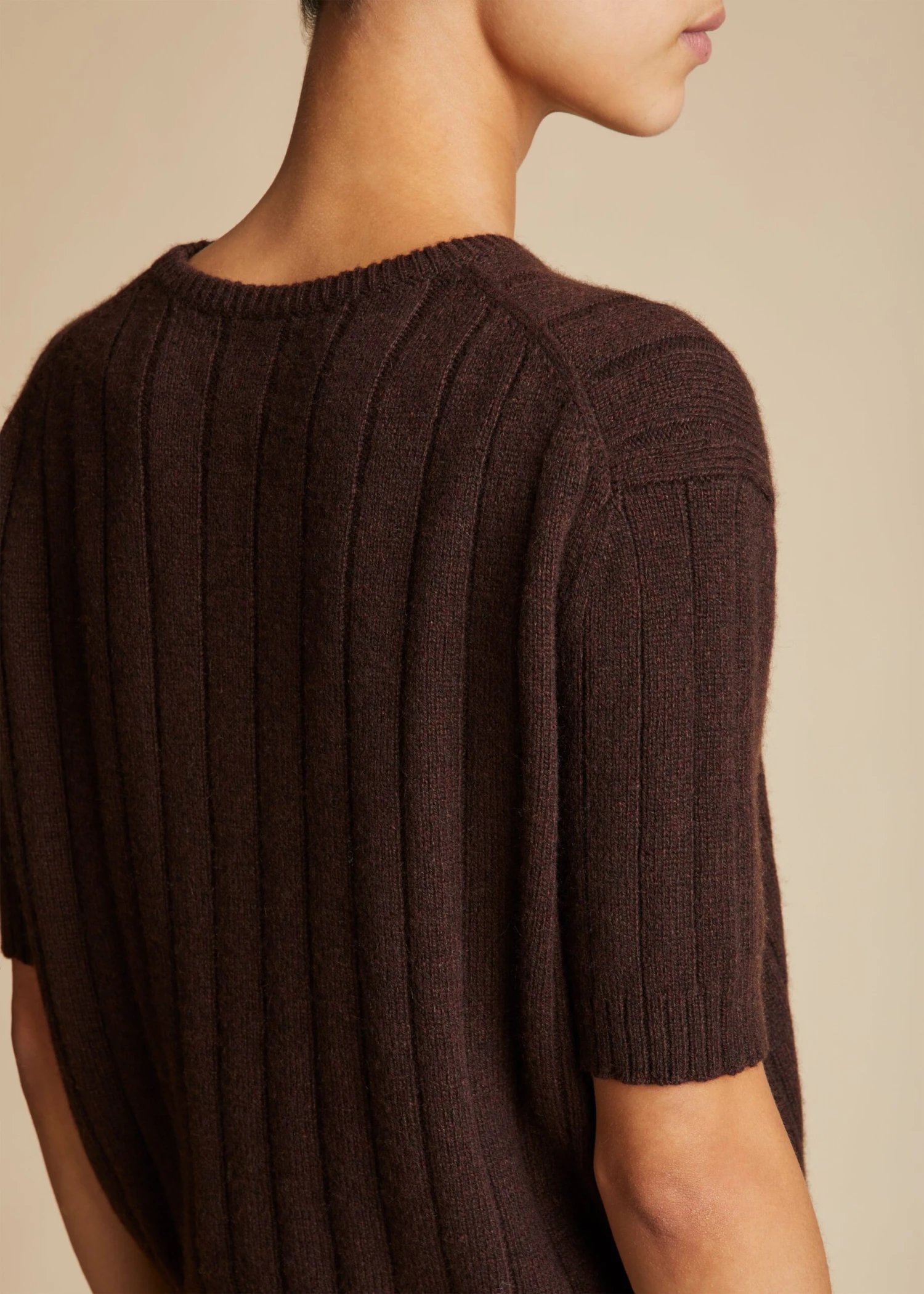 The Pre-Fall collection unfolds in spirited dialogue proposes a wardrobe that is both singular and universal through pieces like this short-sleeved crewneck pullover in luscious cashmere distinguished by its refined ribbing and exceptional softness. Finely ribbed trim accentuates the cropped silhouette.