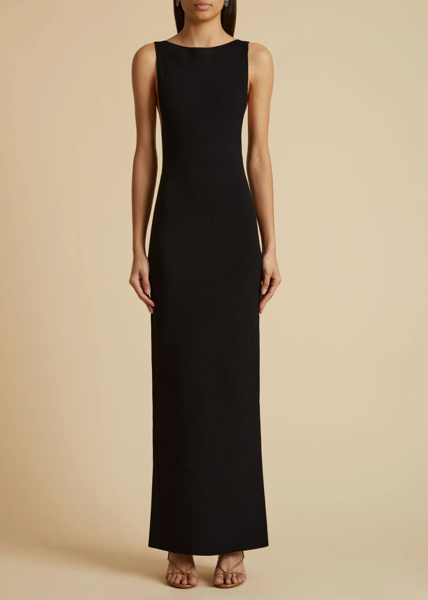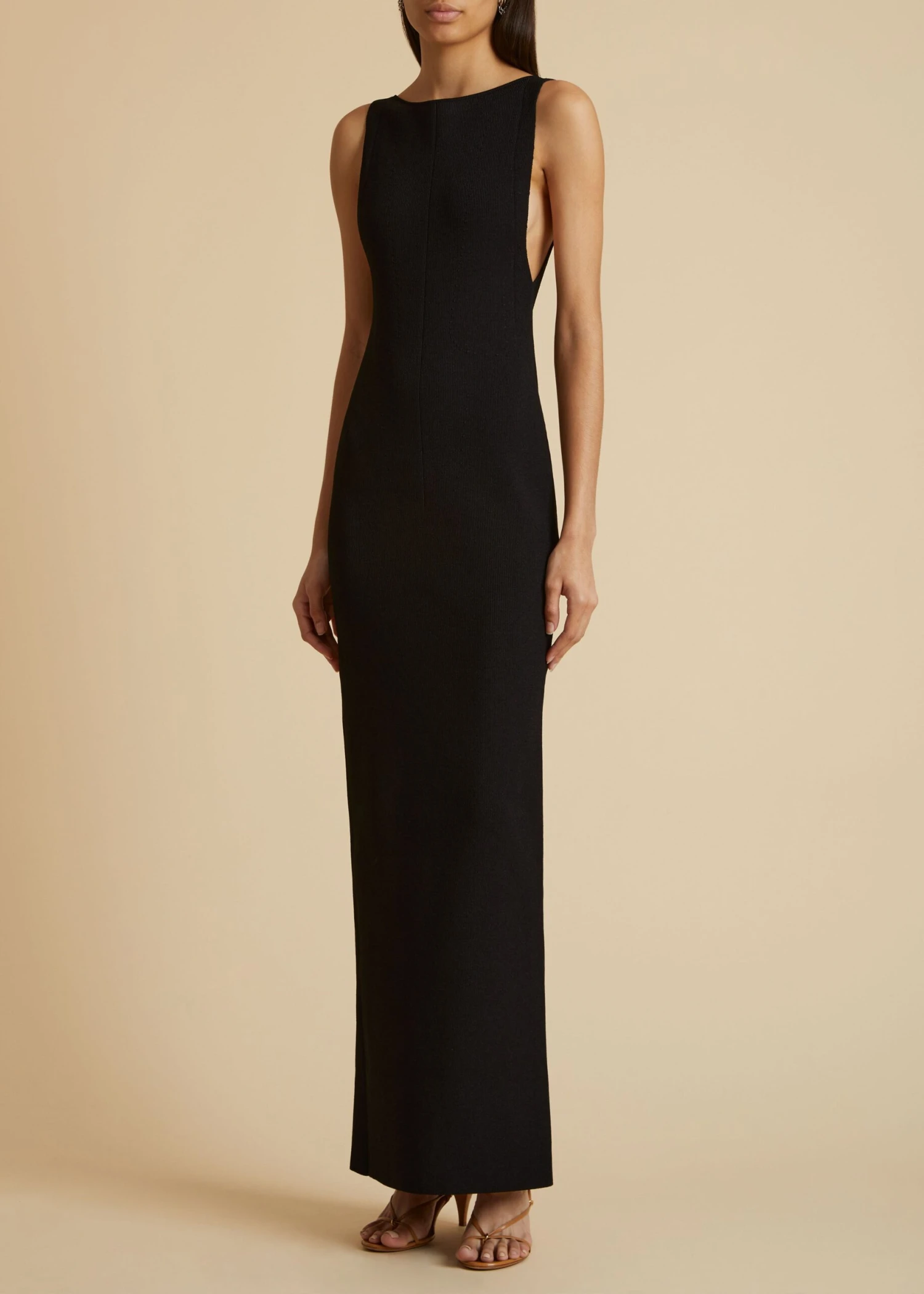 A sleek, sculpted knit dress framed by a bateau neckline and elongated armholes. Designed to hit at the ankle, with a notched back. Slips on.