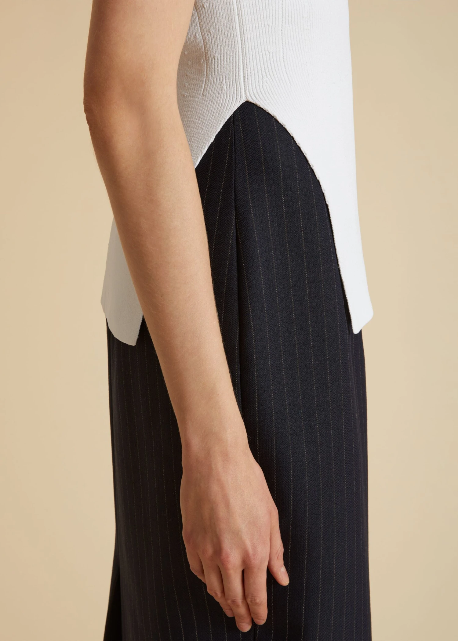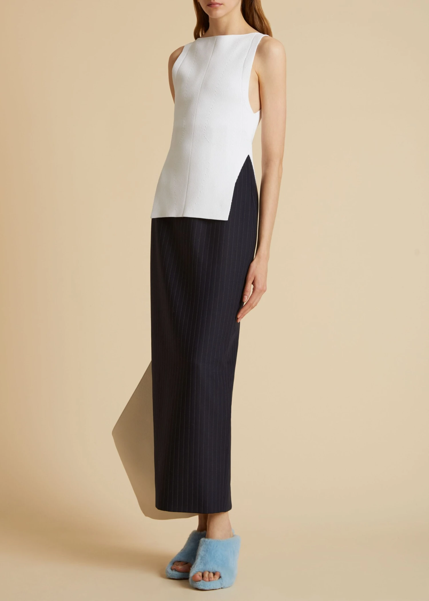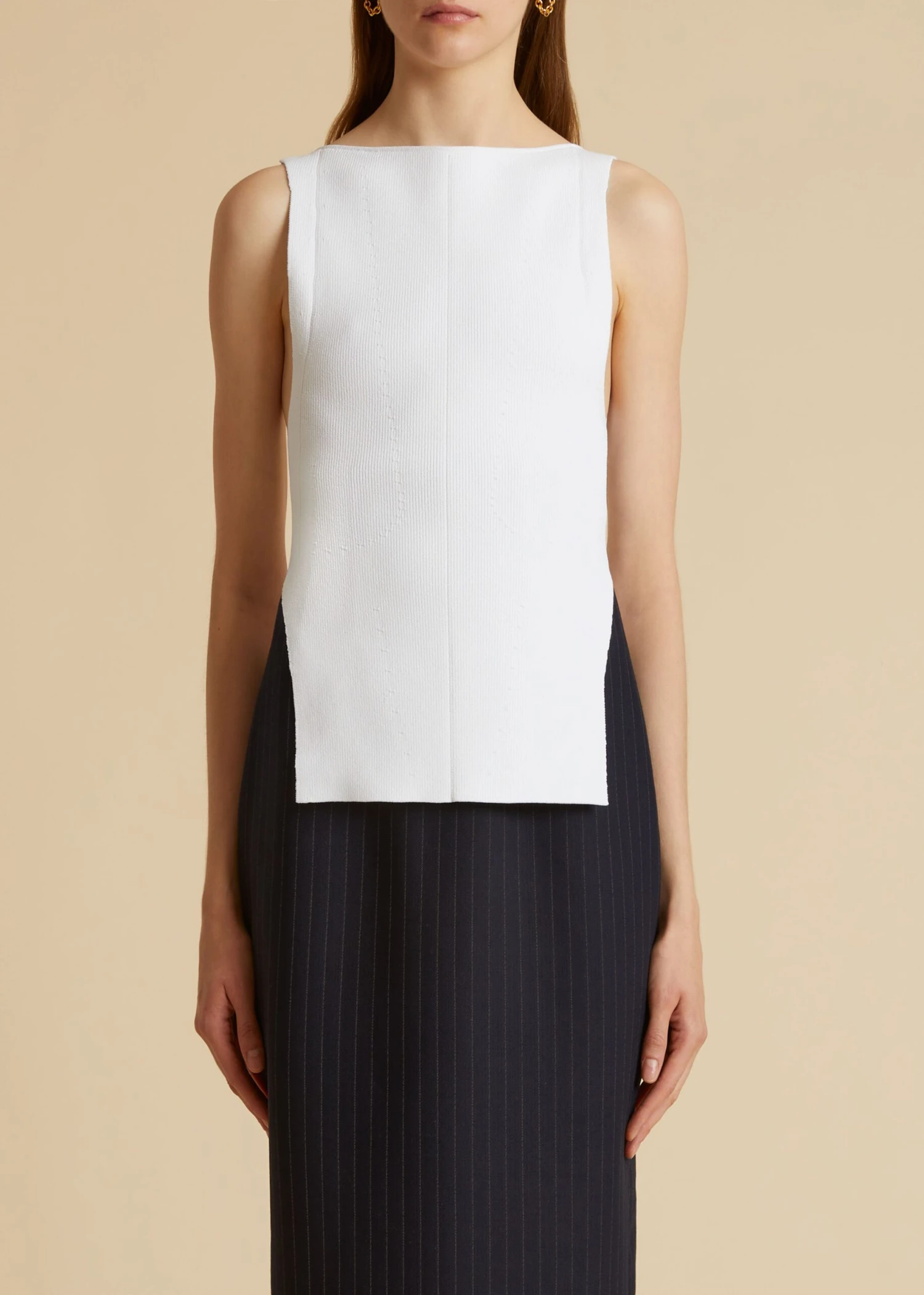 A sleek, sculpted knit top framed by a bateau neckline and elongated armholes. Deep side slits accentuate its vertical lines. Slips on.