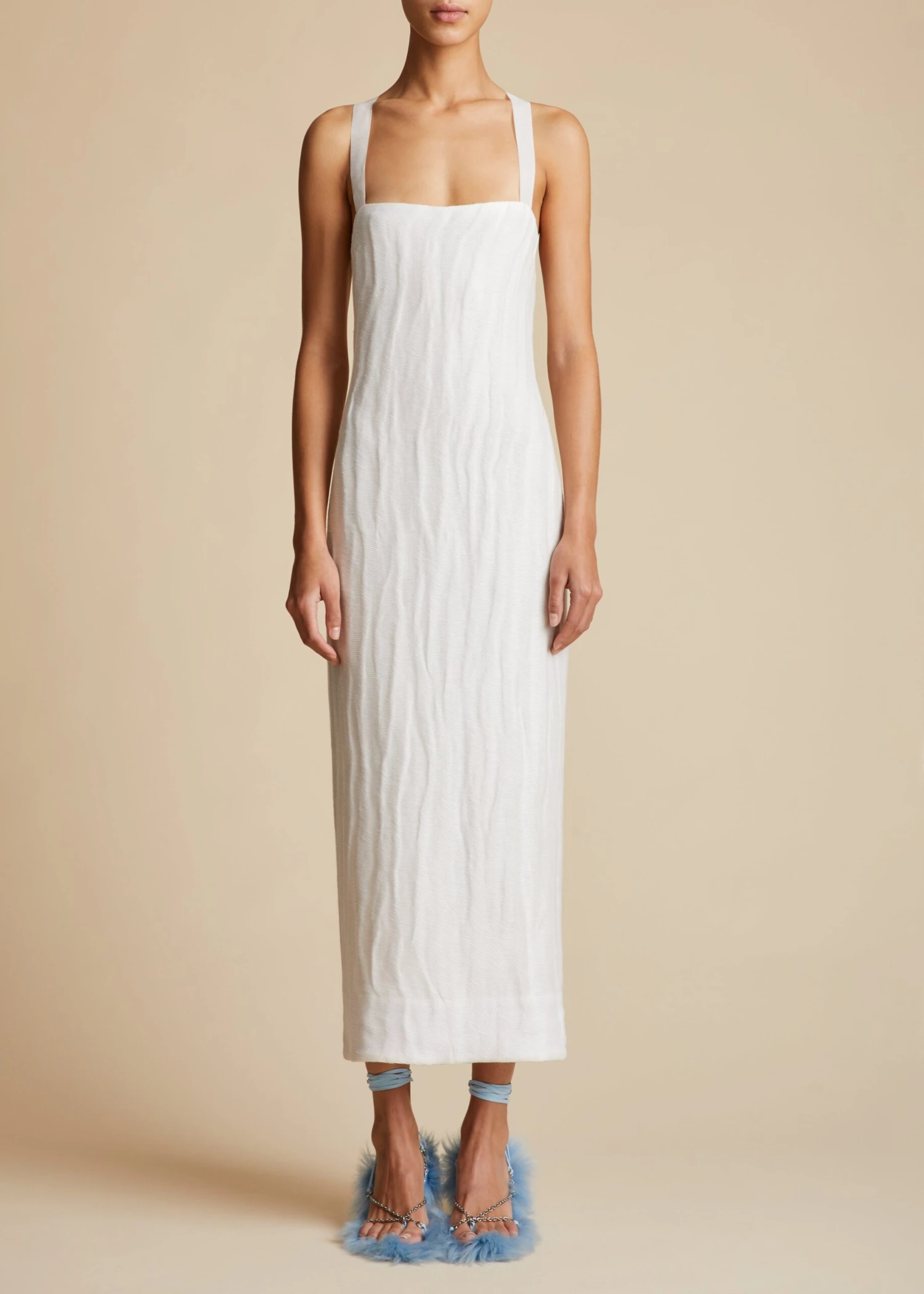 The Pre-Fall collection’s intensified silhouettes, heightened tactility, and decisive yet playful details come together in this apron-inspired dress in a softly crinkled blend of linen and silk. The bias-cut front is paired with a seamed, high-vented back, where the smooth crepe de chine straps cross. A concealed side zipper ensures a smooth fit.