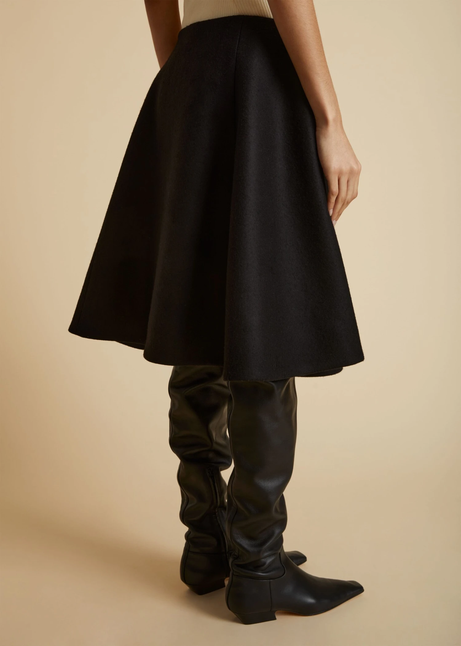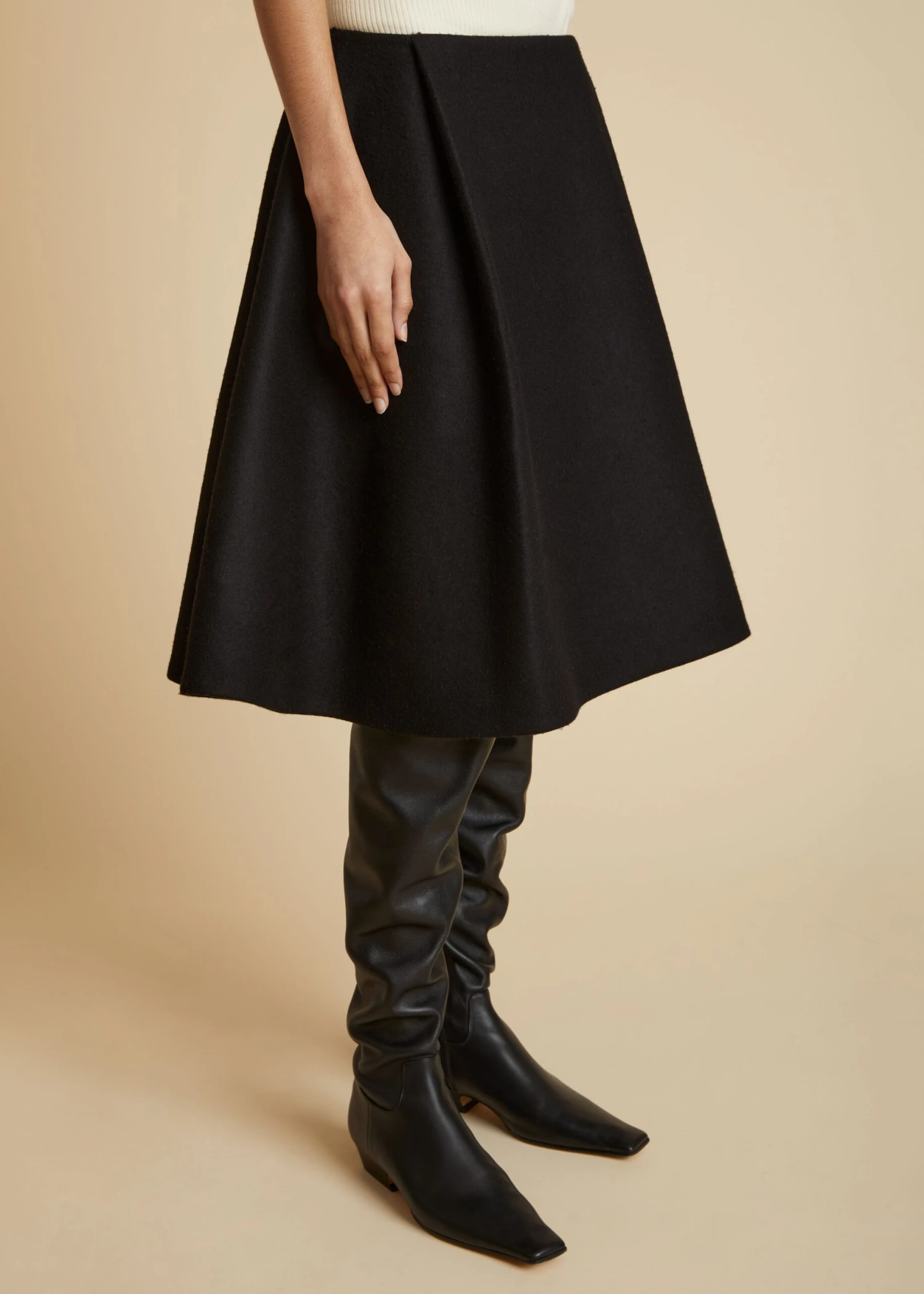 An A-line skirt shaped by front pleats and princess seams for a distinctive flounce. With cupro twill lining and a concealed zipper closure at back.