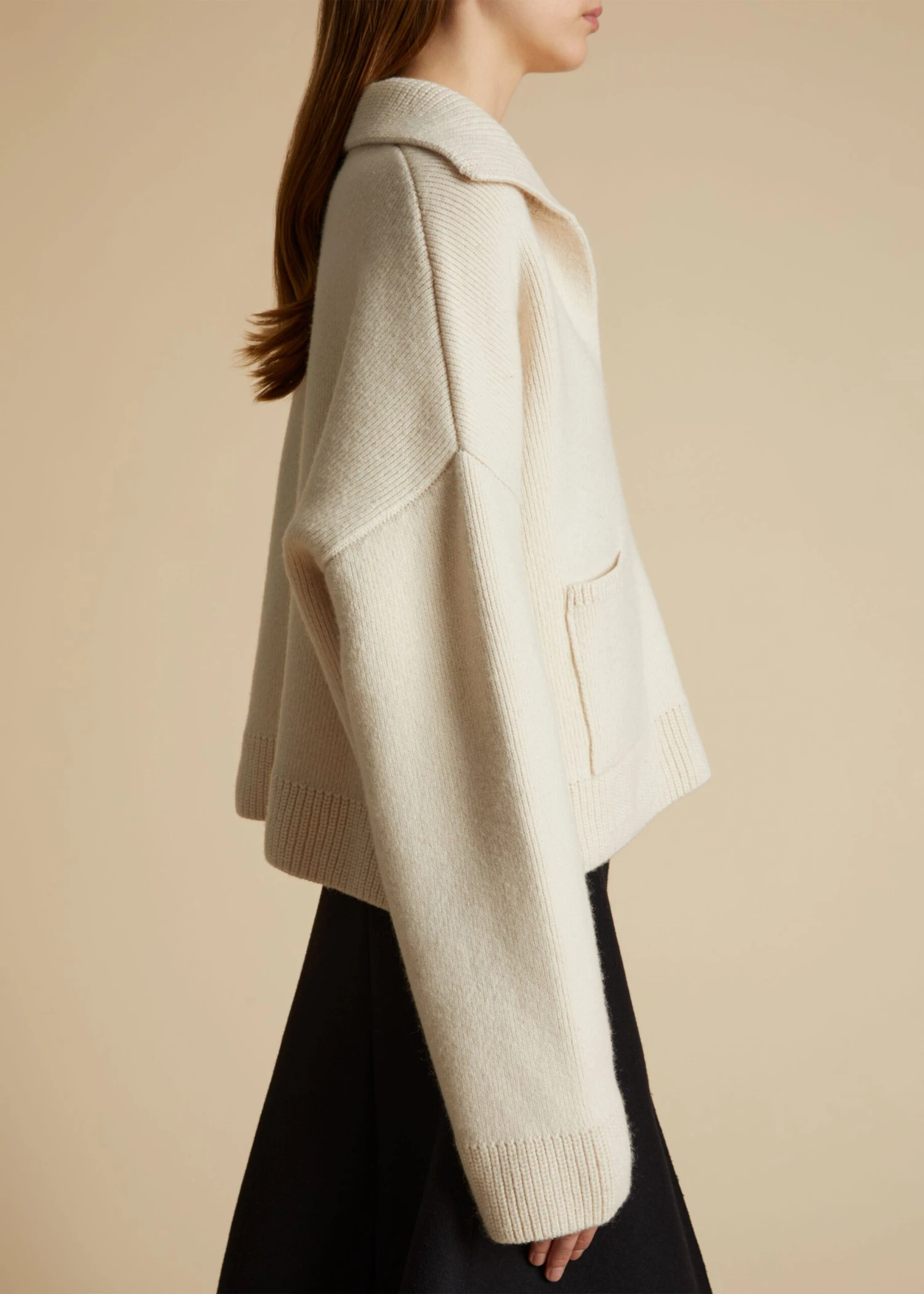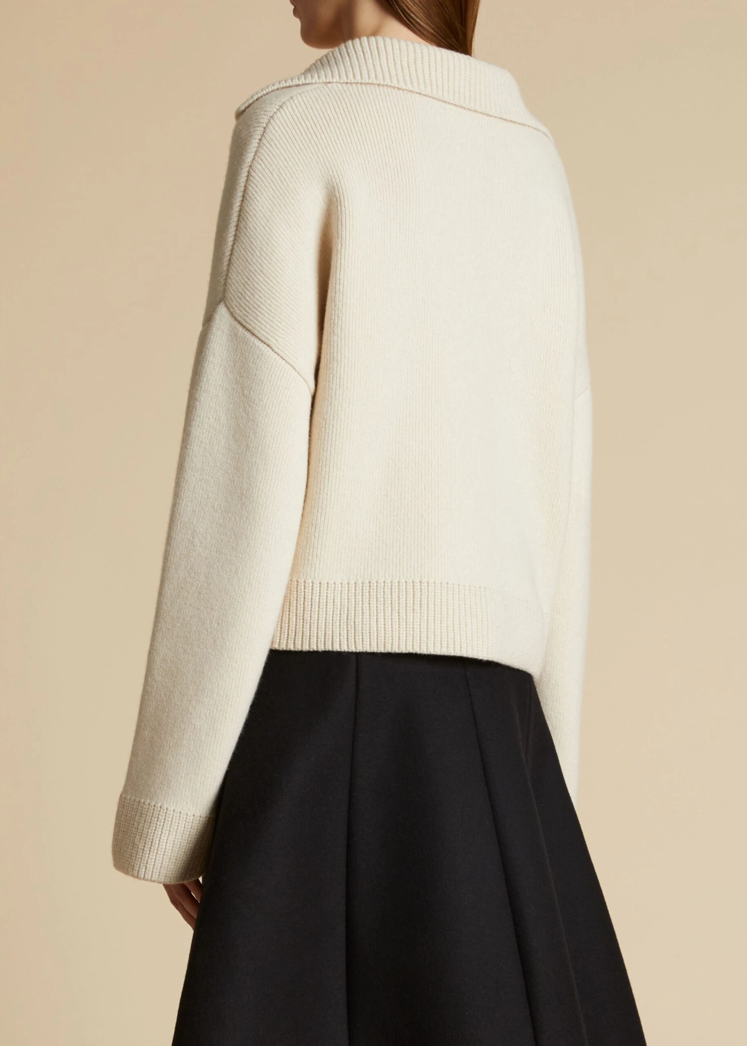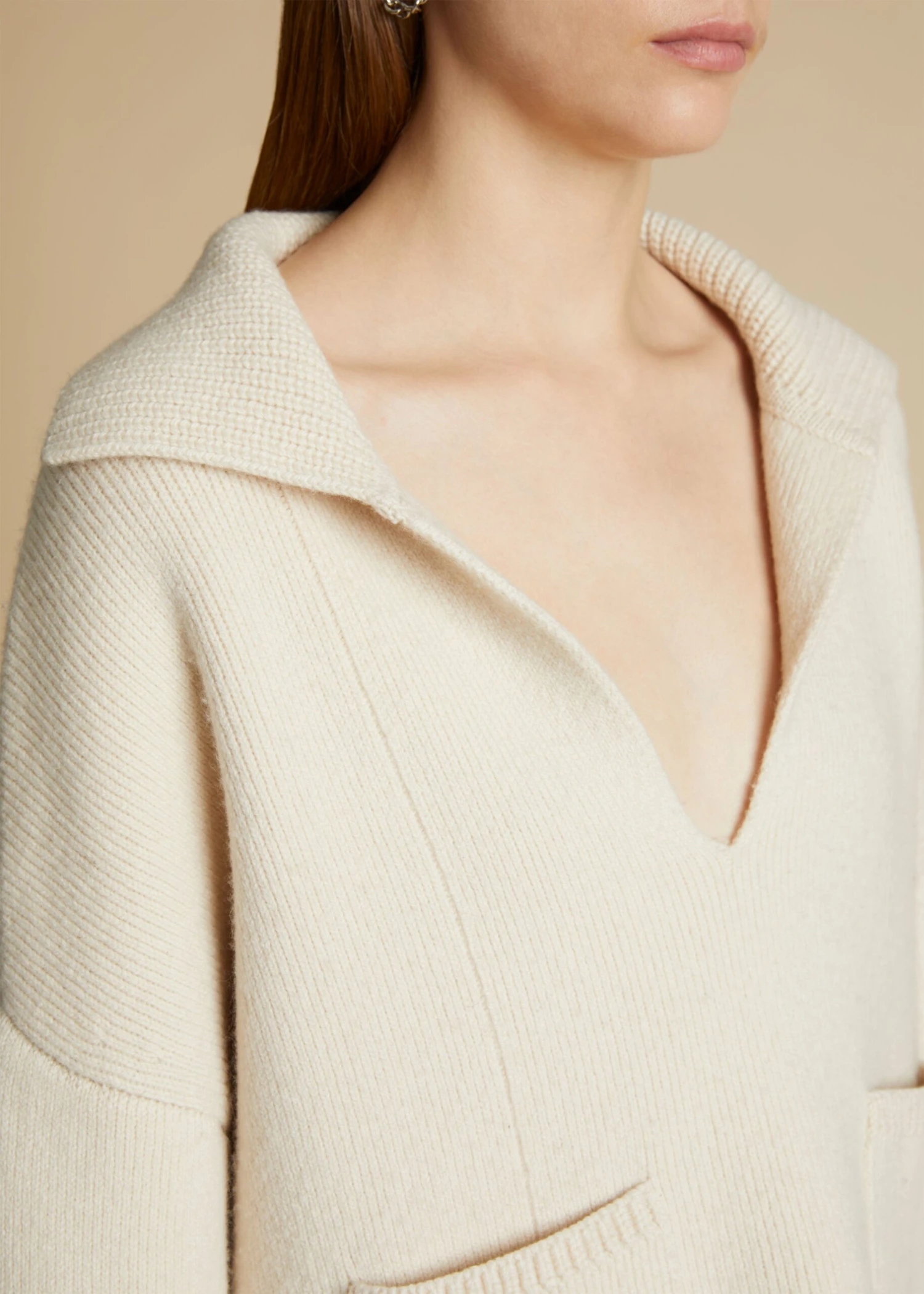Pre-Fall’s elongated and intensified silhouettes, heightened tactility, and decisive yet playful details come together in this luscious cashmere pullover. Framed by a broad collar and a deep v-neck, it is relaxed by dropped shoulder seams and wide sleeves, enhancing the swingy silhouette. Finishing touches include patch pockets and ribbed trim.