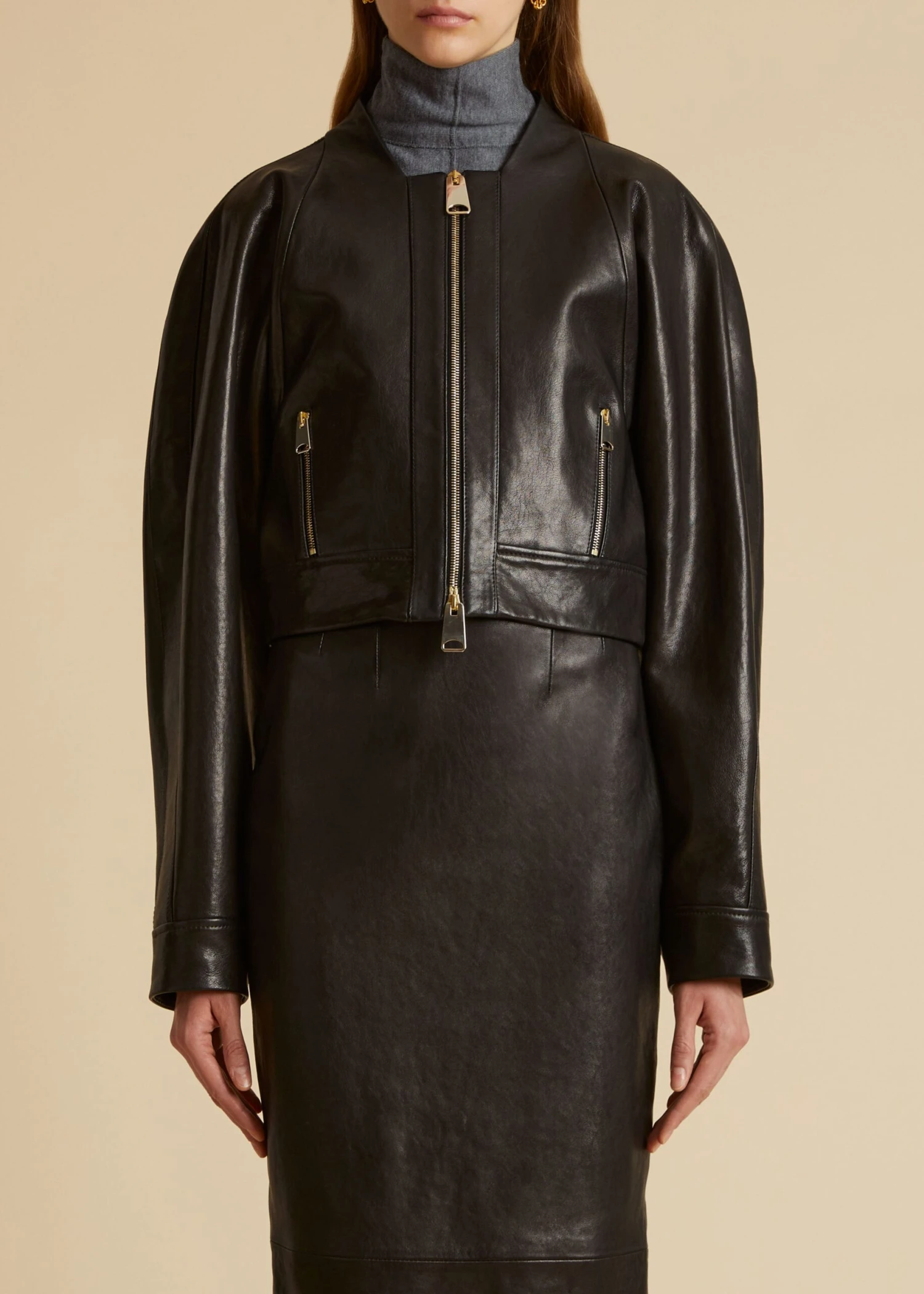 A cropped, raglan-sleeved lambskin jacket traced in boldly scaled zippers. The neckline is an angular foil for the wide, curved sleeves.