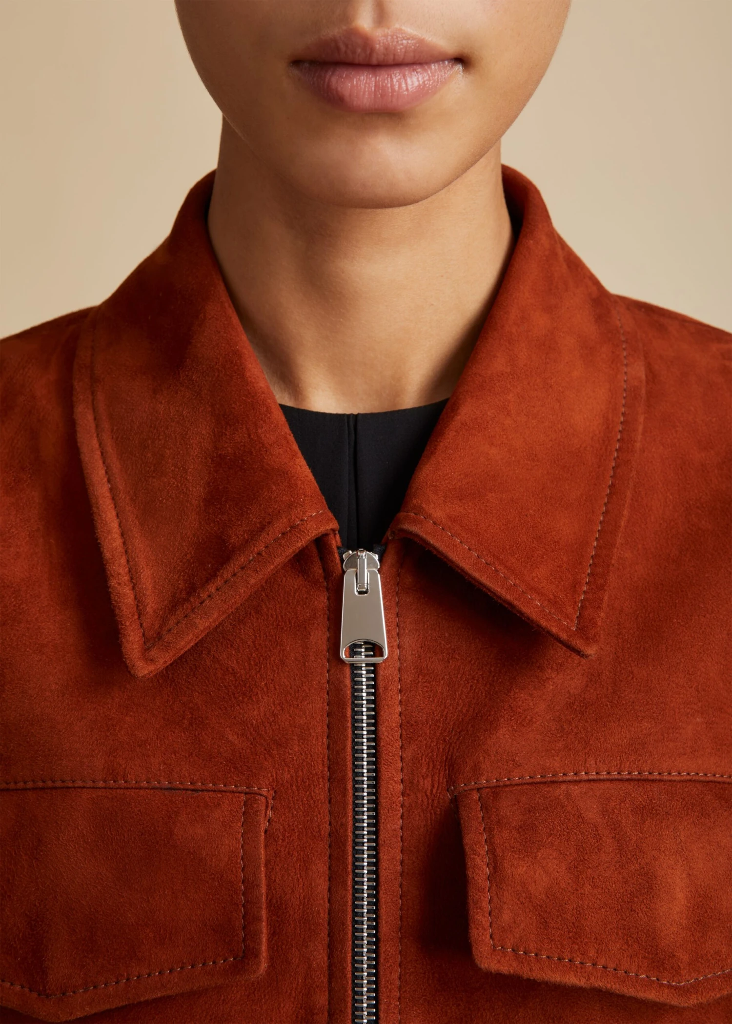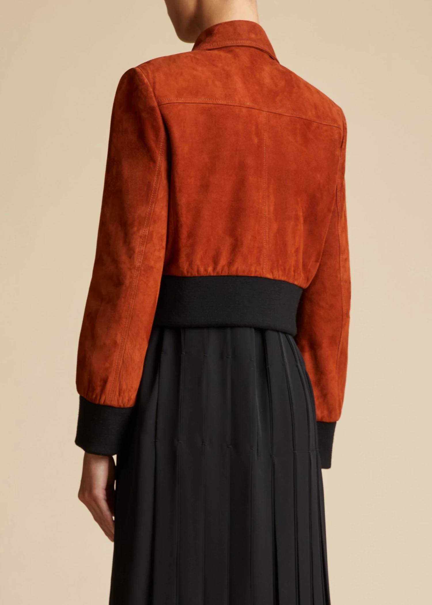 Part of Pre-Fall’s wardrobe of intuition, this full-grain suede jacket is a cropped foil to the collection’s elongated and intensified silhouettes. The collared silhouette is contoured by broad, rib-knit contrast panels at the hem and bracelet-length sleeves. Finishing touches include flap pockets at the chest, a two-way zipper with signature chrome hardware, and a lining of silky cupro twill.