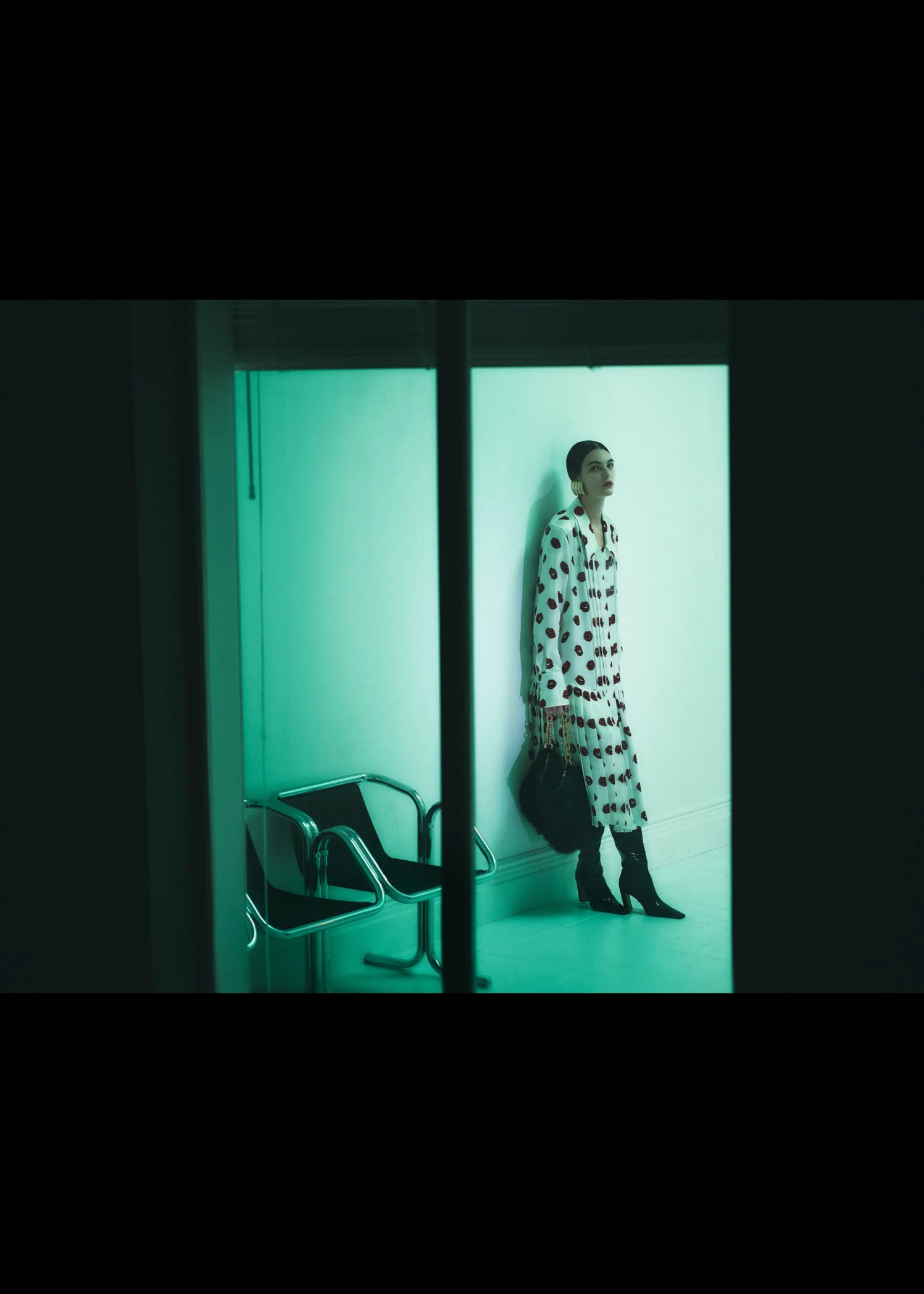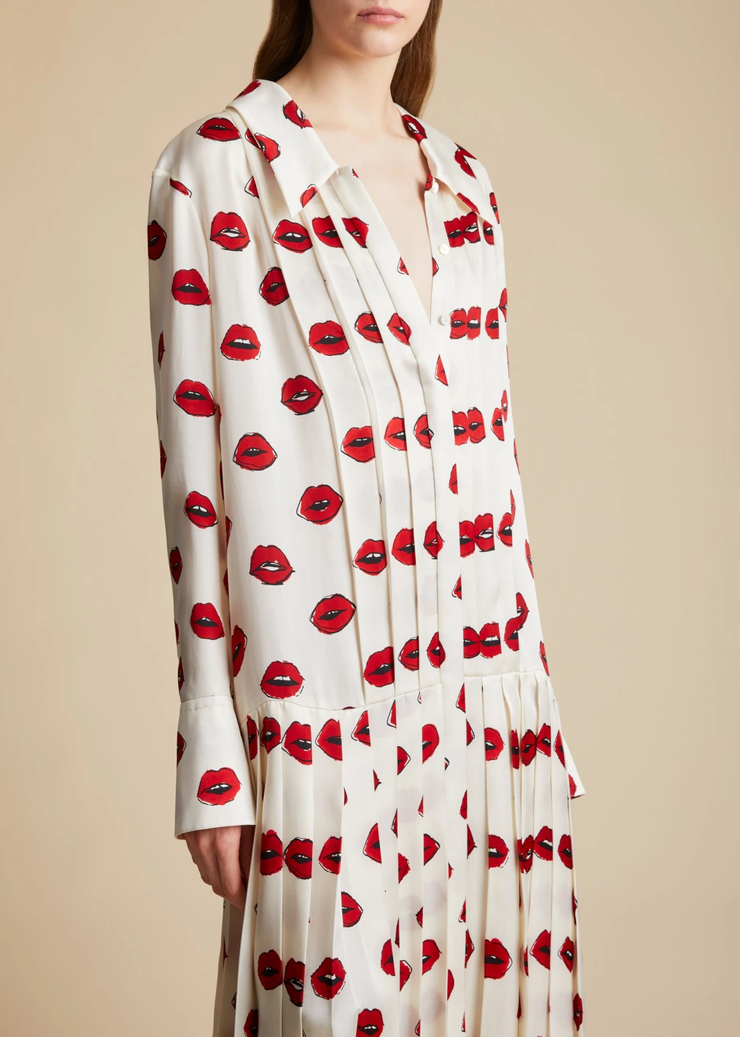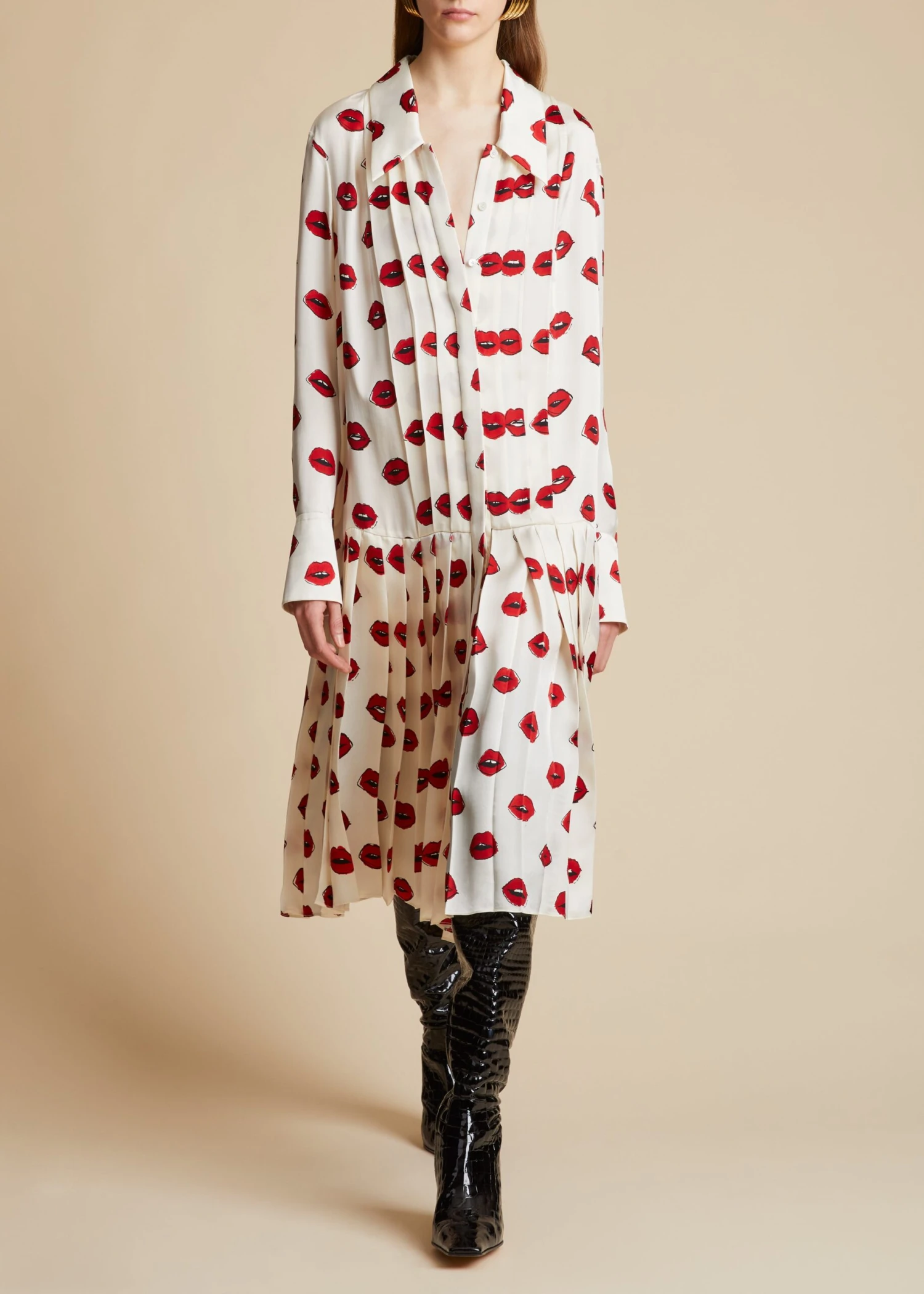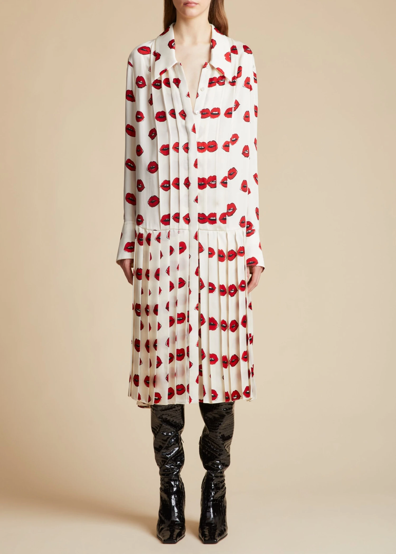 Adding a lively charm to the Pre-Fall collection is the custom print of hand-painted lips that makes this knife-pleated shirtdress unmistakably KHAITE. The drop-waisted, button-front silhouette gains a full-bodied bounce from washed cupro twill. It is refined by pleats that are stitched at the top for endurance. The heightened scale of the collar is echoed in elongated, single-button cuffs.
