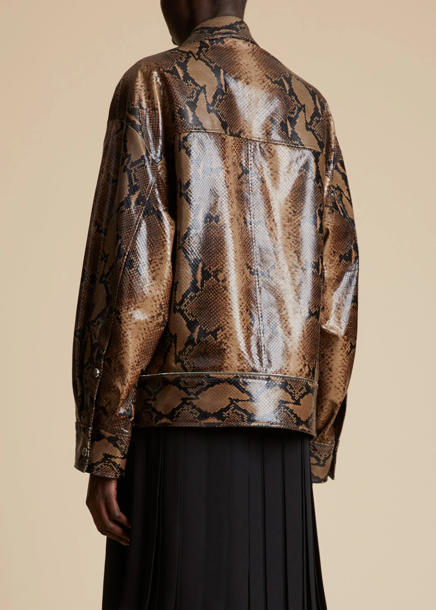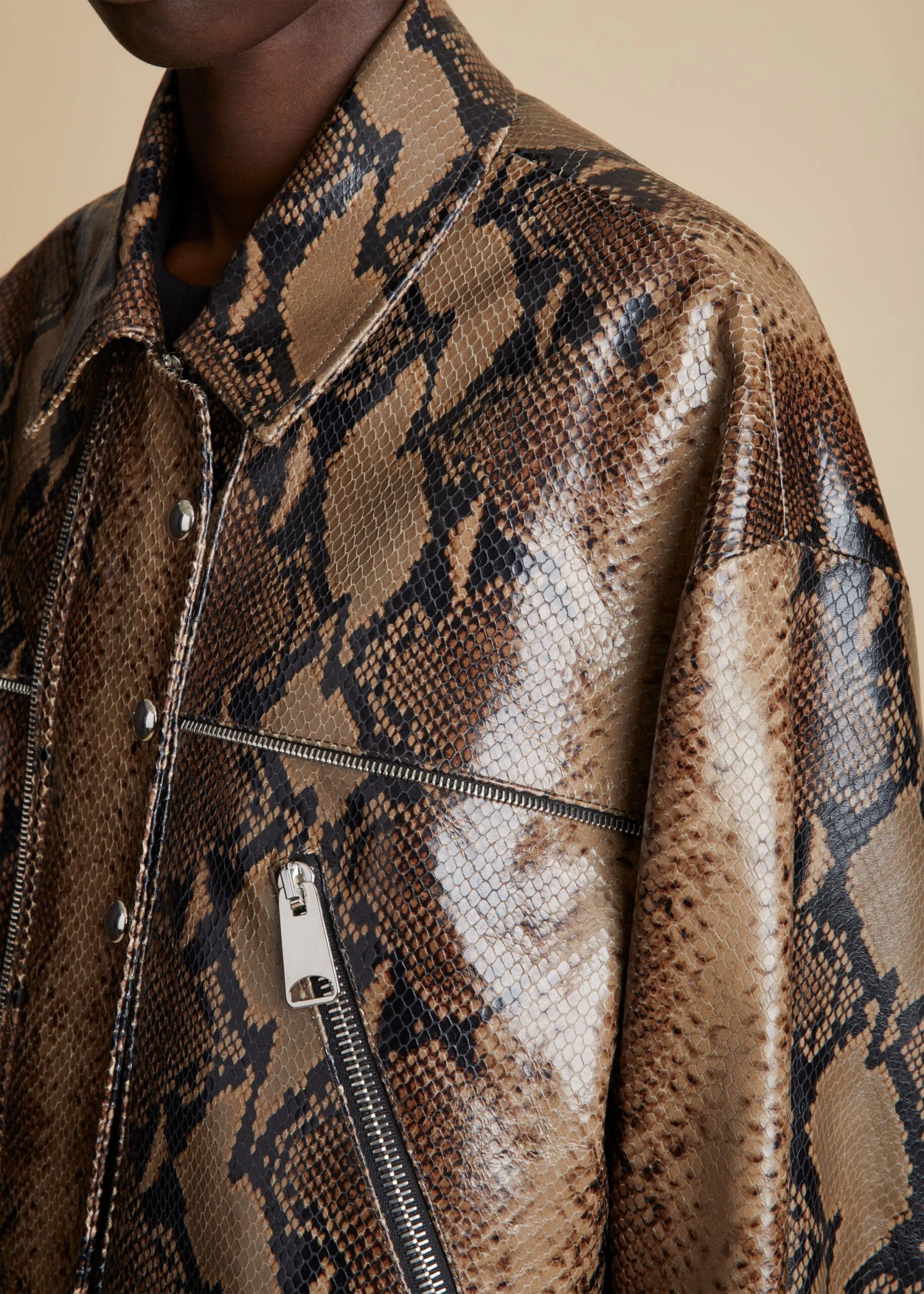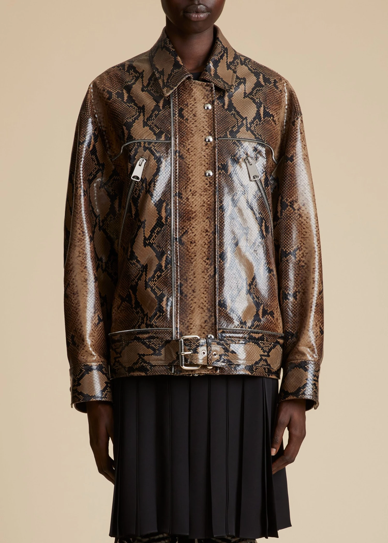 Pre-Fall’s intensified silhouettes, heightened tactility, and decisive yet playful details come together in this luminous leather jacket. Embossed with graphic python scales, it is eased by dropped shoulder seams and wide, rounded sleeves that taper to single-button cuffs. Angled zippers are in dialogue with zipper trim, press-stud closures of gleaming chrome, and an integrated belt.