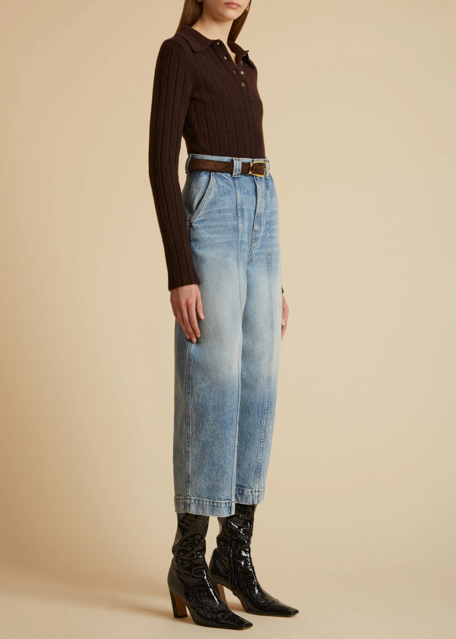 Enlivened by curved legs that taper to a cropped hem, this high-rise style reimagines traditional five-pocket denim with central seaming that extends from the belt loops at front and the patch pockets at back. Each hand-finished pair has an engraved button of antiqued nickel.