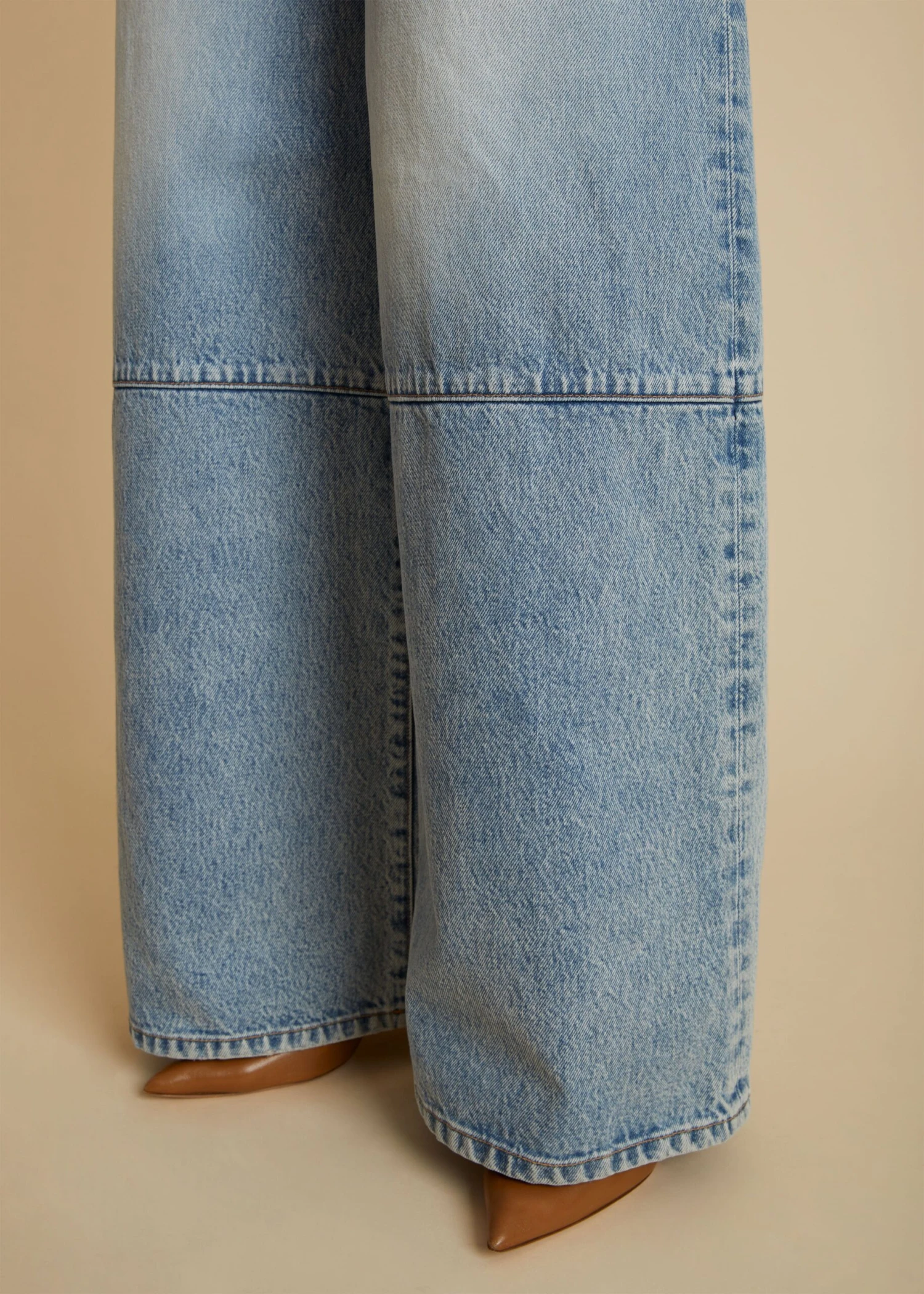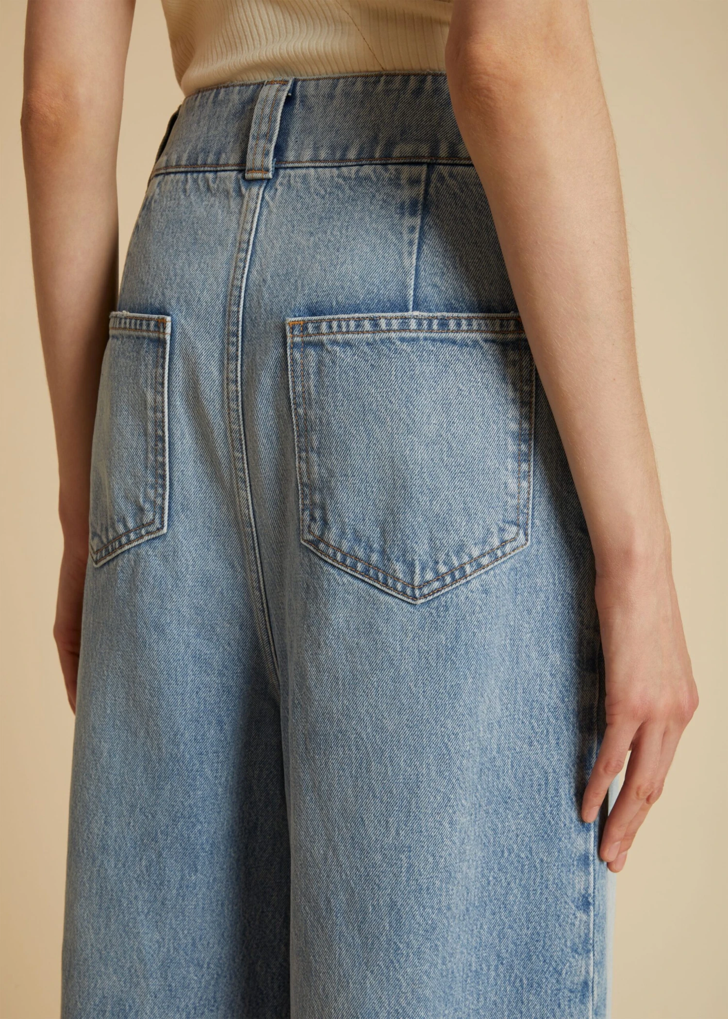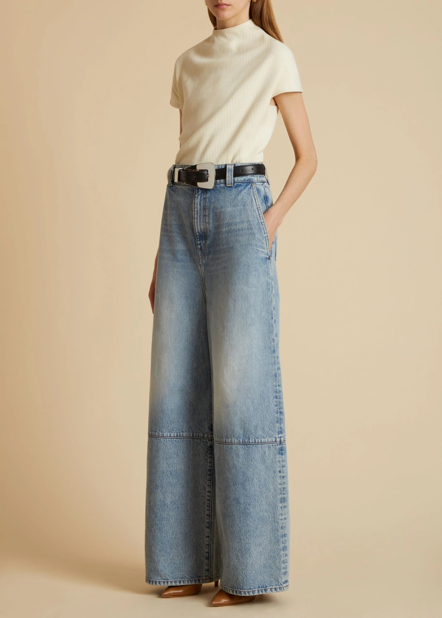 With a boldly scaled waistband, this high-rise style combines the elegance of a full-length trouser with the robust texture of denim.