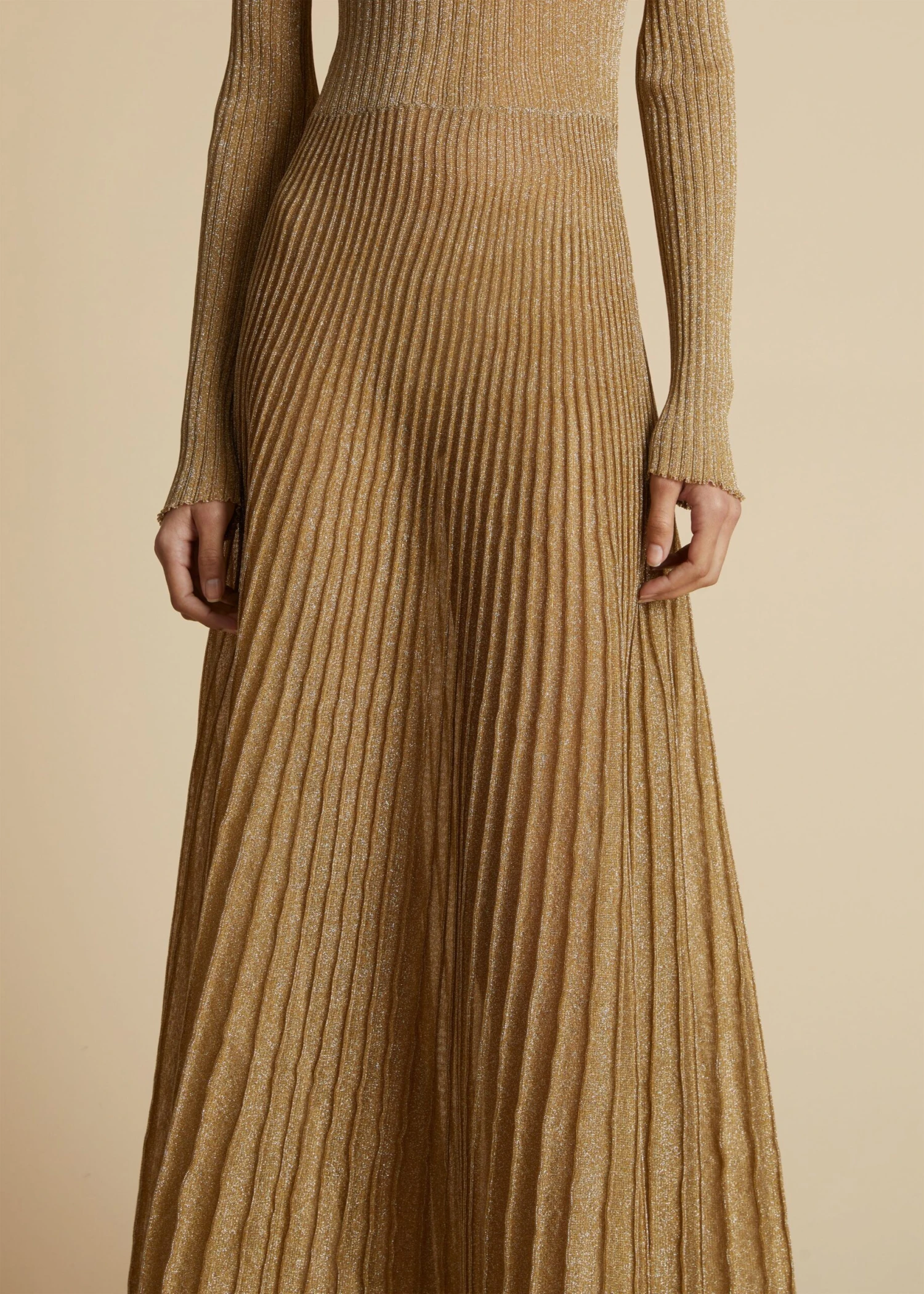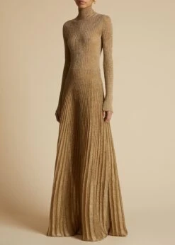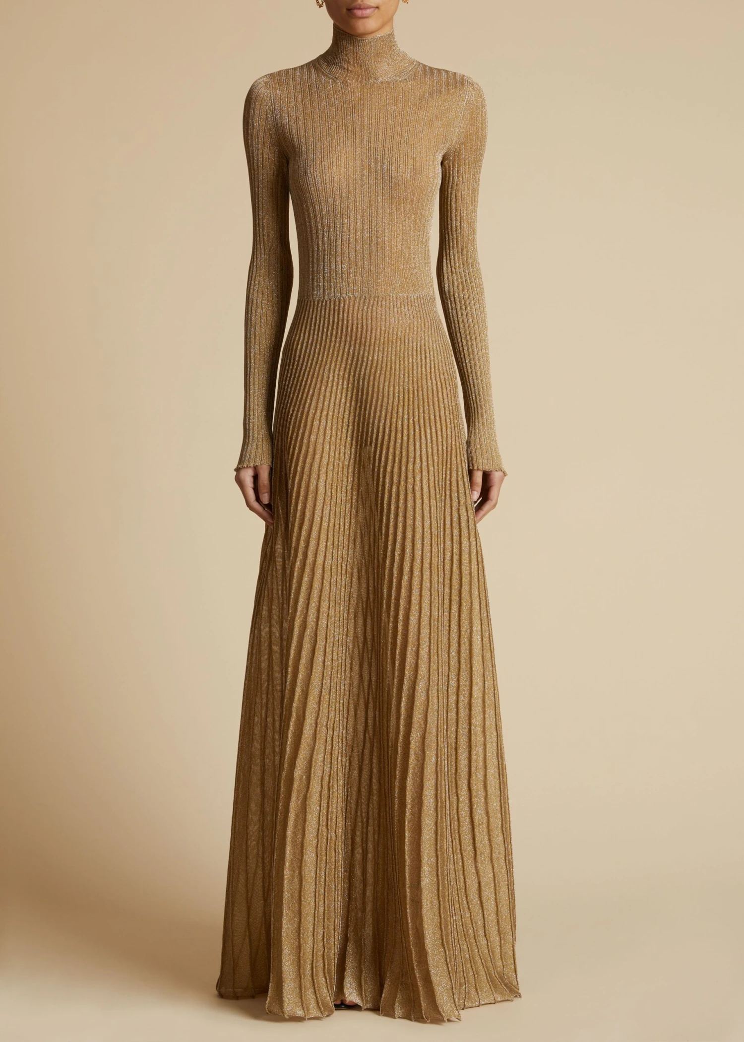 The Pre-Fall collection’s elongated and intensified silhouettes, heightened tactility, and decisive yet playful details come together in this luminous knit dress. Yarns that gleam like precious metals gain further dimension through sleek ribbing that transforms into fine pleats as it flares into a floor-length skirt. Free closures, it slips on for a smooth fit.