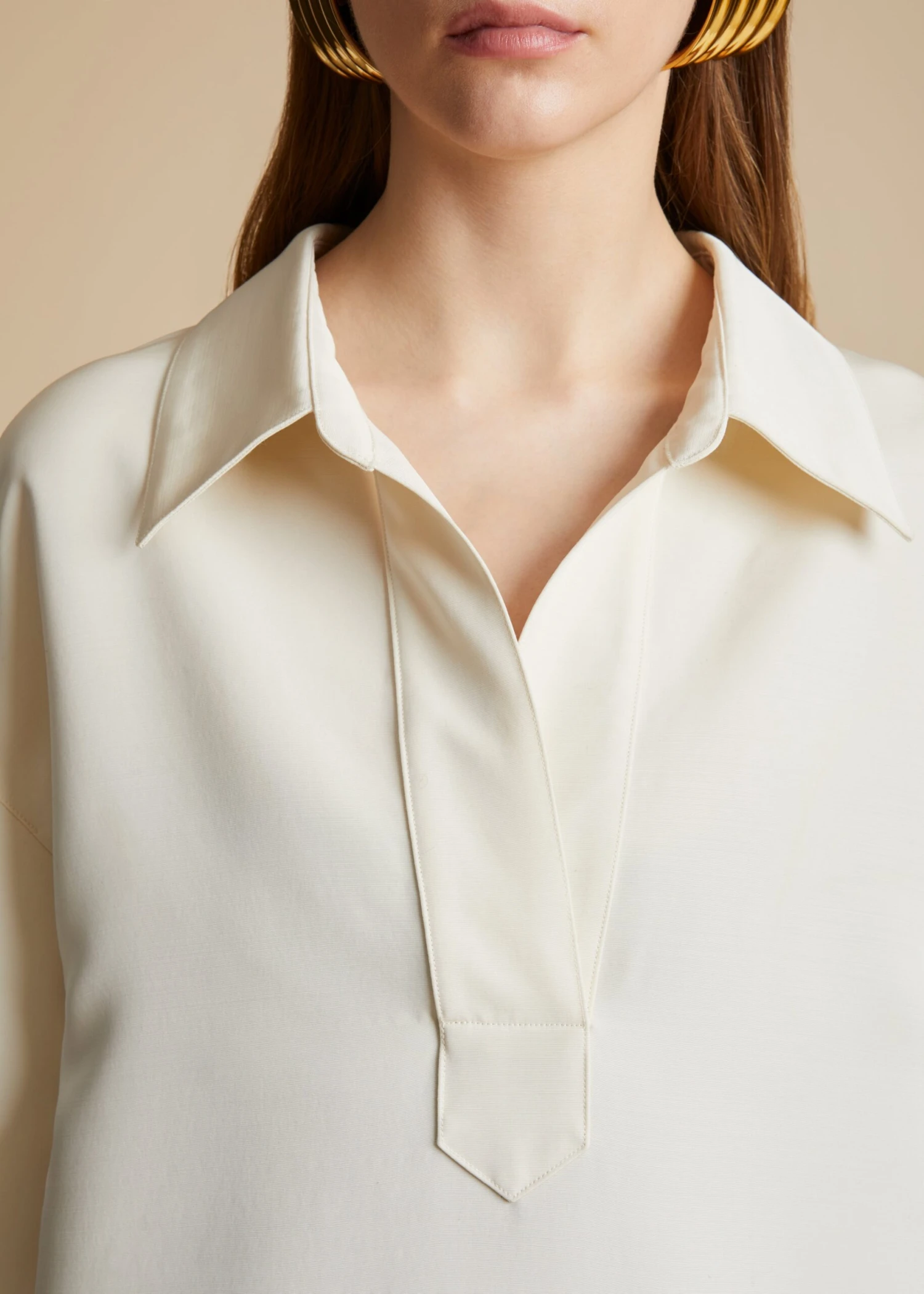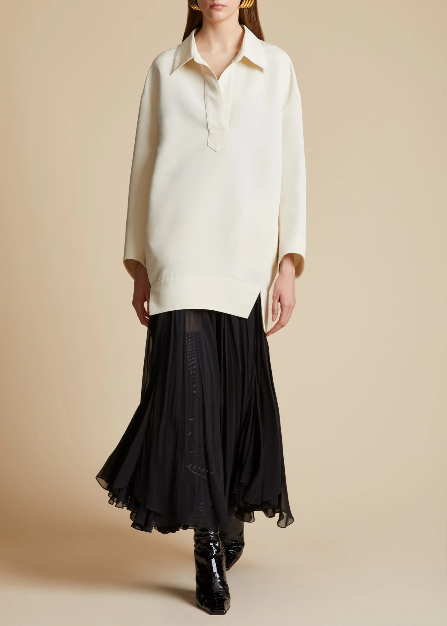 Through elongated and intensified silhouettes like this reimagined shirtdress, the Pre-Fall collection proposes a wardrobe of intuition. Tailored in a faille-like blend of woven viscose and wool selected for its full-bodied look and crisp, clean finish, the collared silhouette is relaxed by dropped shoulder seams and refined by a broad, button-free half placket. Rounded volumes, from the refined pagoda sleeves to the side-slit, high-low hem accentuate the swingy silhouette. Shown with the Lally dress (not included).