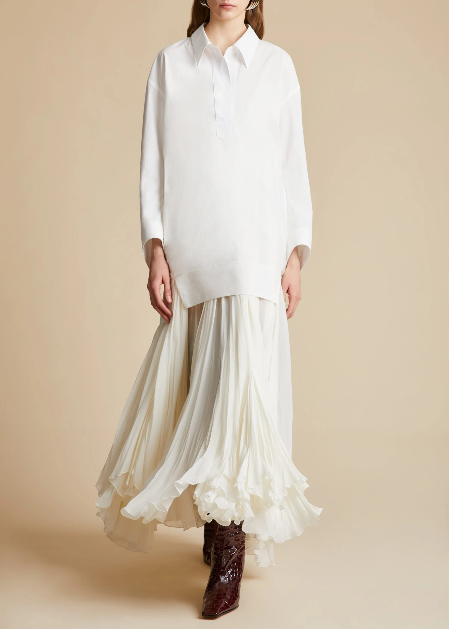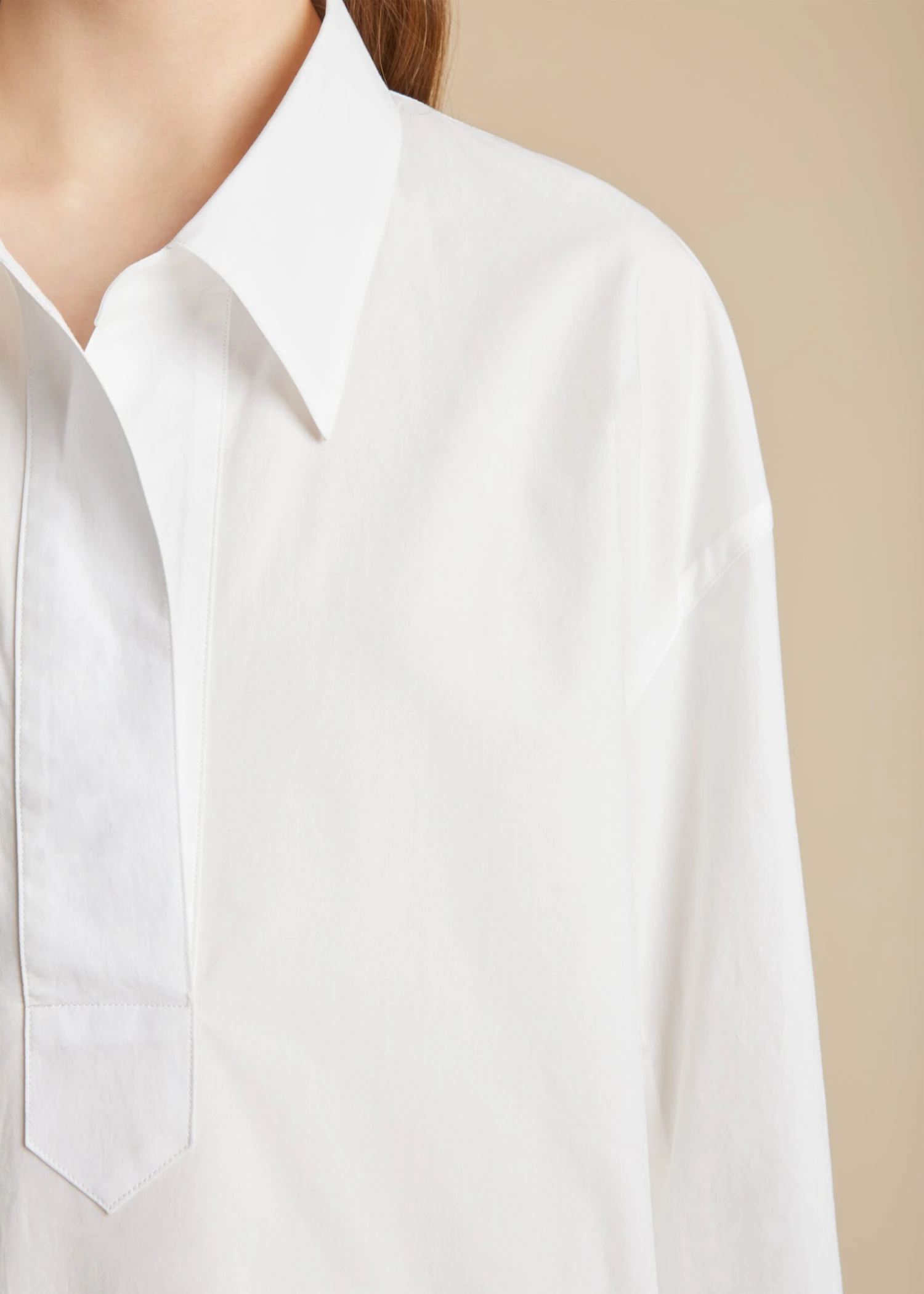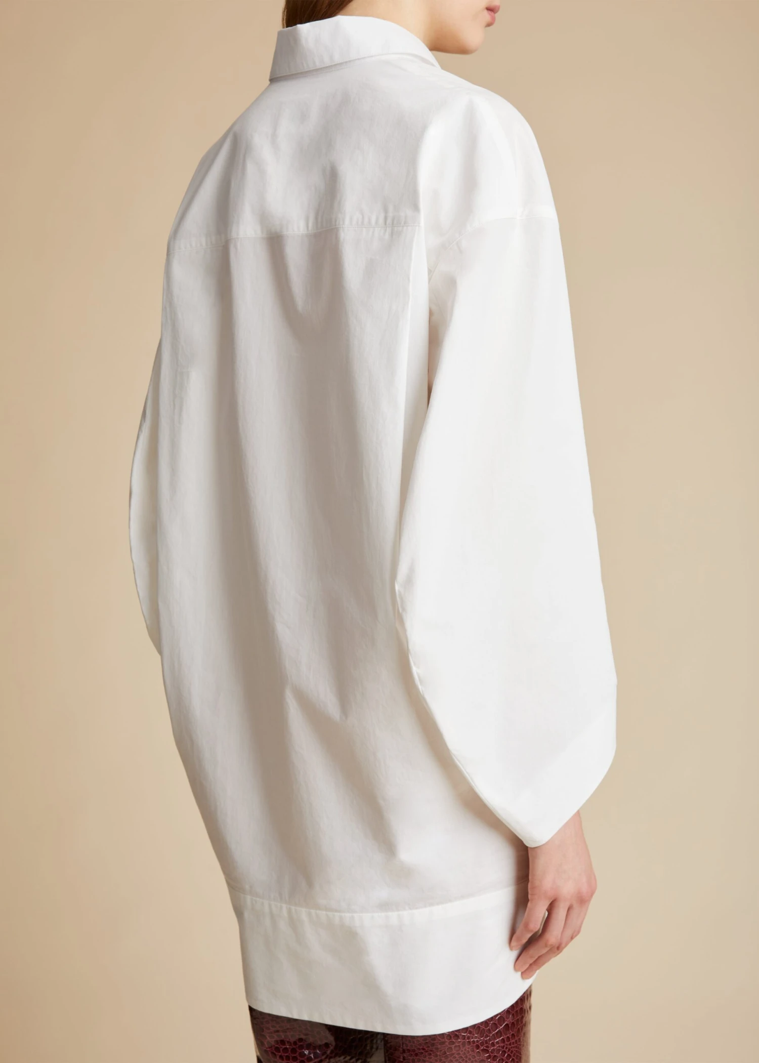 Through elongated and intensified silhouettes like this reimagined shirtdress, the Pre-Fall collection proposes a wardrobe of intuition. Tailored in Italian poplin that has been washed for added comfort, the collared silhouette is relaxed by dropped shoulder seams and refined by a broad, button-free half placket. Rounded volumes, from the refined pagoda sleeves to the side-slit, high-low hem accentuate the swingy silhouette. Shown with the Lally dress (not included).