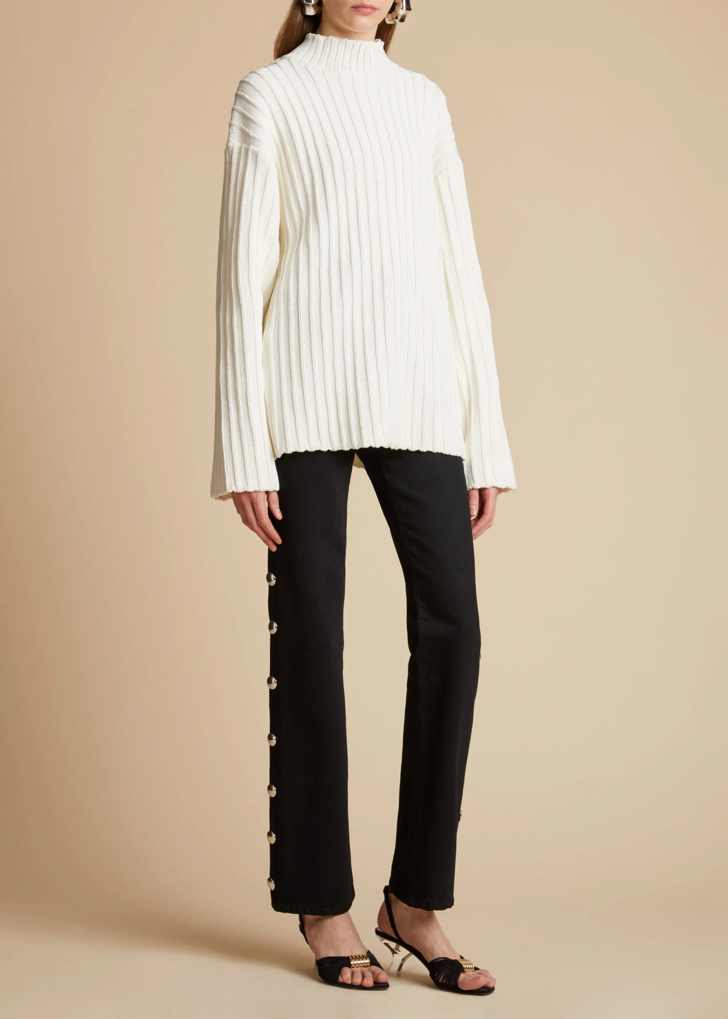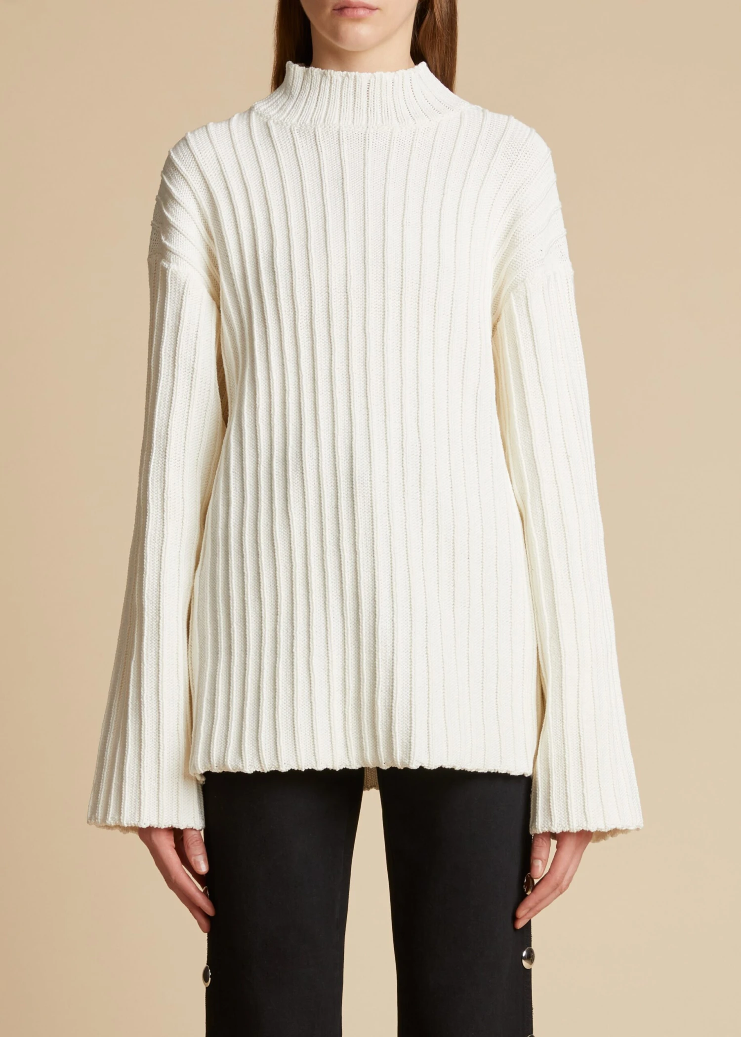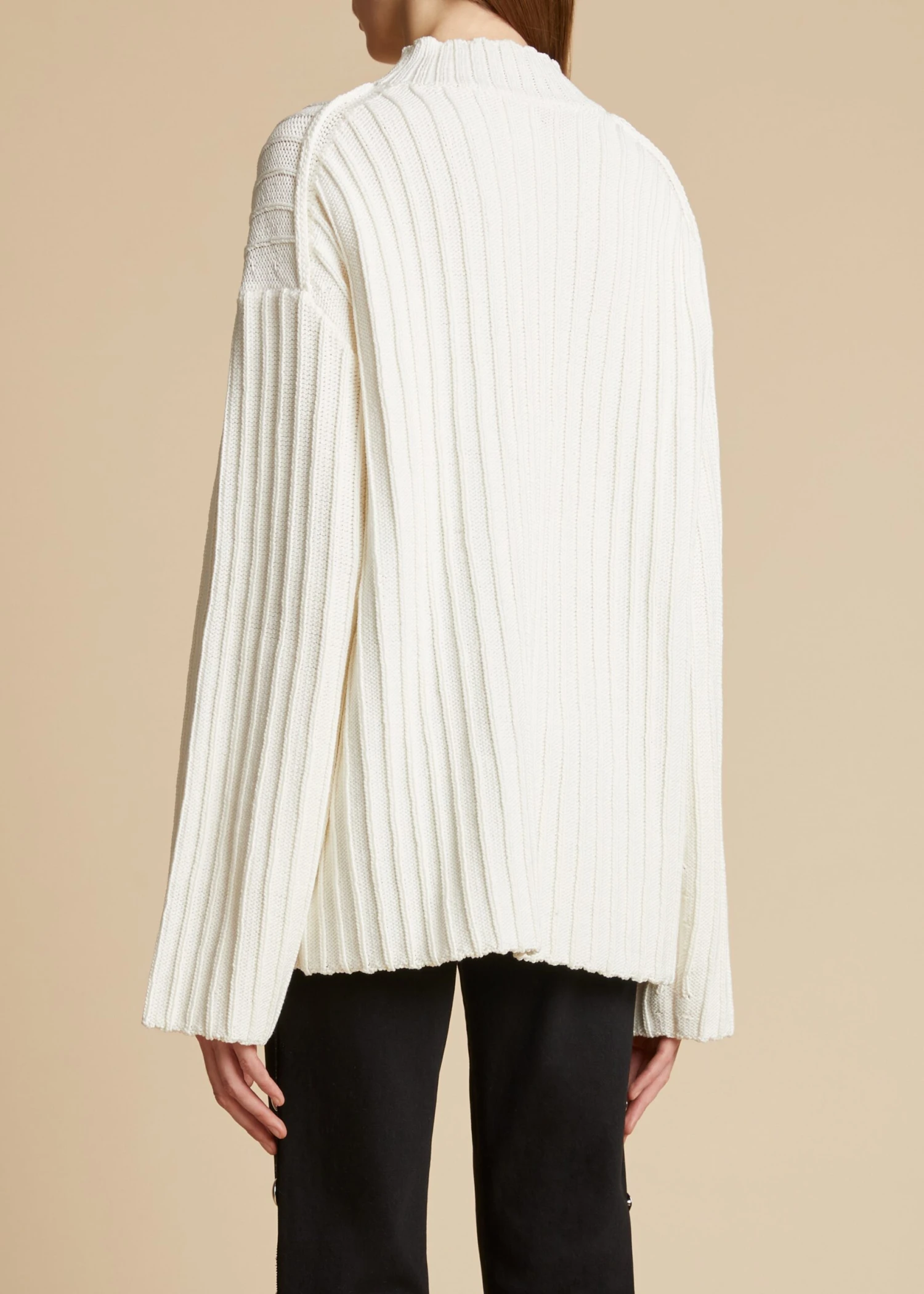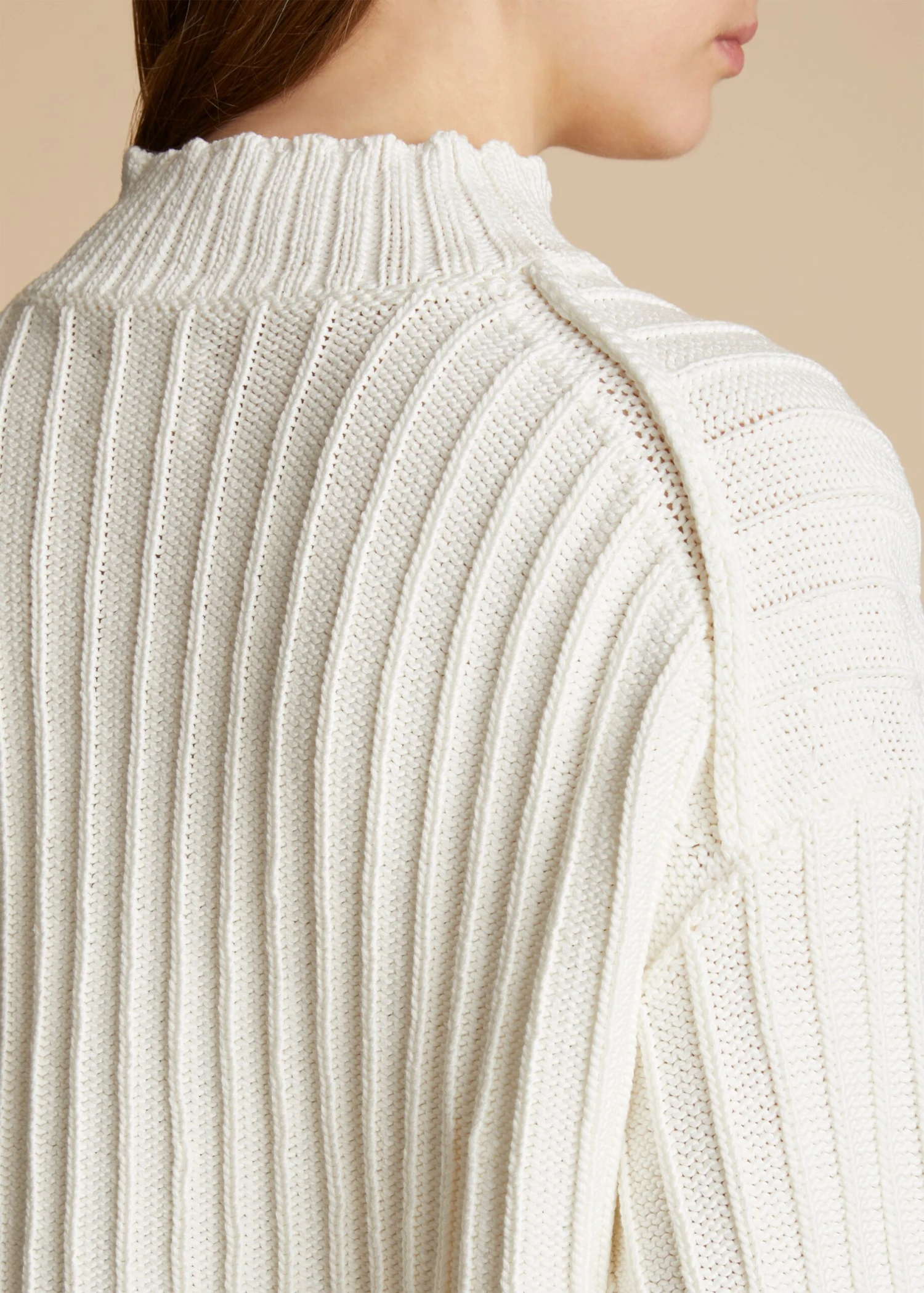 Part of the summer capsule. The knitwear of the Spring/Summer 2023 collection engages with concepts of animation and suspension to introduce mesmerizing surfaces developed in dialogue with the body. In a ’90s-inspired silhouette, this widely ribbed, stand-collar pullover in mercerized cotton is relaxed by dropped shoulder seams. A reverse linking detail at the back shoulder seam imparts added dimension.