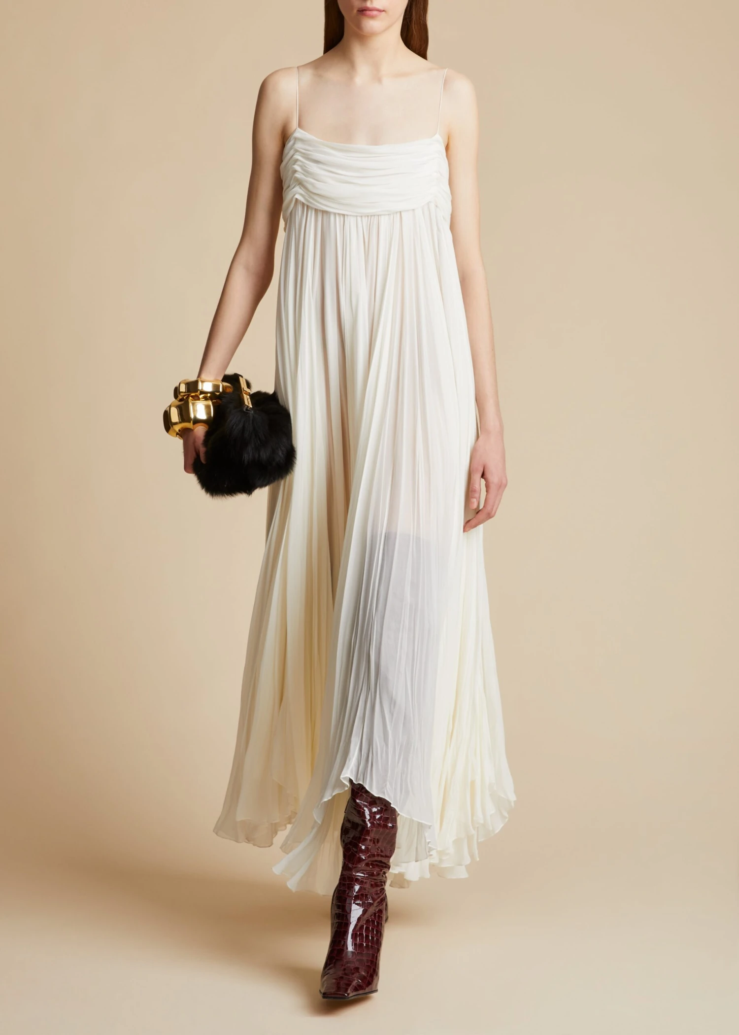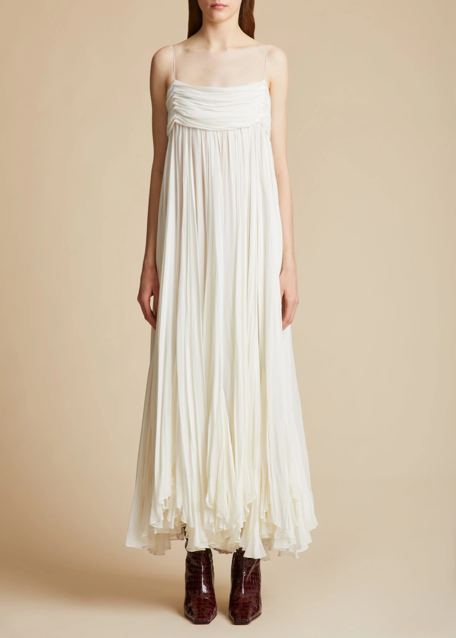 A Pre-Fall standout, this richly textured silk chiffon dress brings together the collection’s signatures: elongated and intensified silhouettes, heightened tactility, and decisive yet playful details. Suspended from delicate lingerie straps, the draped silhouette is one of intentional curves and dramatic movement, combining hand-crushed pleats with undulating hems animated by godets. A concealed zipper closure ensures a smooth fit.