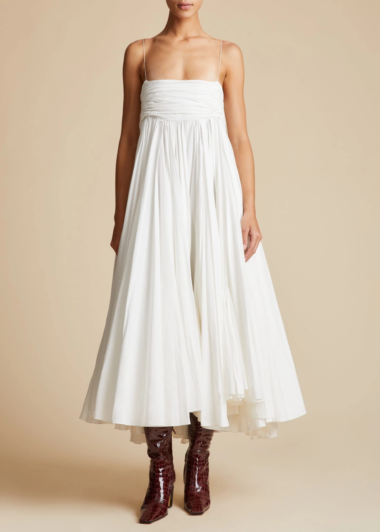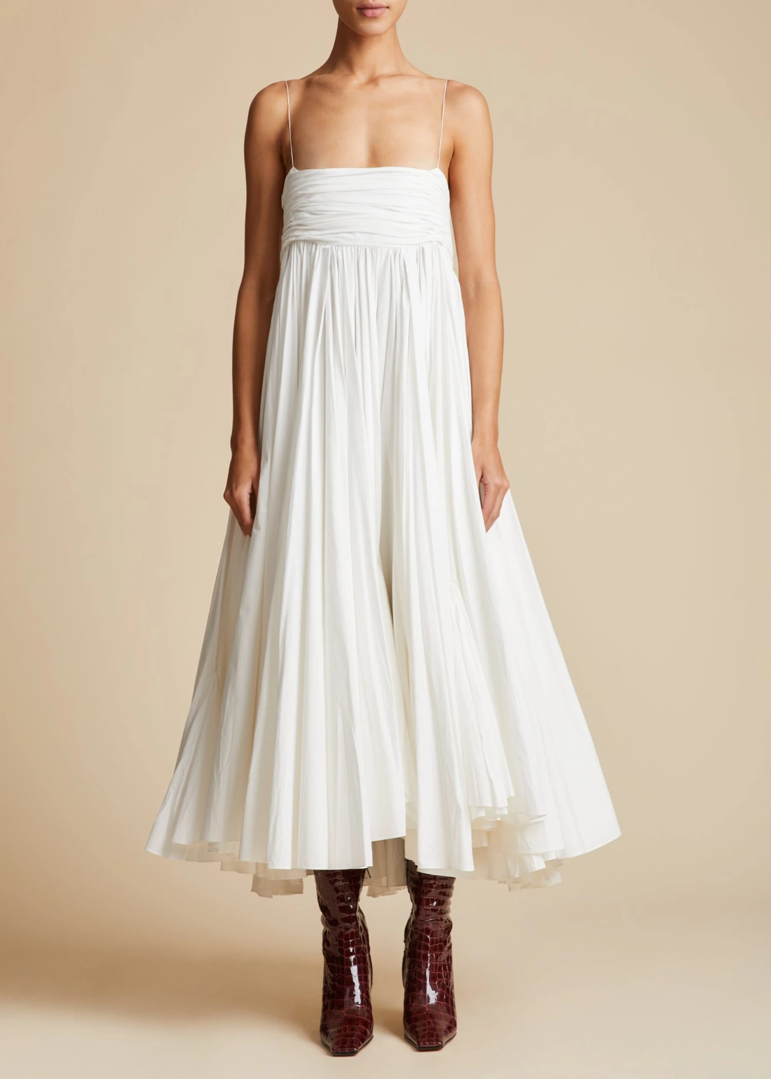 A Pre-Fall standout, this washed poplin dress brings together the collection’s signatures: elongated and intensified silhouettes, heightened tactility, and decisive yet playful details. Suspended from delicate lingerie straps, the draped silhouette is one of intentional curves and dramatic movement, combining hand-crushed pleats with undulating hems animated by godets. A concealed side zipper closure ensures a smooth fit.