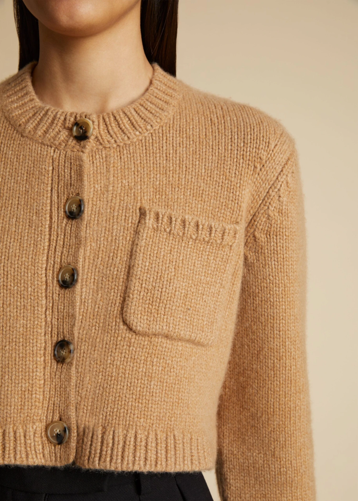 Part of the Pre-Fall collection’s wardrobe of intuition, this luscious and robust cashmere cardigan is a cropped foil to elongated silhouettes. Finishing touches include a patch pocket at the chest, horn buttons, and rib-stitched trim at the crewneck, pocket, hem and cuffs.