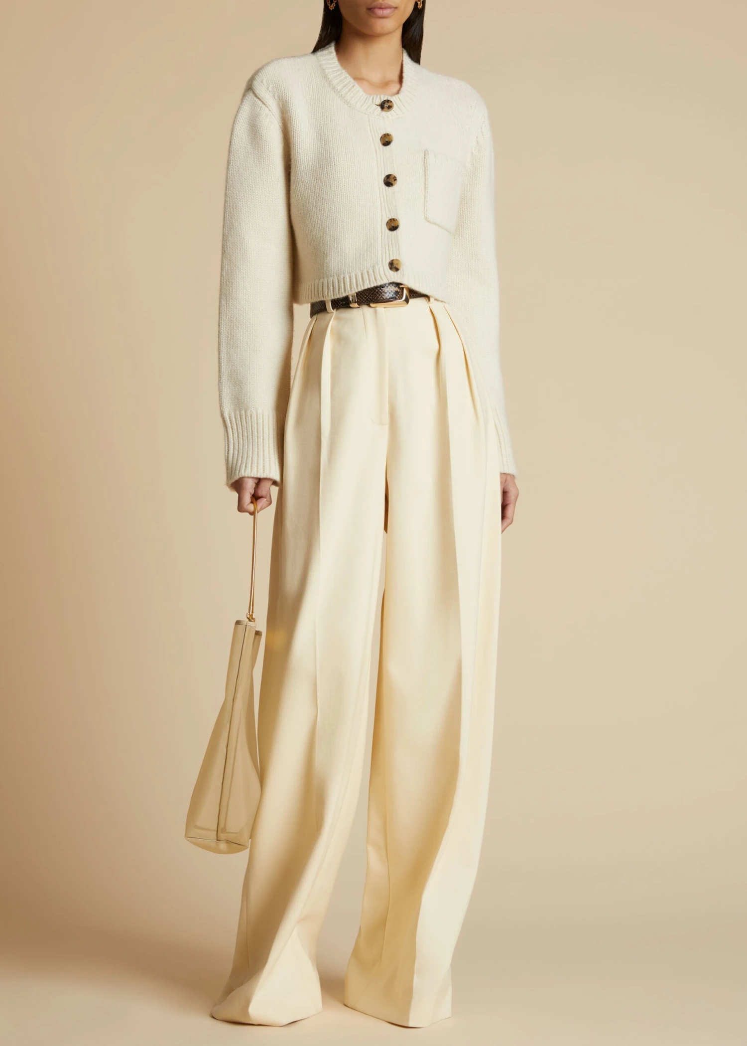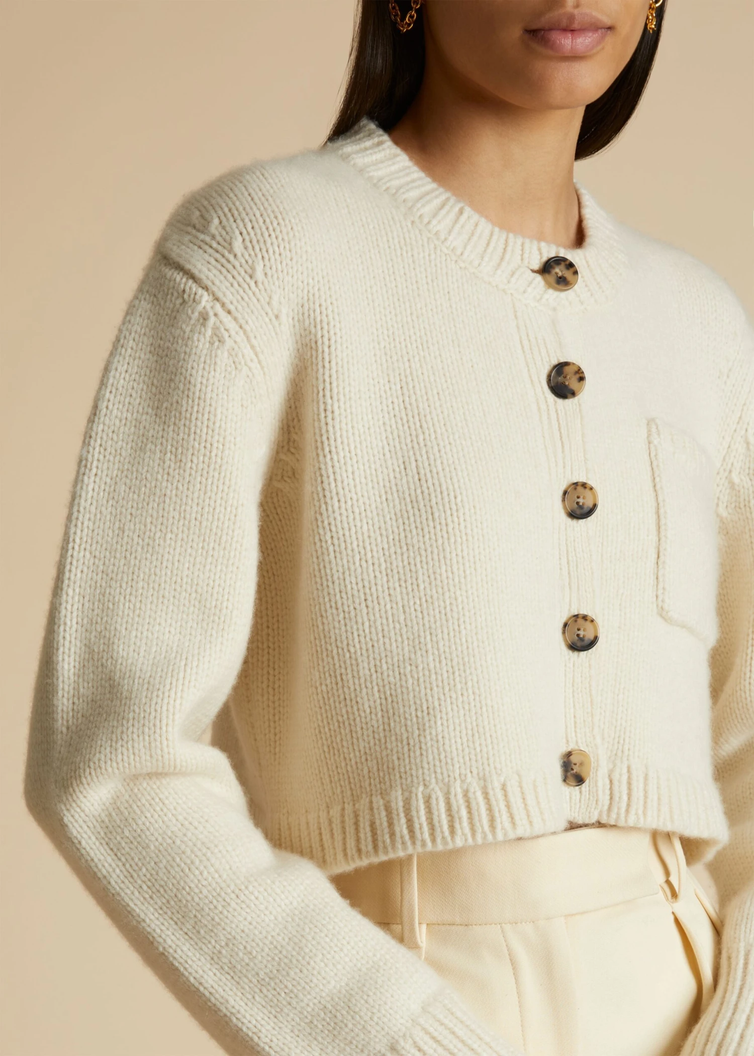 Part of the Pre-Fall collection’s wardrobe of intuition, this luscious and robust cashmere cardigan is a cropped foil to elongated silhouettes. Finishing touches include a patch pocket at the chest, horn buttons, and rib-stitched trim at the crewneck, pocket, hem and cuffs.