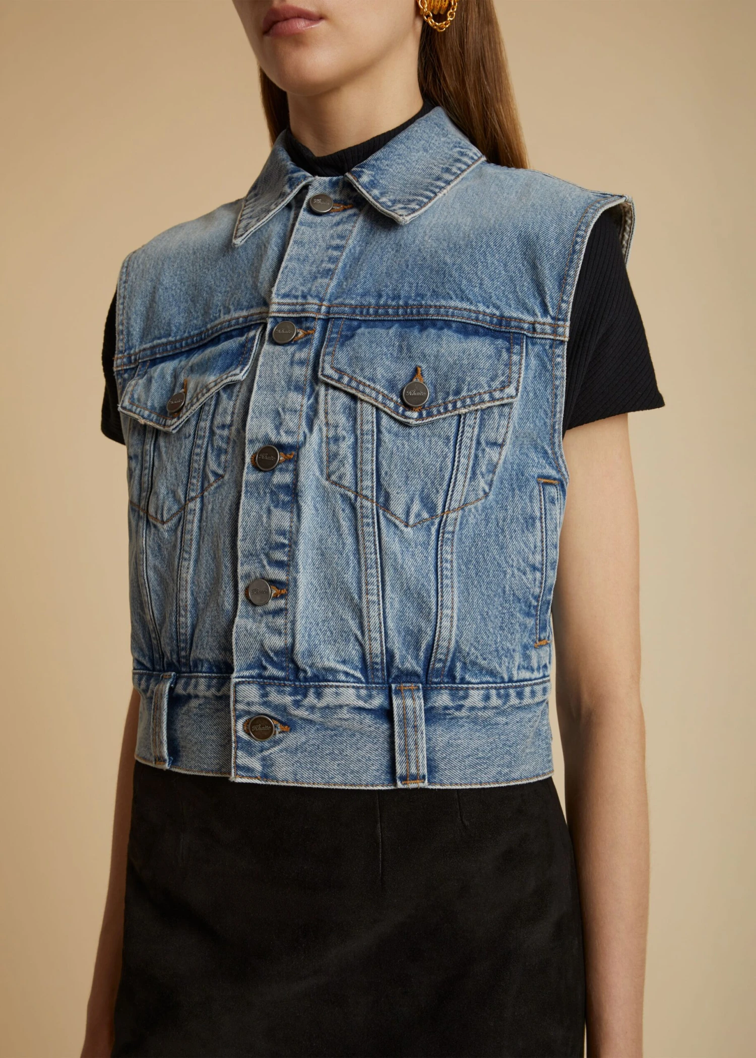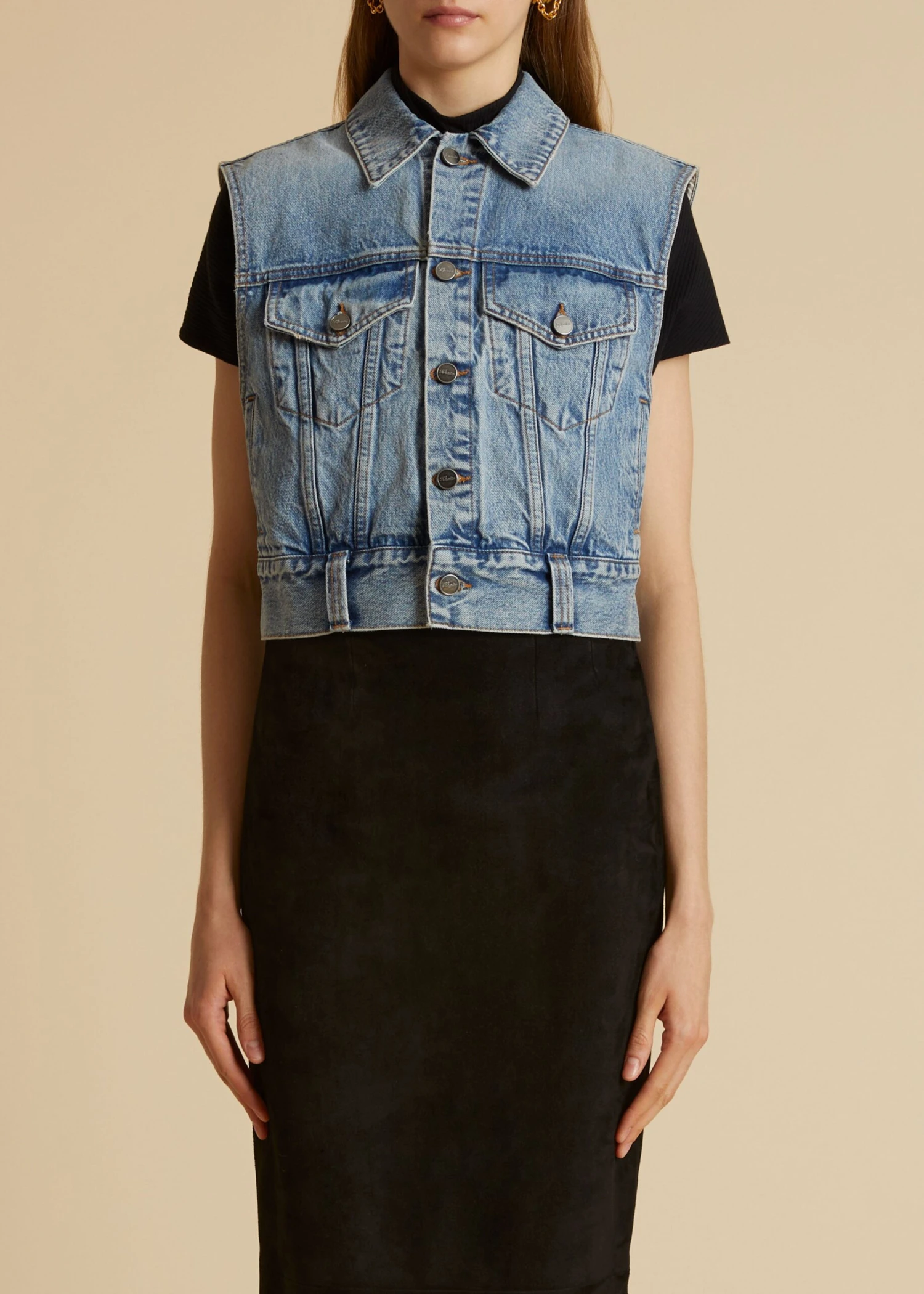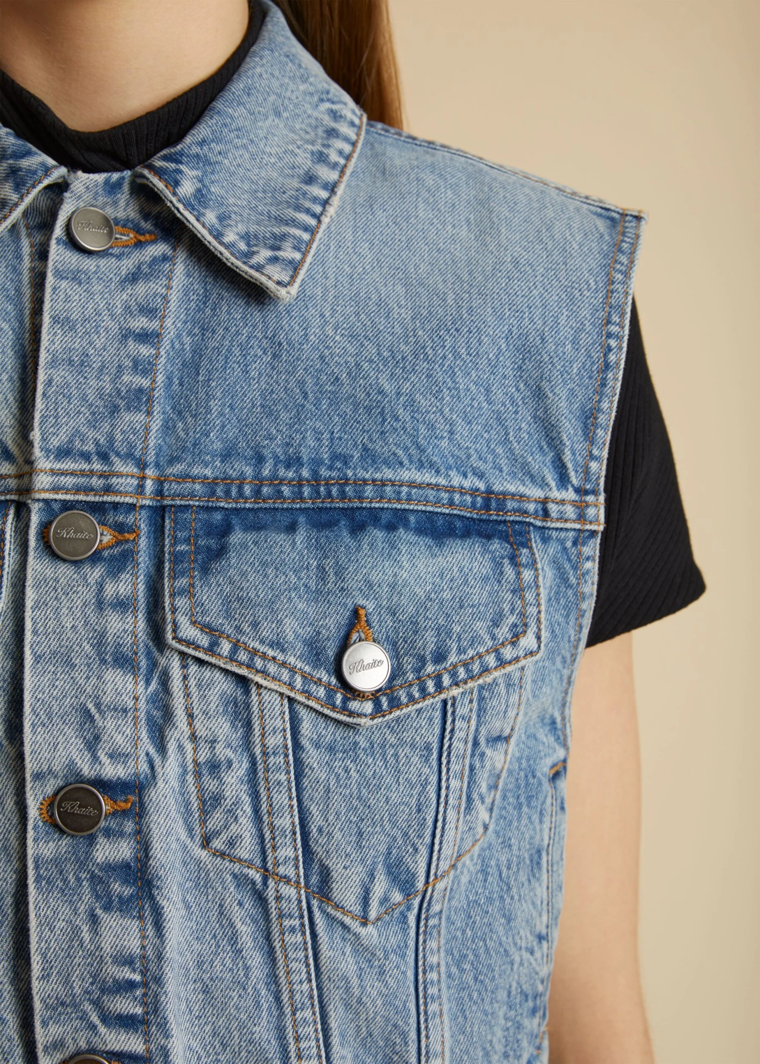 A reimagined trucker jacket, sans sleeves. Made in Los Angeles of robust denim pure with button-flap patch pockets and marigold topstitching.