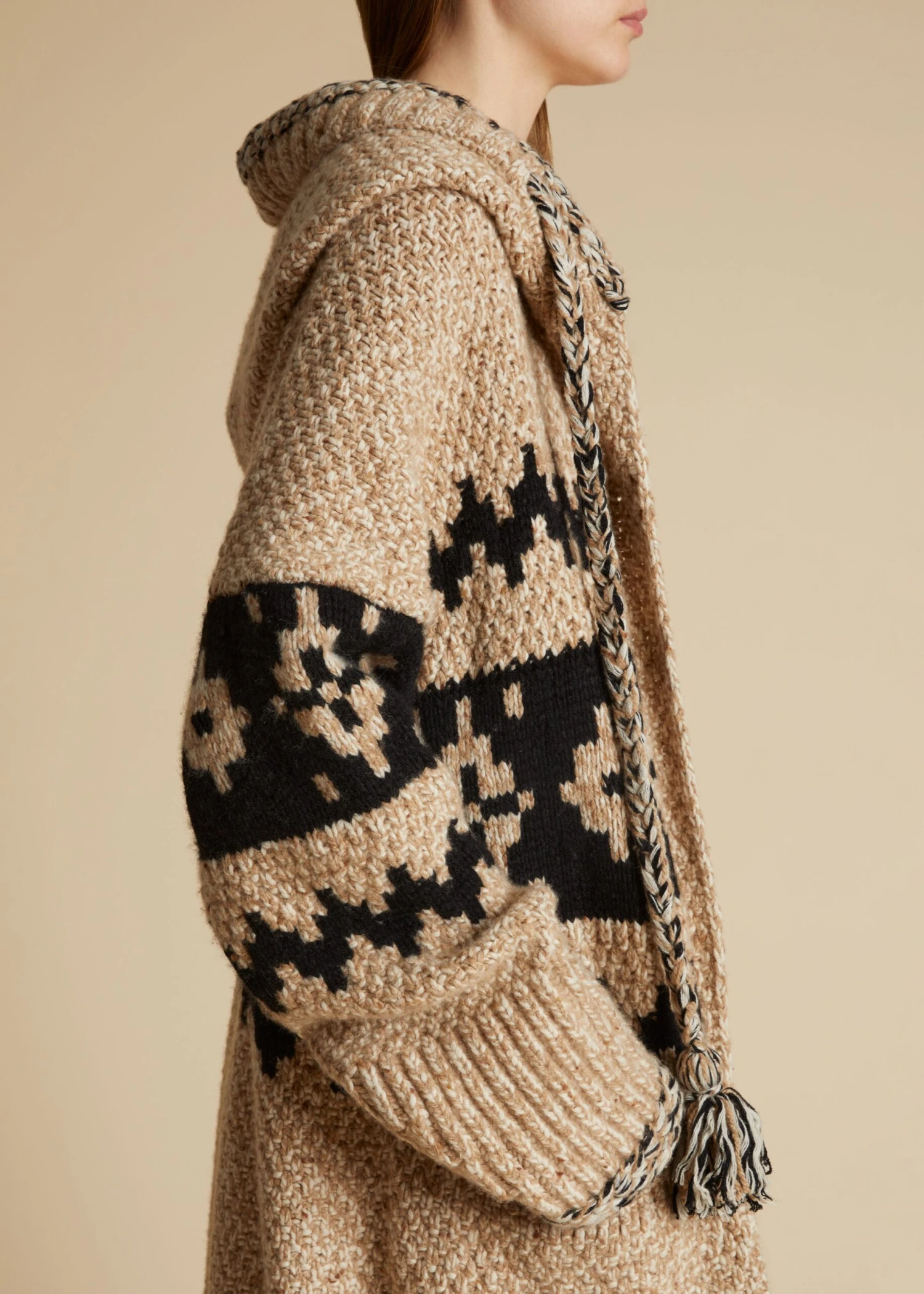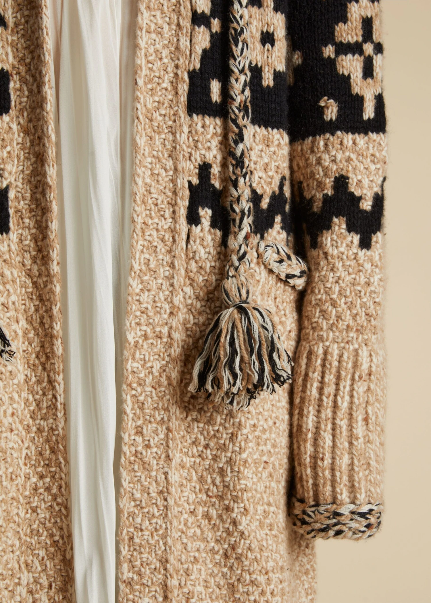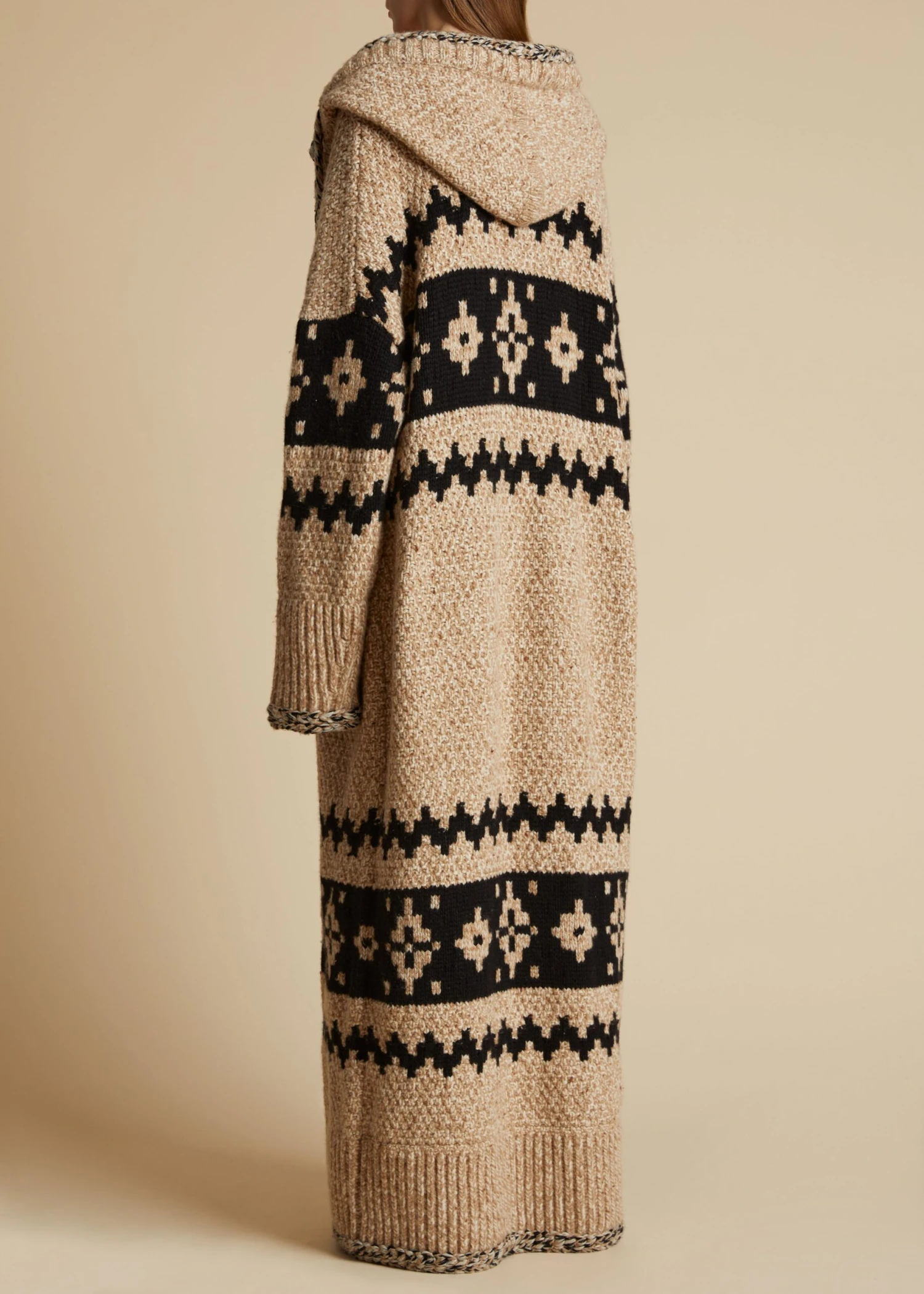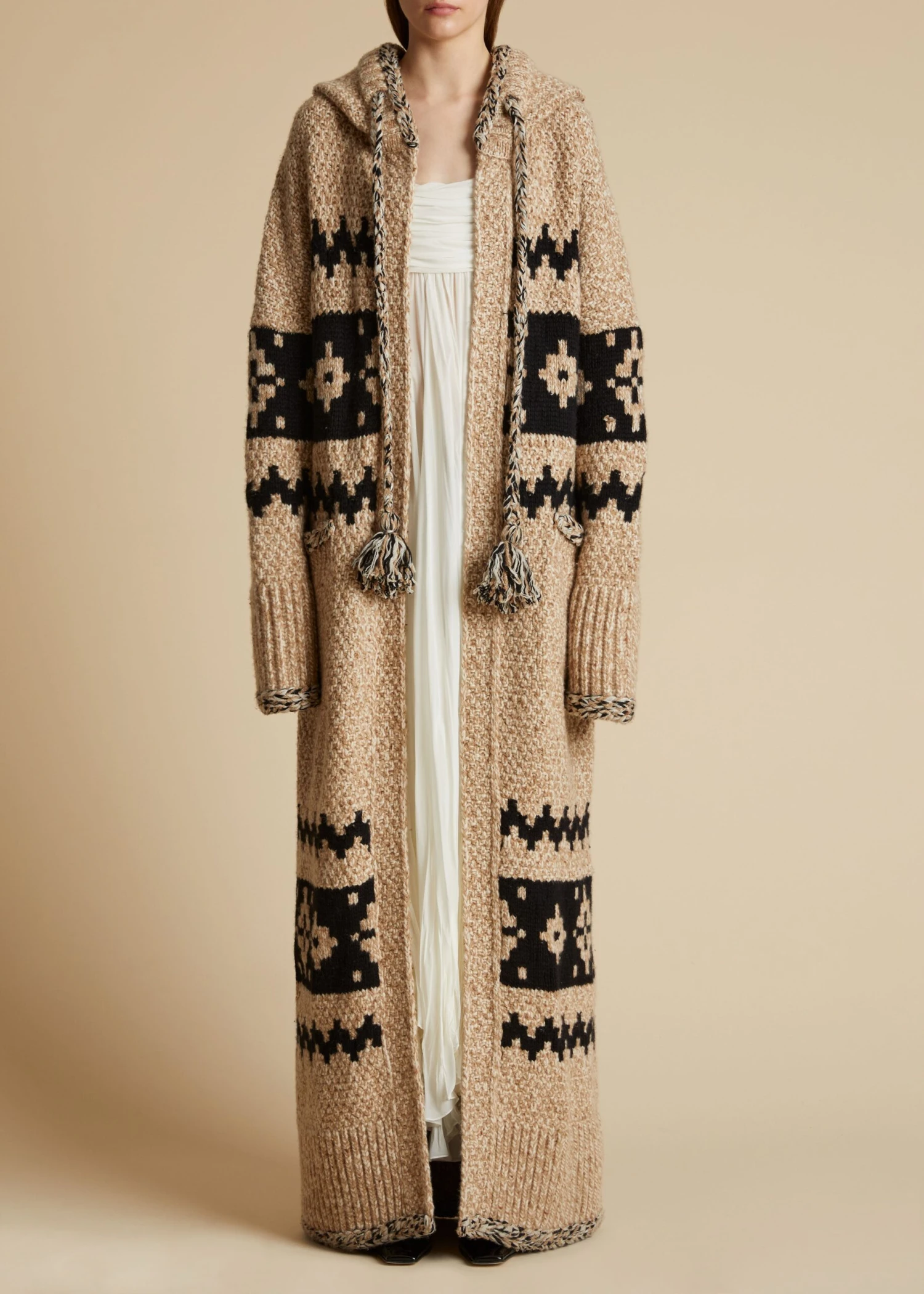 For Pre-Fall 2023, the evolution of Fair Isle knitting continues in intensified, elongated silhouettes like this full-length hooded coat of mélange cashmere. Framed by braided and tasseled drawstrings, it combines lively patterns in geometric bands and zig-zag stripes with an artful mix of stitches, including robust ribbing and crochet chain trim at the hood, hem, cuffs, and side pockets.