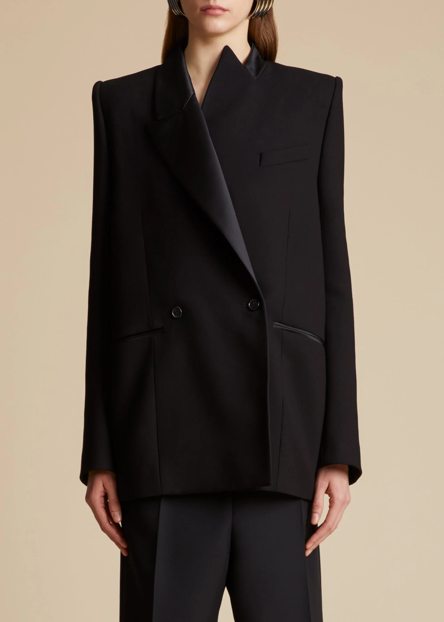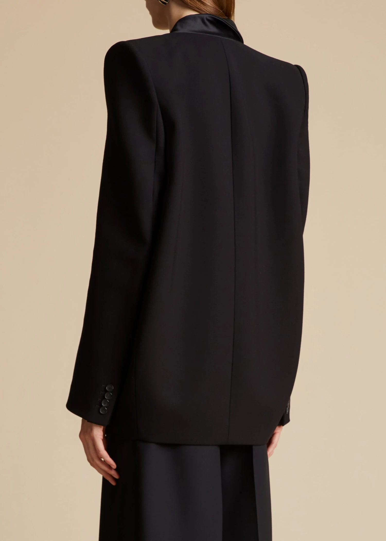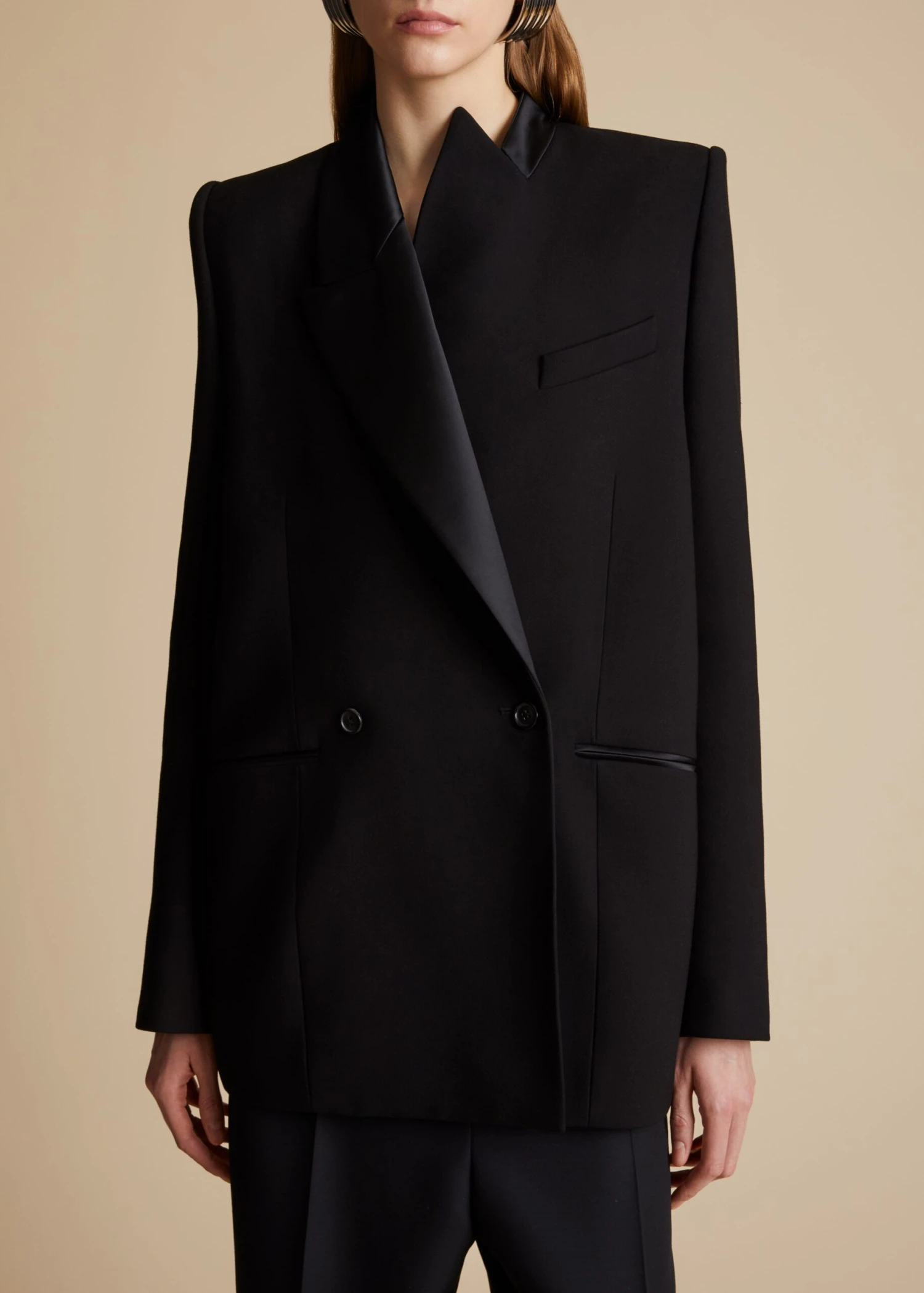 Through intensified, playfully detailed silhouettes like this double-breasted blazer, Pre-Fall 2023 proposes a wardrobe of intuition. The subtle cocoon shape is strengthened by padded shoulders and luminous asymmetrical lapels. Finishing touches include a trio of welt pockets and a silky lining of cupro twill.