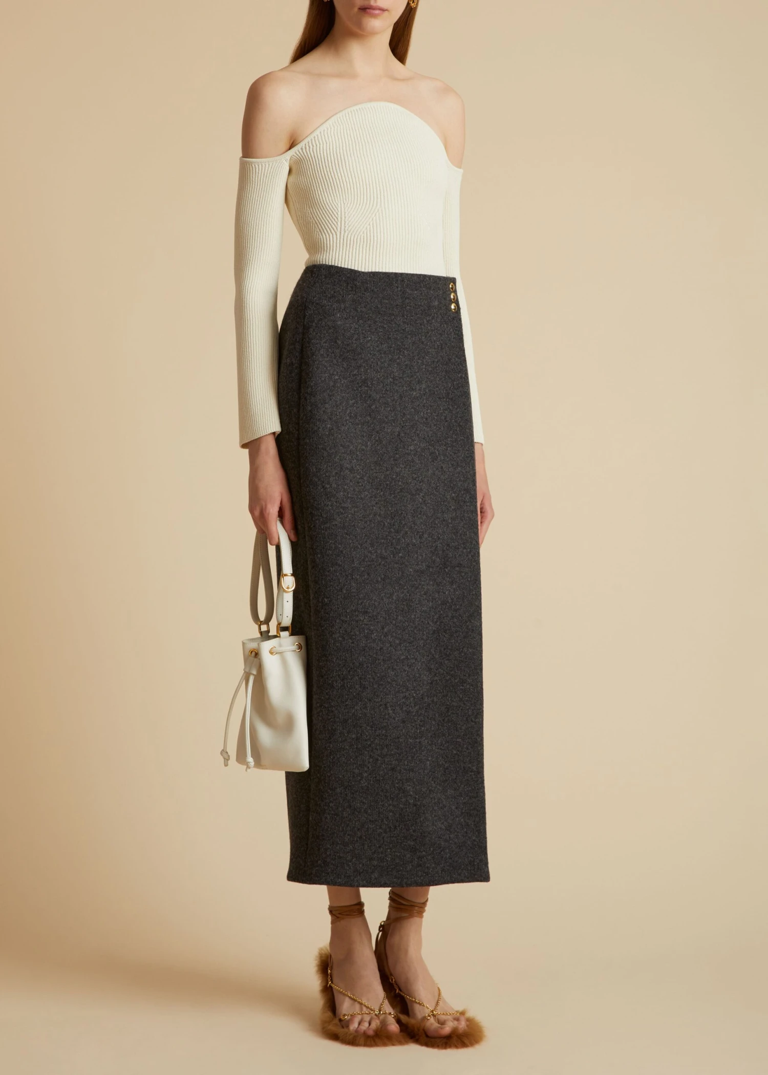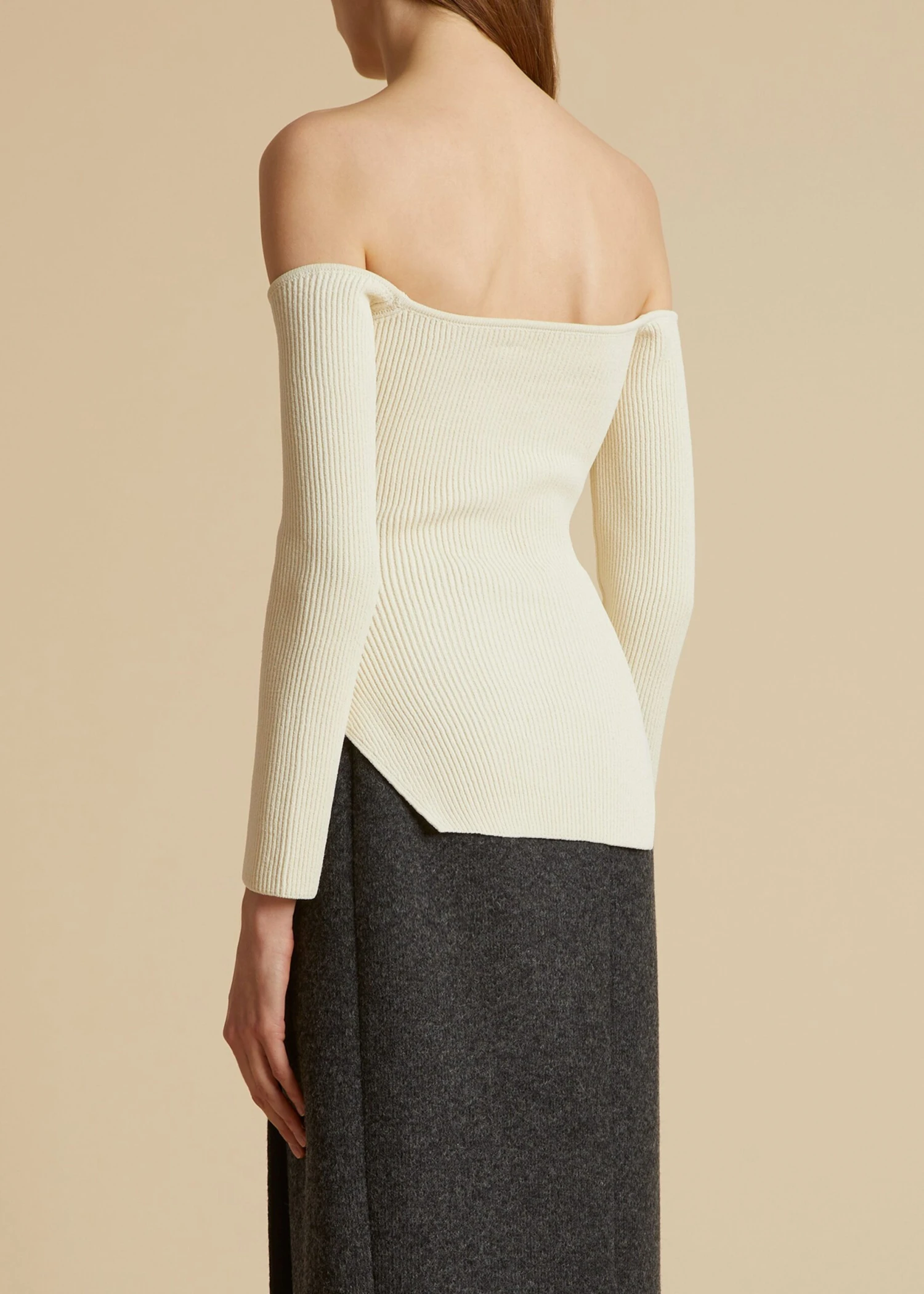 Exclusive to khaite.com. Sculpted knits start with exceptional materials. The finely ribbed matte viscose of this off-the-shoulder knit top was selected for its stretch and structure. Designed for a slim fit and crafted in Italy, the pull-on style has a convex neckline and deeply notched sides.