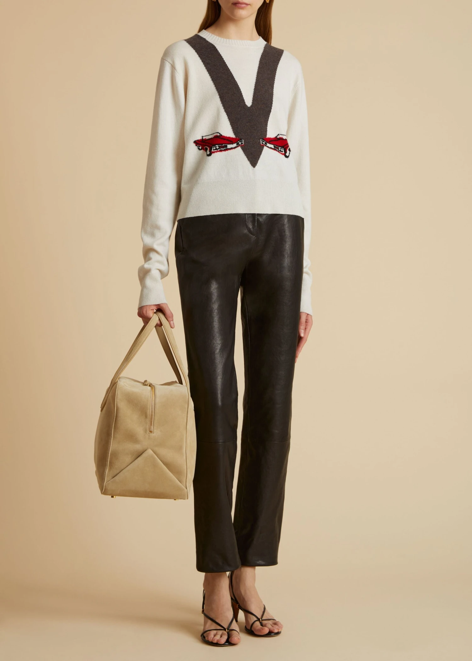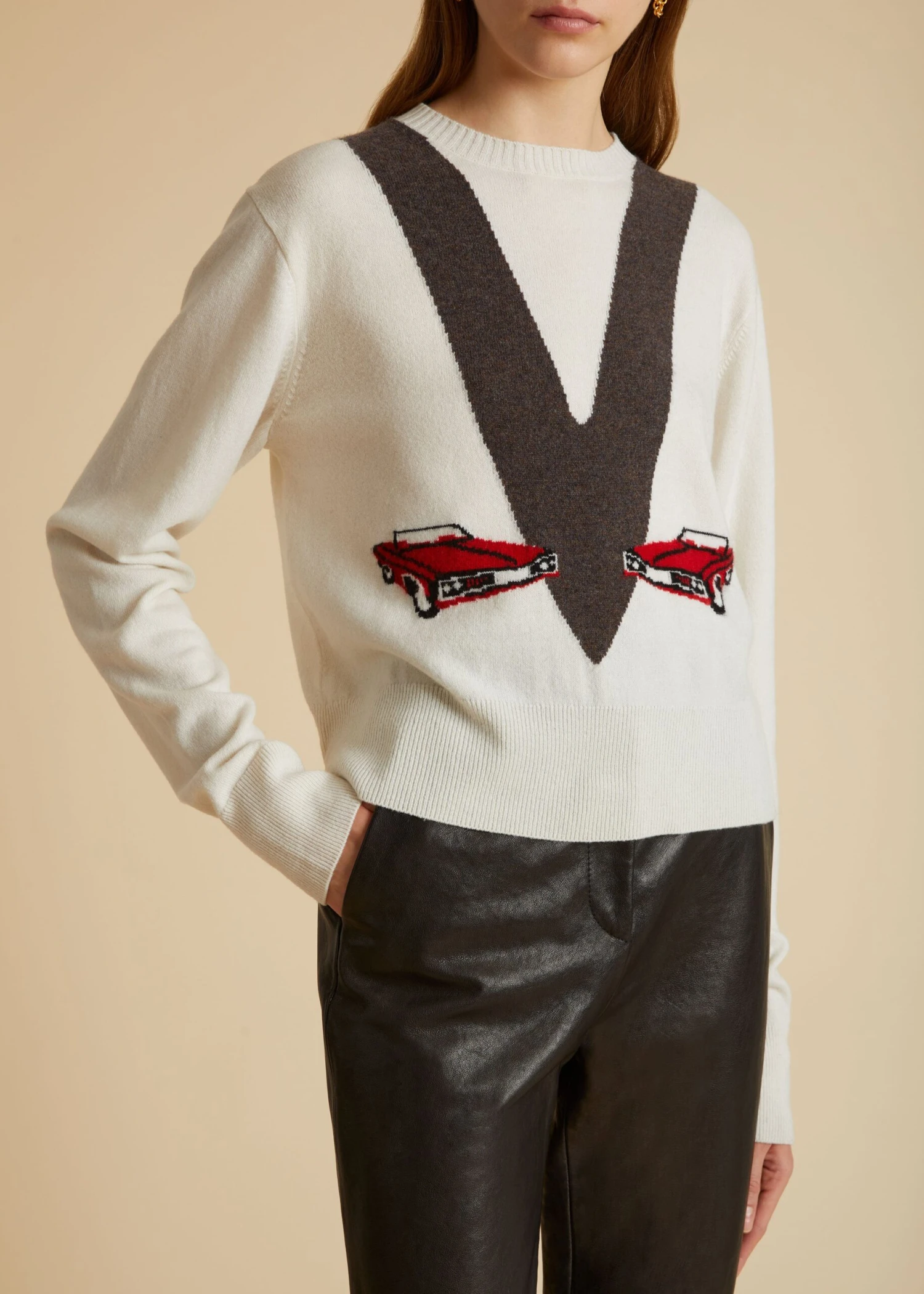 A relaxed crewneck pullover in fine cashmere jacquard-knit with a graphic chevron flanked by cherry red-convertibles. With ribbed trim.