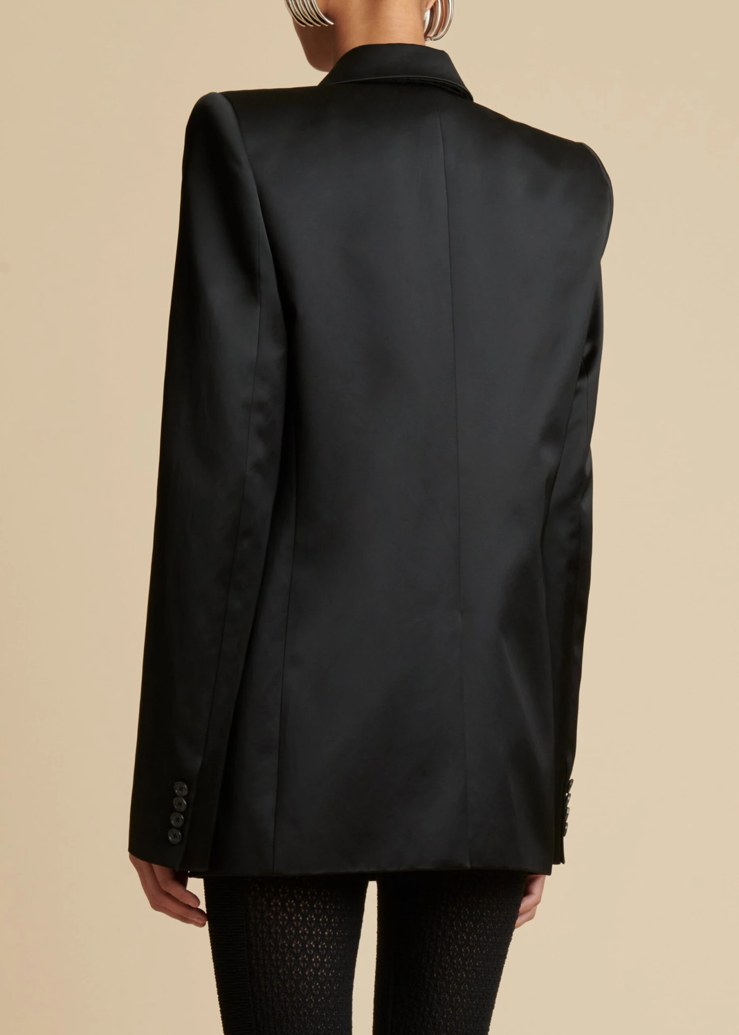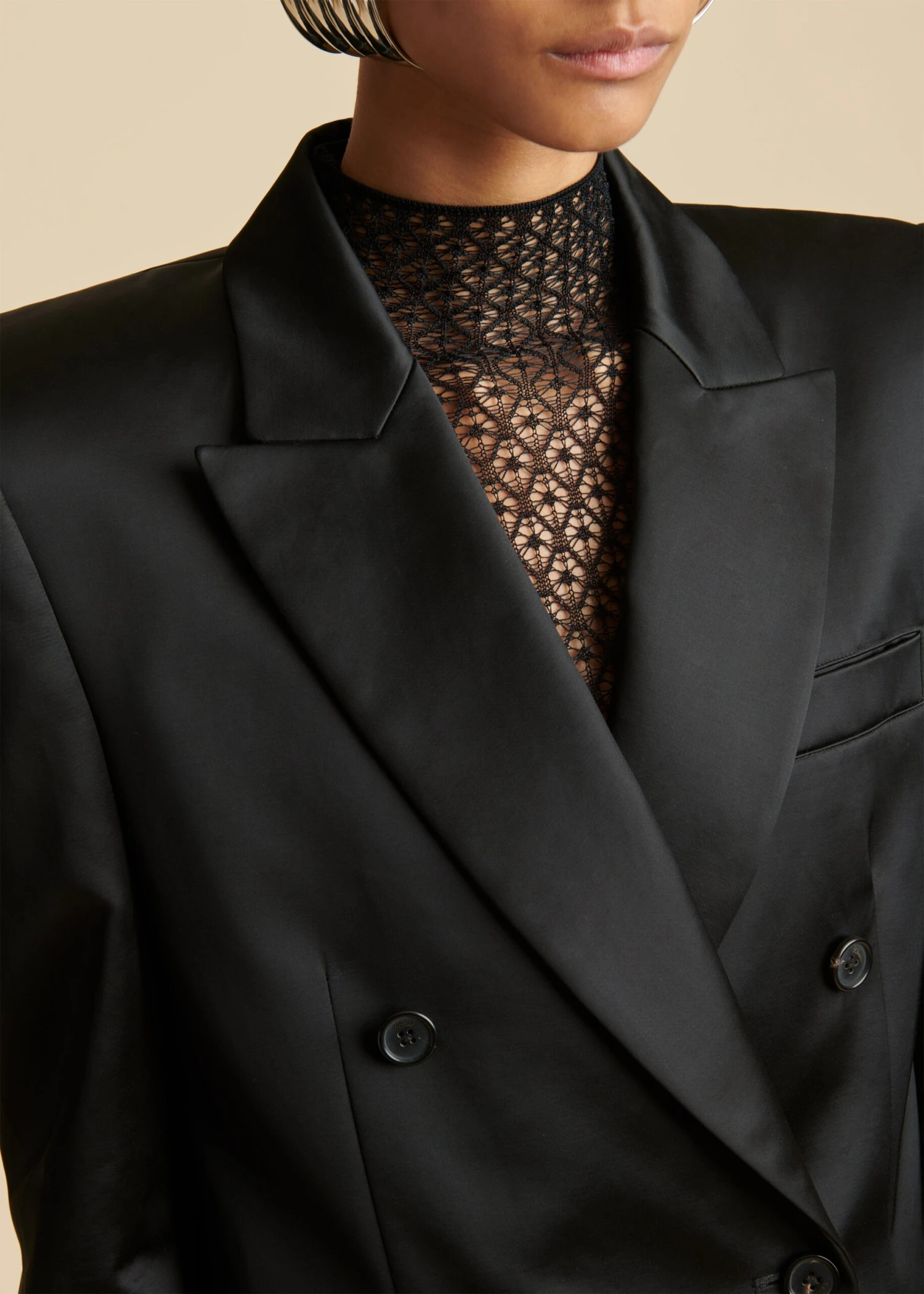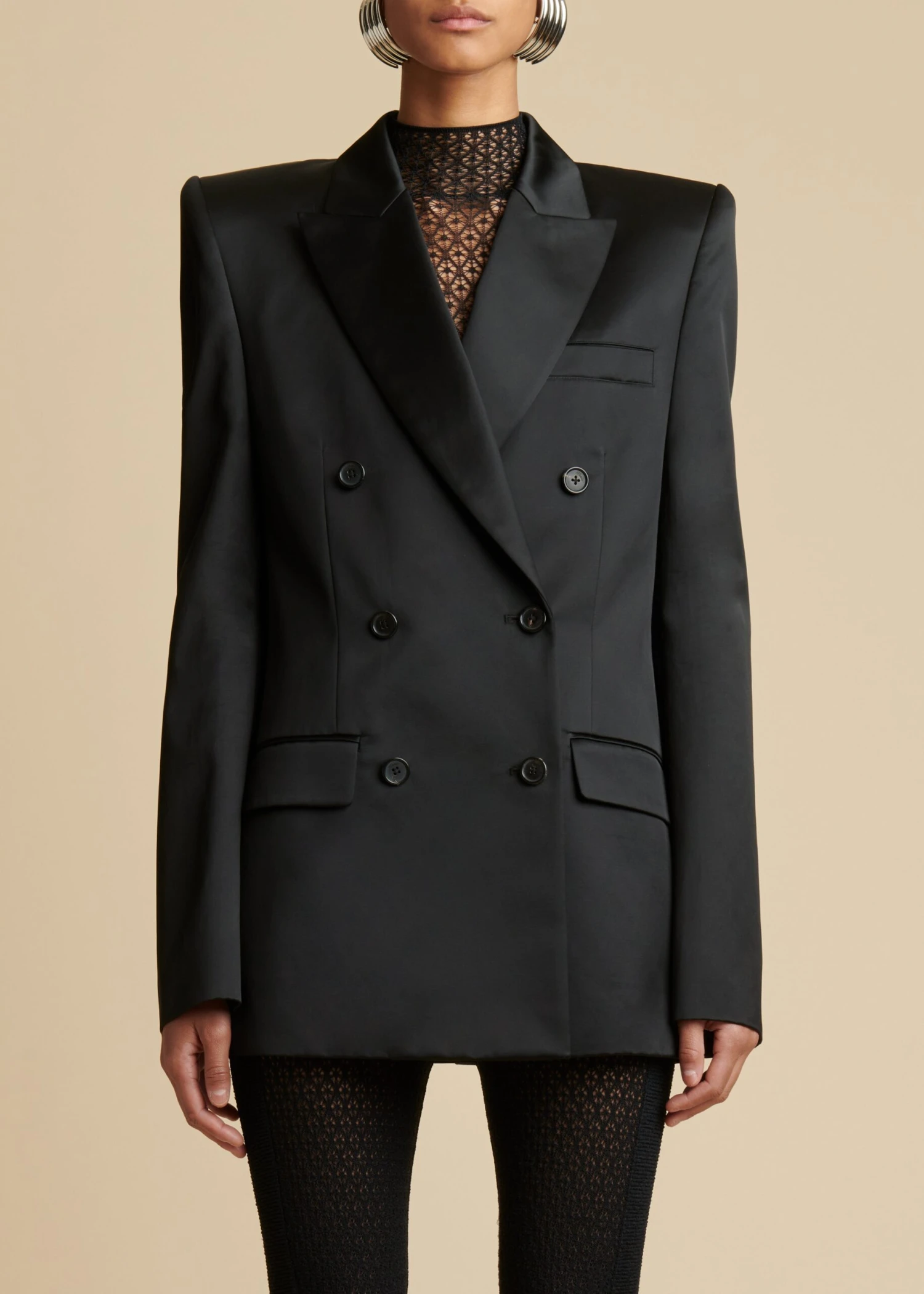 Inspired by the cinematic dreamscapes of David Lynch, the Spring/Summer 2023 collection spans a dynamic range of proportions, including the strong-shouldered, peak-lapeled silhouette of this luminous blazer. The double-breasted style is refined by a welt pocket, flap pockets, and tonal horn buttons.