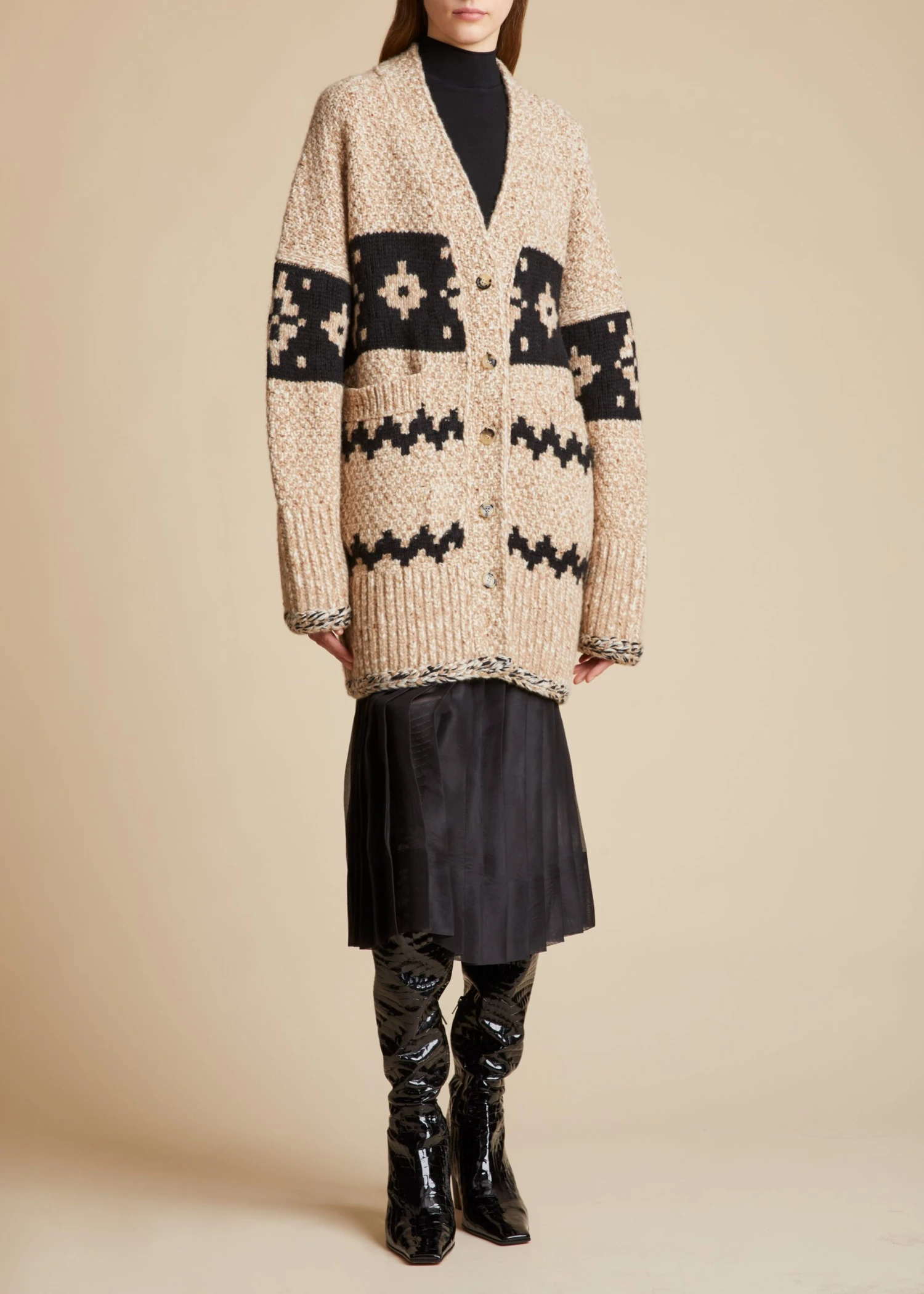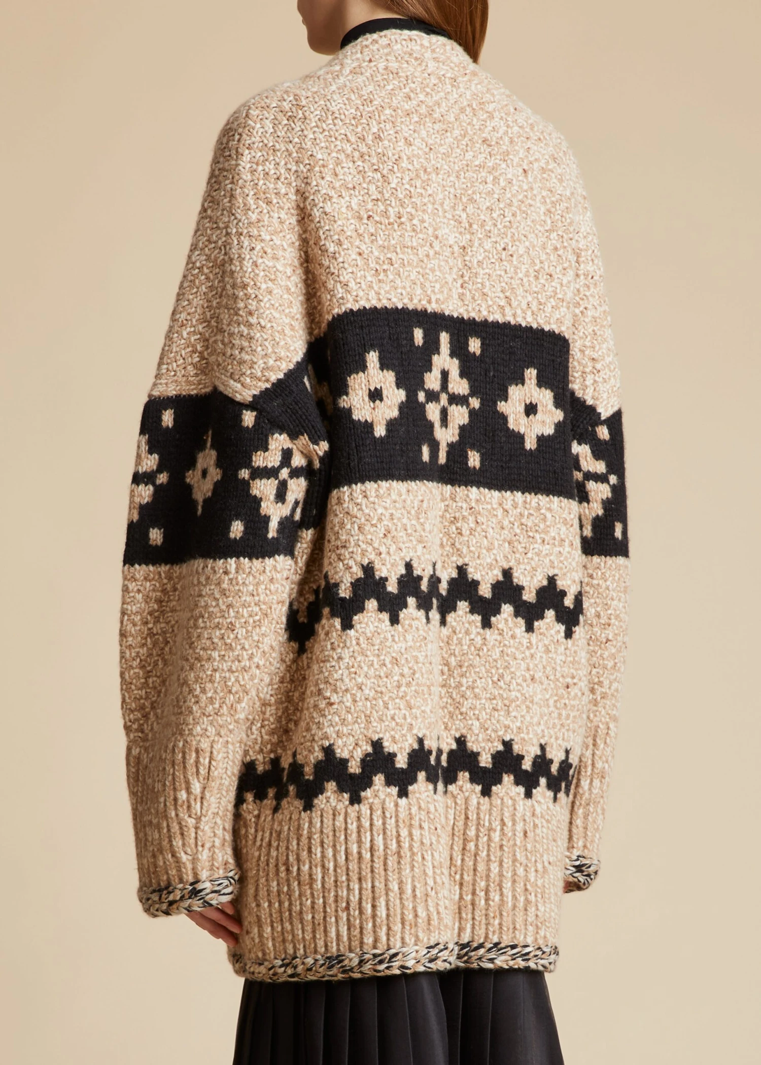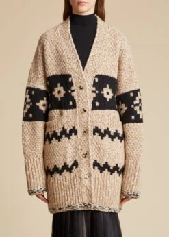 For Pre-Fall 2023, the evolution of Fair Isle knitting continues in intensified silhouettes like this enveloping cardigan of mélange cashmere. The button-front v-neck with side pockets combines lively patterns in a central band and zig-zag stripes with an artful mix of stitches, including robust ribbing and crochet chain trim at the hem and cuffs.