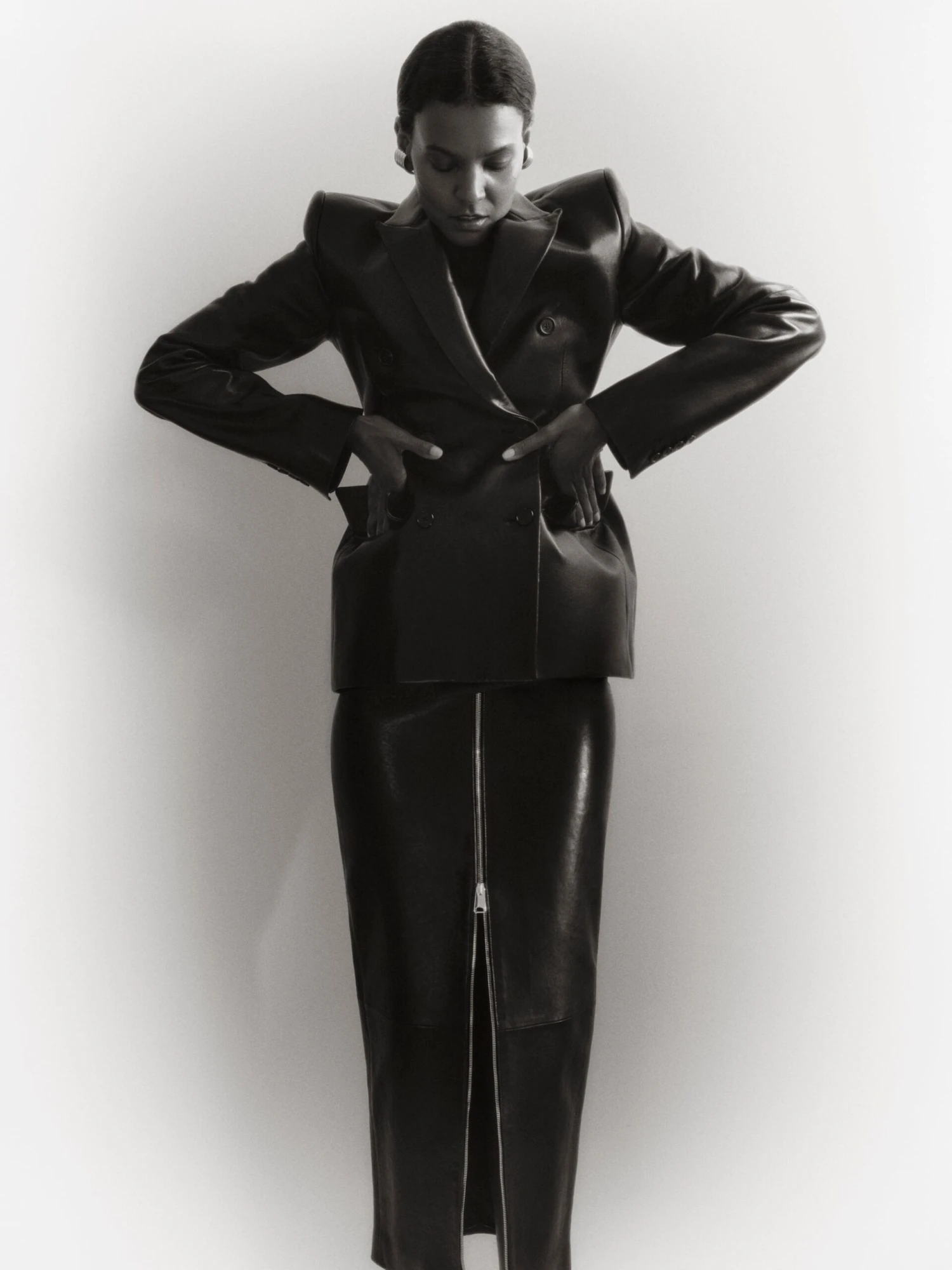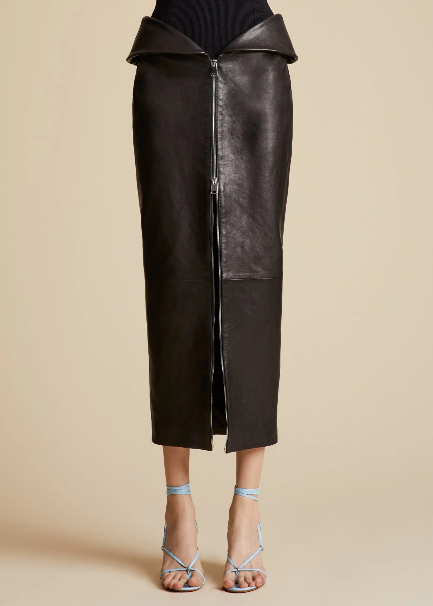 Pre-Fall’s elongated and intensified silhouettes, heightened tactility, and decisive yet playful details come together in this sleek leather skirt. The tapered, low-waisted silhouette is framed by a reimagined peplum, bisected by a two-way zipper with signature chrome hardware, and lined in silky cupro.