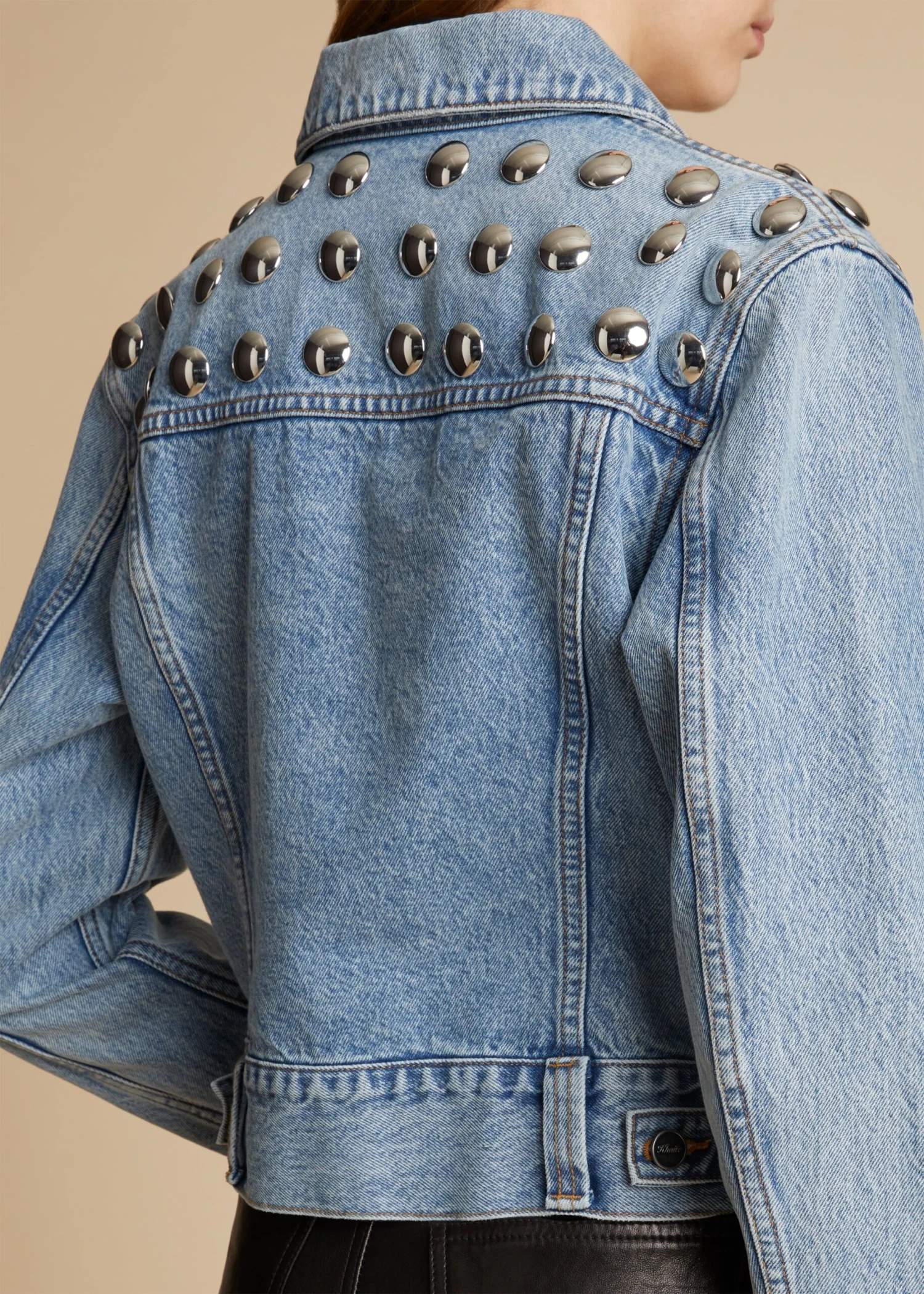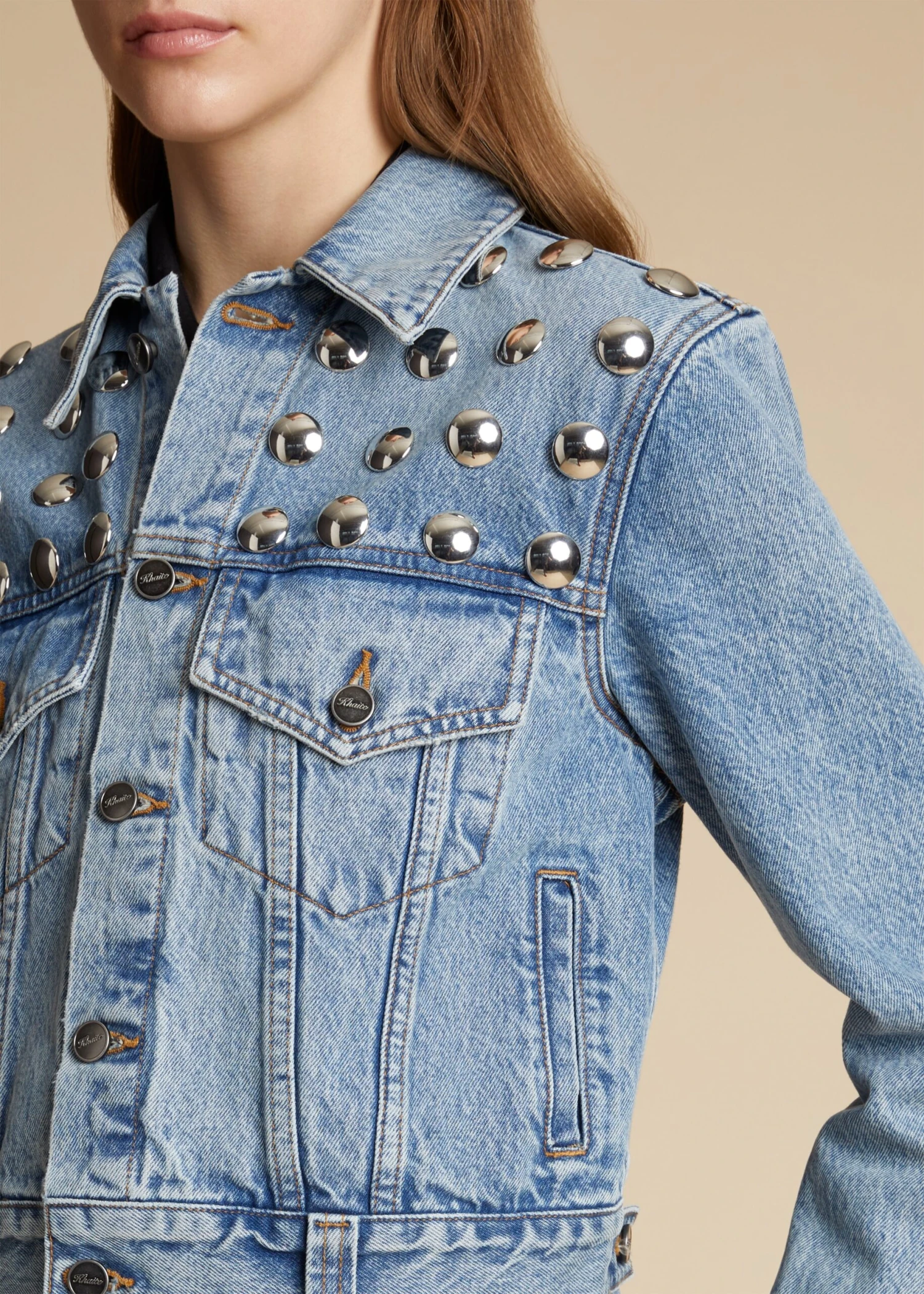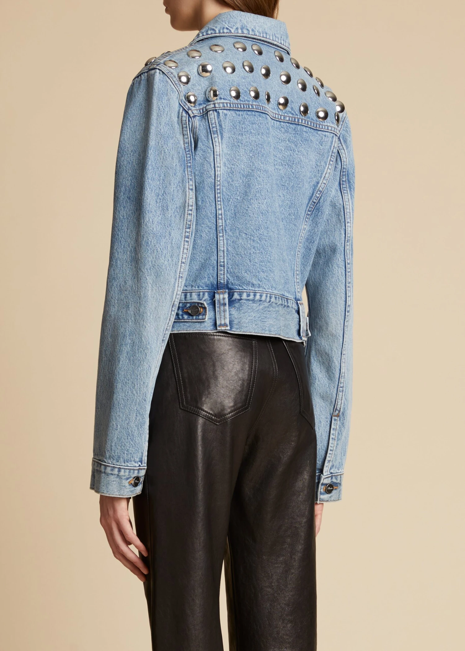 Debuting for Spring/Summer 2023 adorned with studs, this is a refined interpretation of the classic trucker jacket. The cropped silhouette combines a classic fit with signature denim details ranging from button-flap patch pockets to marigold topstitching. Each one is finished—and gently distressed—by hand in Los Angeles.