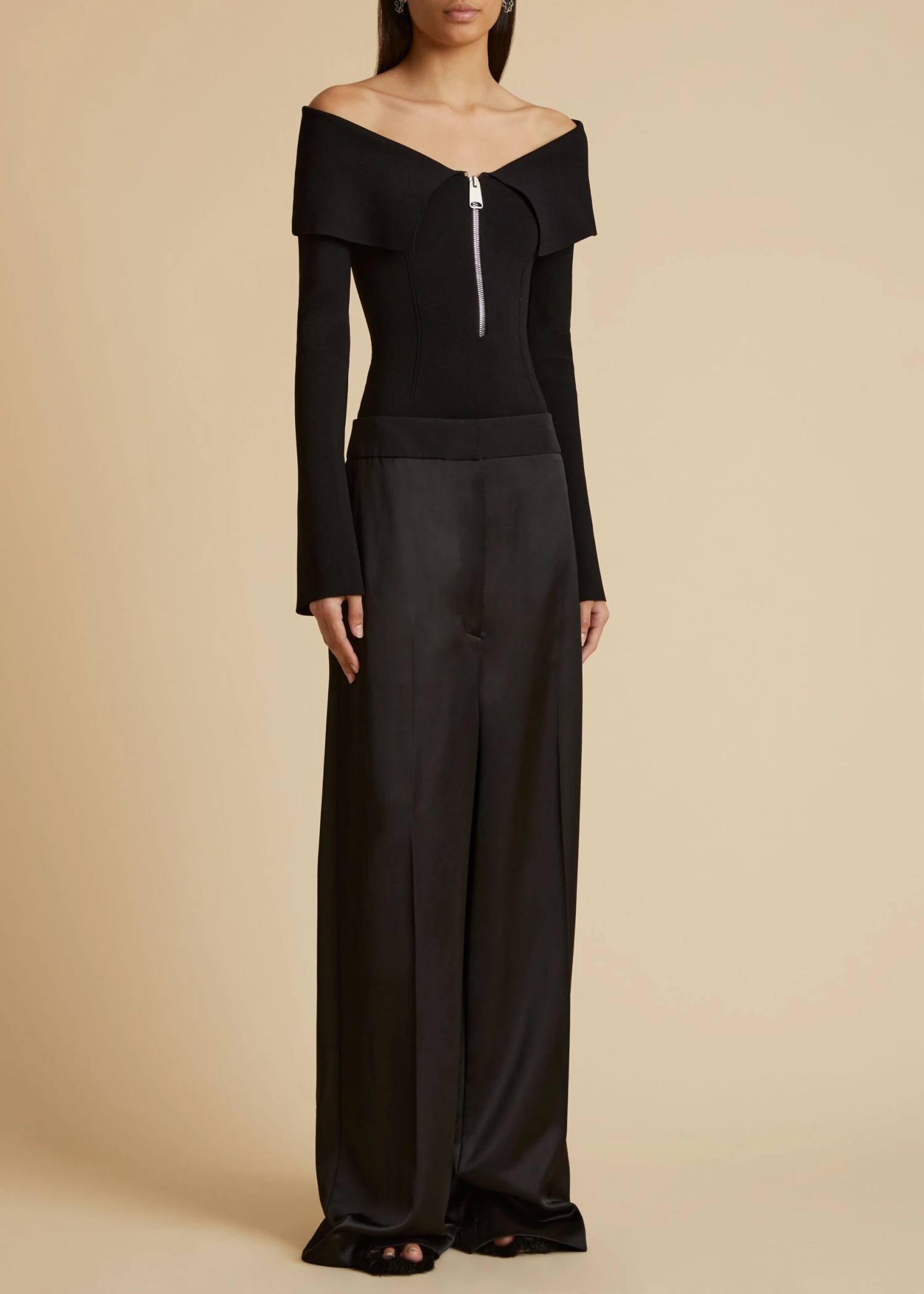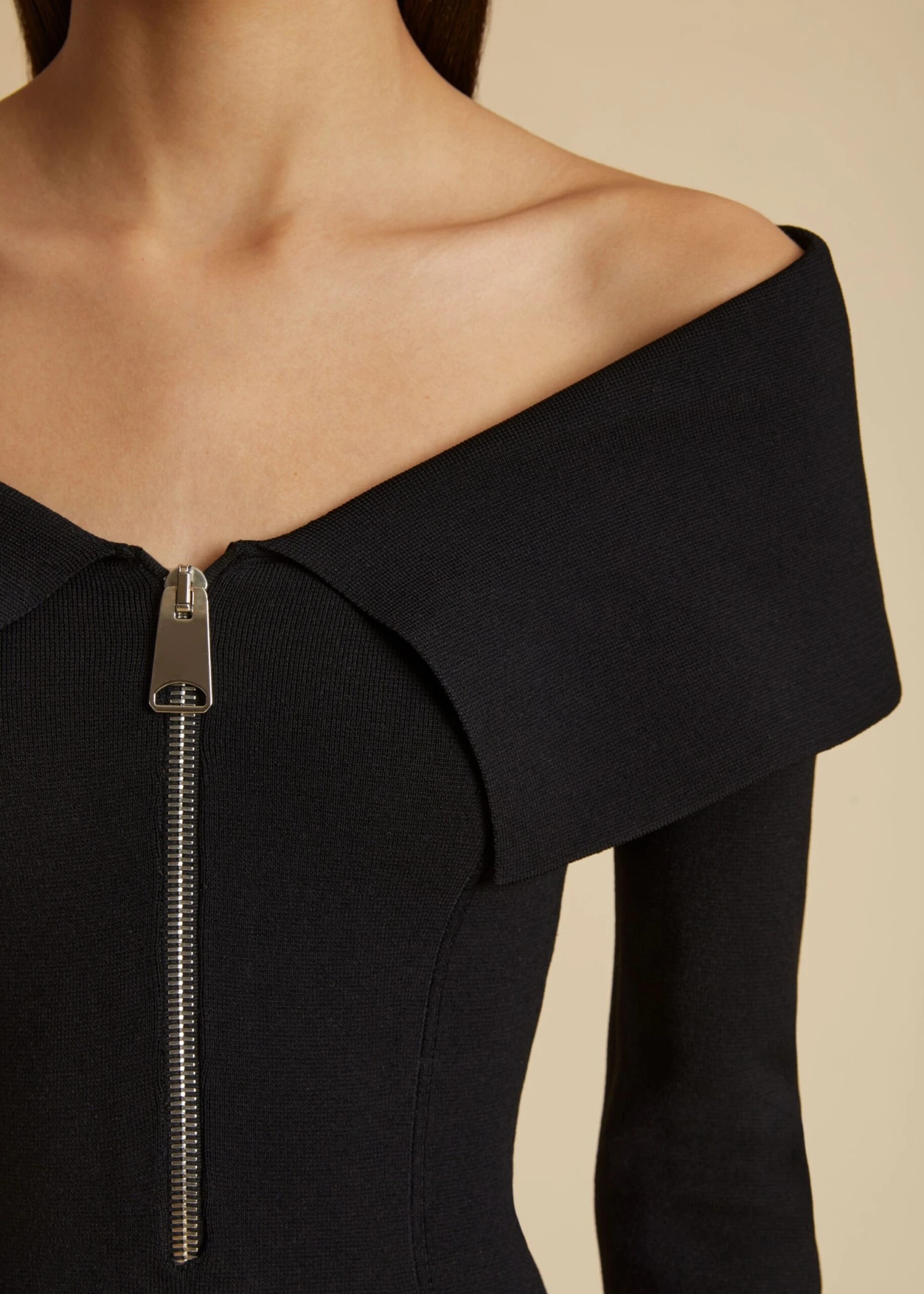 An off-the-shoulder v-neck top framed by a draped collar. The boldly scaled chrome zipper pull is the sole closure of this sculpted silhouette.