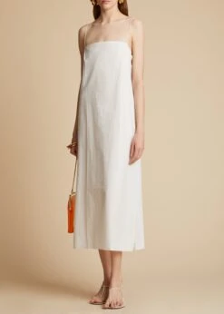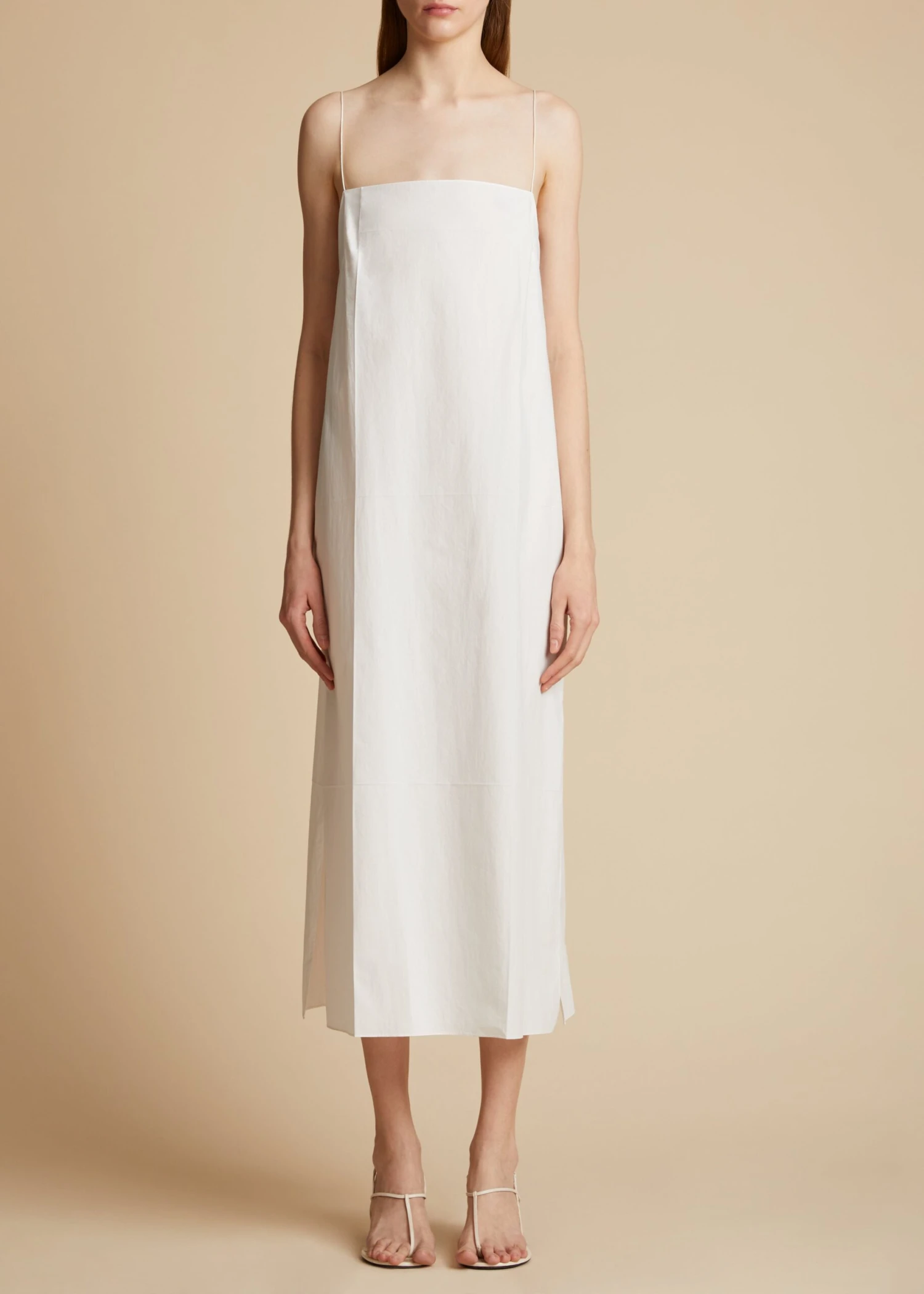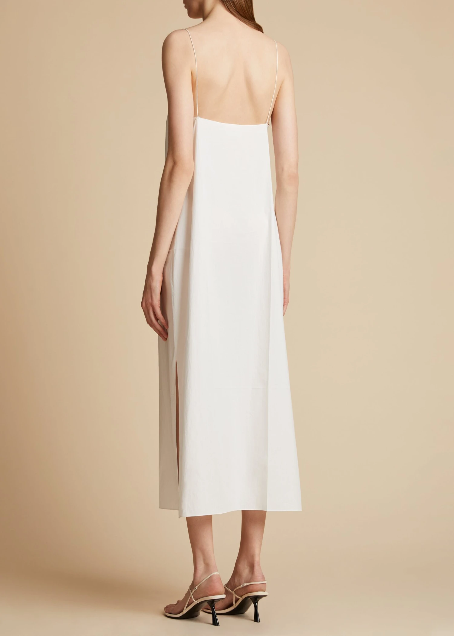 Part of the summer capsule. In washed poplin, this side-slit slip dress is constructed with linear precision and traced by pressed pleats. Lightweight cotton poplin is transformed by enzyme washing to create a soft finish that feels cool and comfortable against the skin. Suspended from delicate lingerie straps, it has a concealed side zipper for a smooth fit.