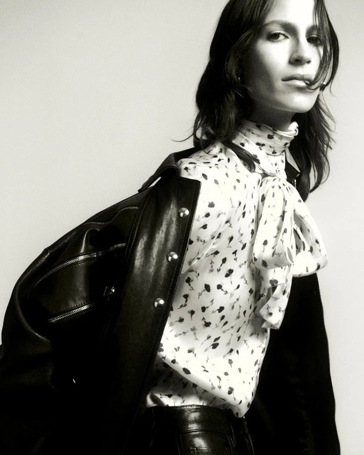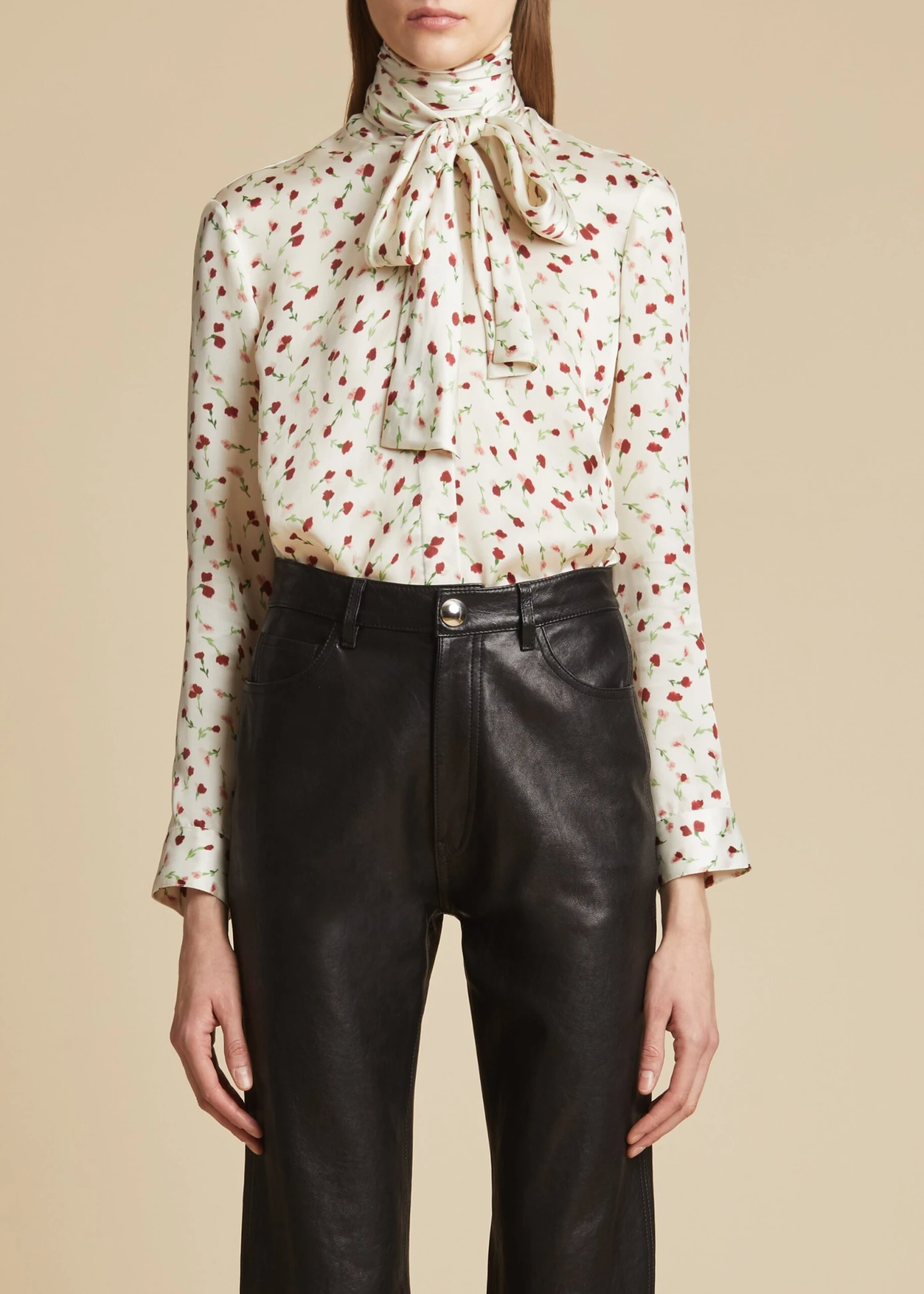 Part of the summer capsule. With an integrated scarf designed to be tied in a soft bow at the neckline, this sculpted, stand-collar top is tailored in silky cupro twill that has been washed to impart a full-bodied bounce. Finishing touches include a hidden-button placket, back yoke, and single-button cuffs.
