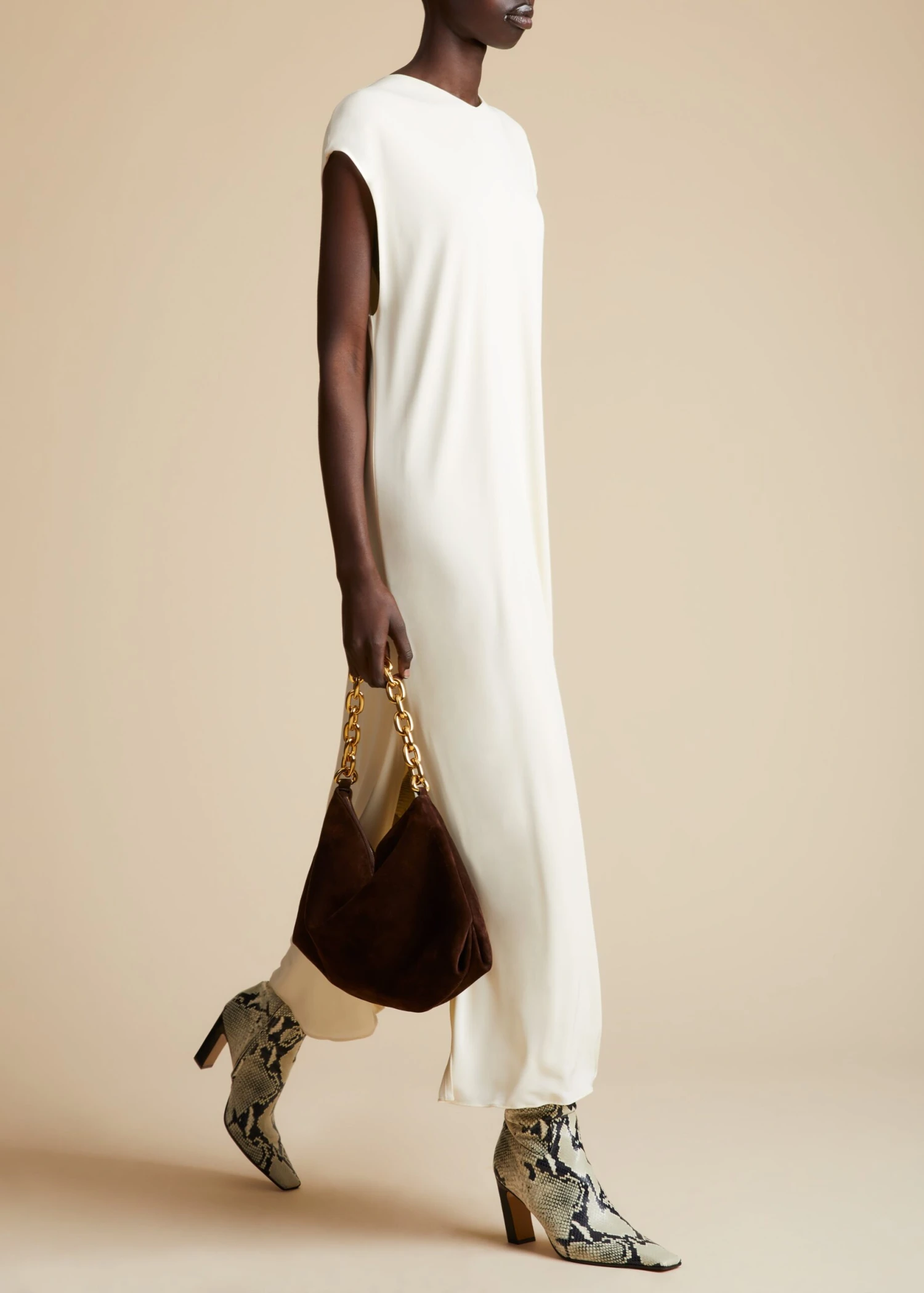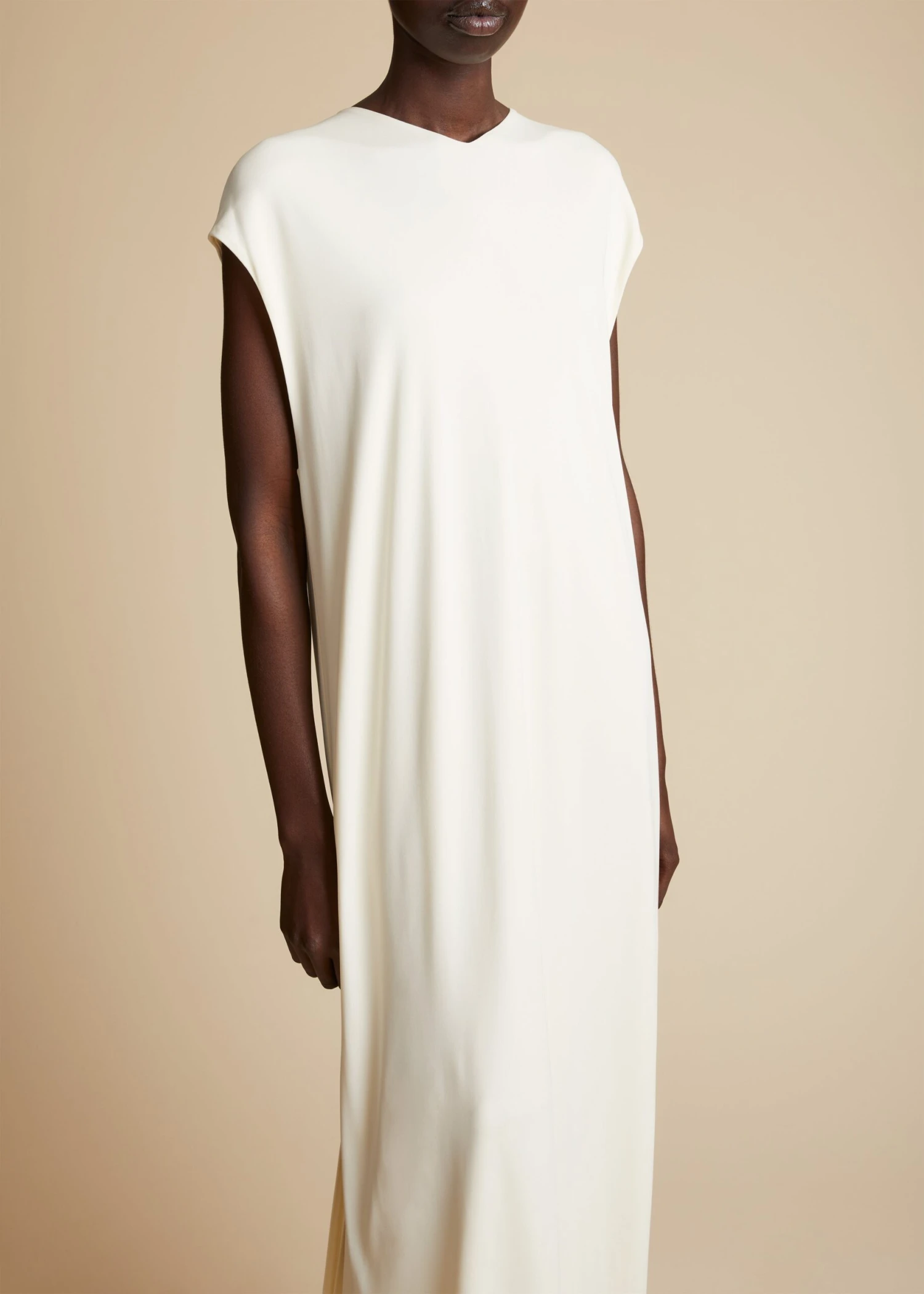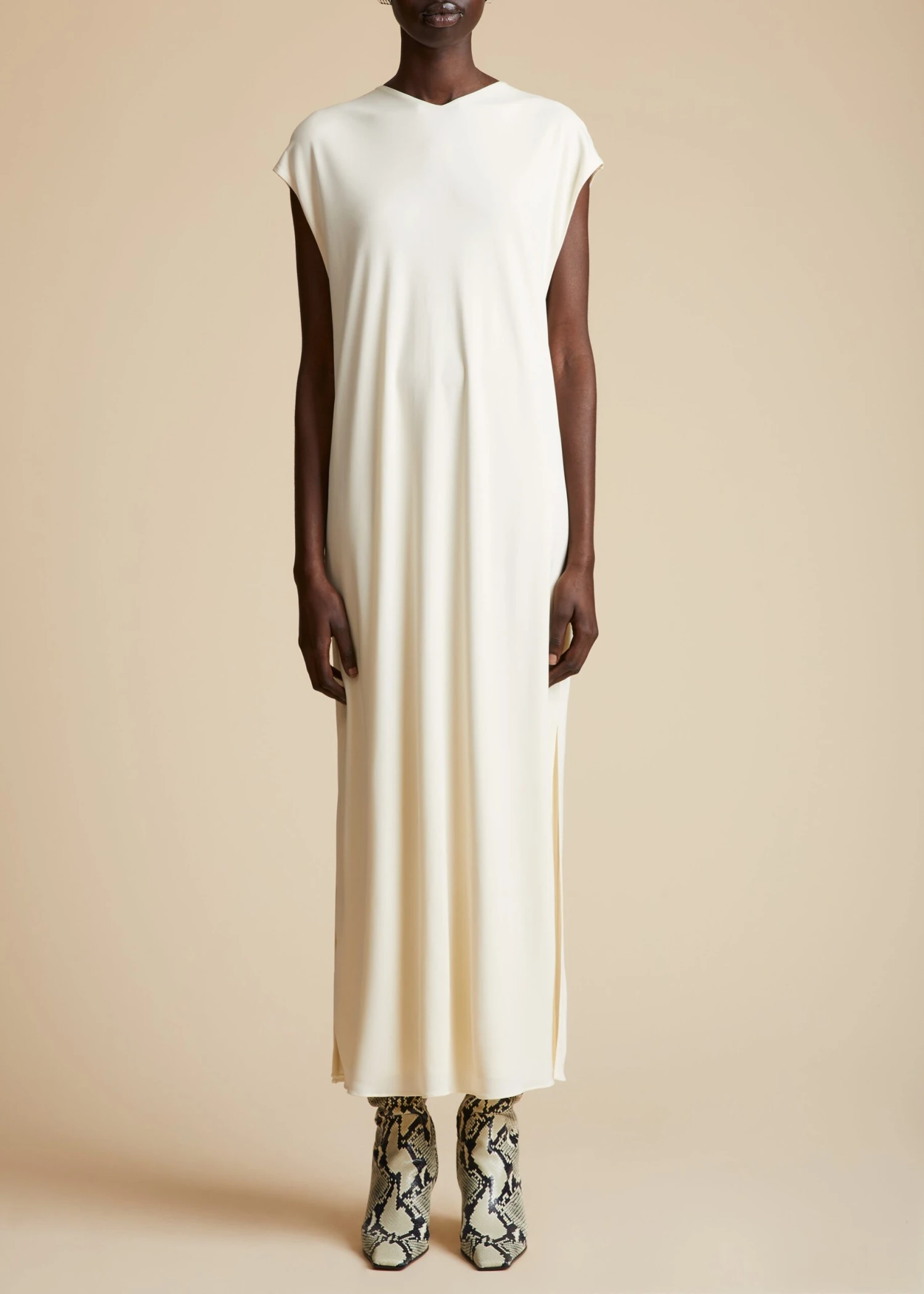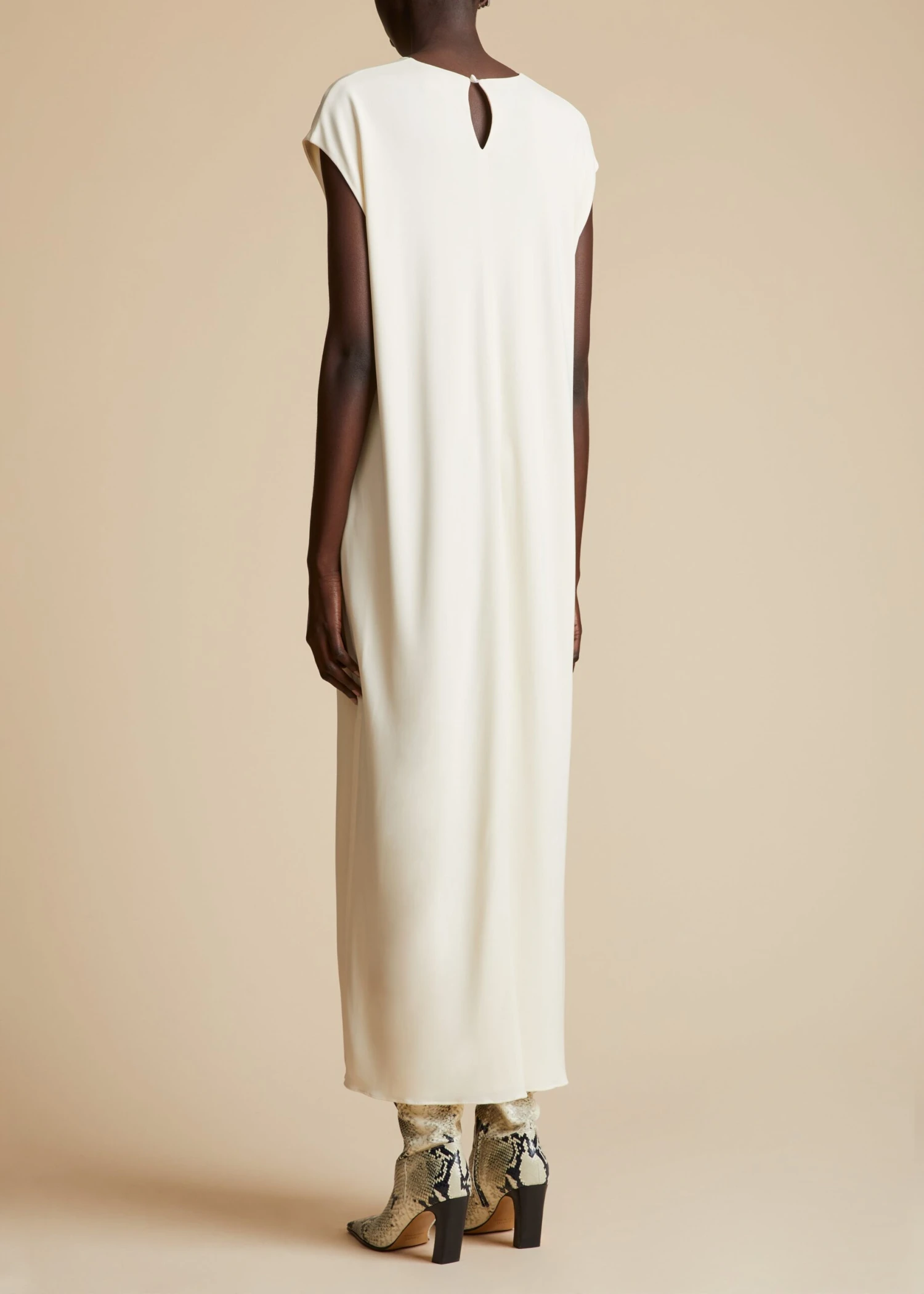 Through elongated silhouettes like this fluid dress, Pre-Fall 2023 proposes a wardrobe of intuition. The cap-sleeved silhouette is double-layered for opacity. Framed by a high v-neckline, it is eased by deep side slits. A rouleau-loop button closure creates a keyhole at the back.