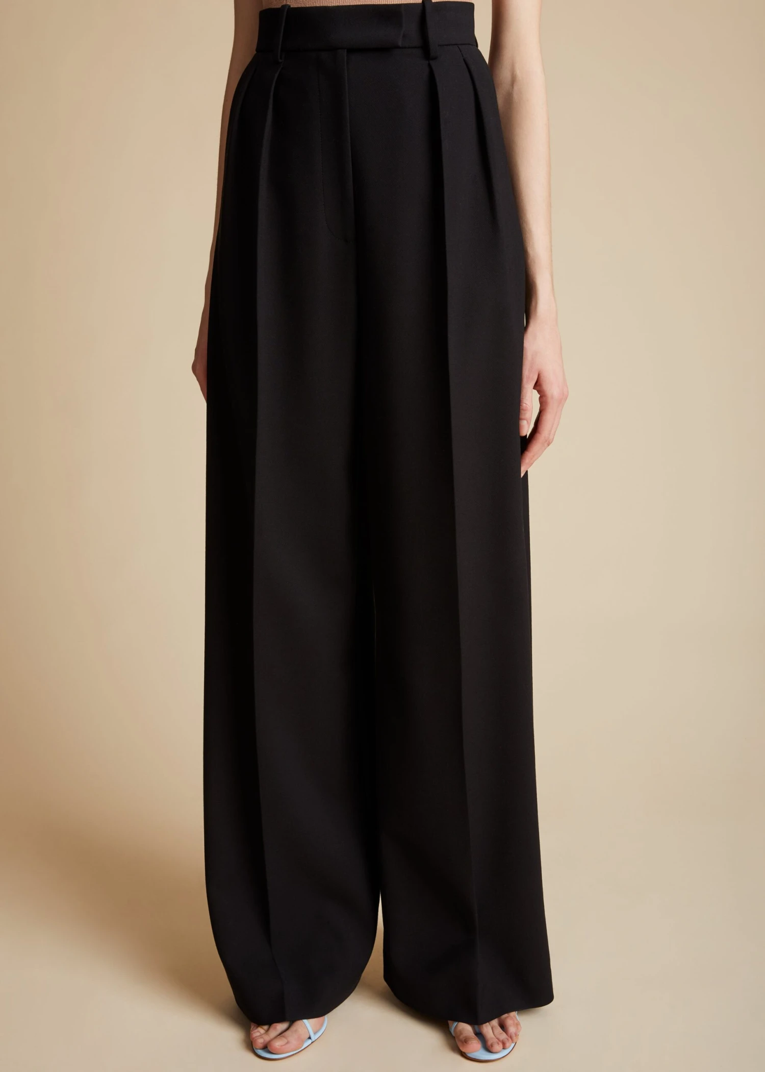 Through elongated and intensified silhouettes like this pleated trouser, Pre-Fall 2023 proposes a wardrobe of intuition. The ease of the relaxed yet refined silhouette is accentuated by a high waist and paired forward pleats. Finishing touches include inset side pockets and a back welt pocket.