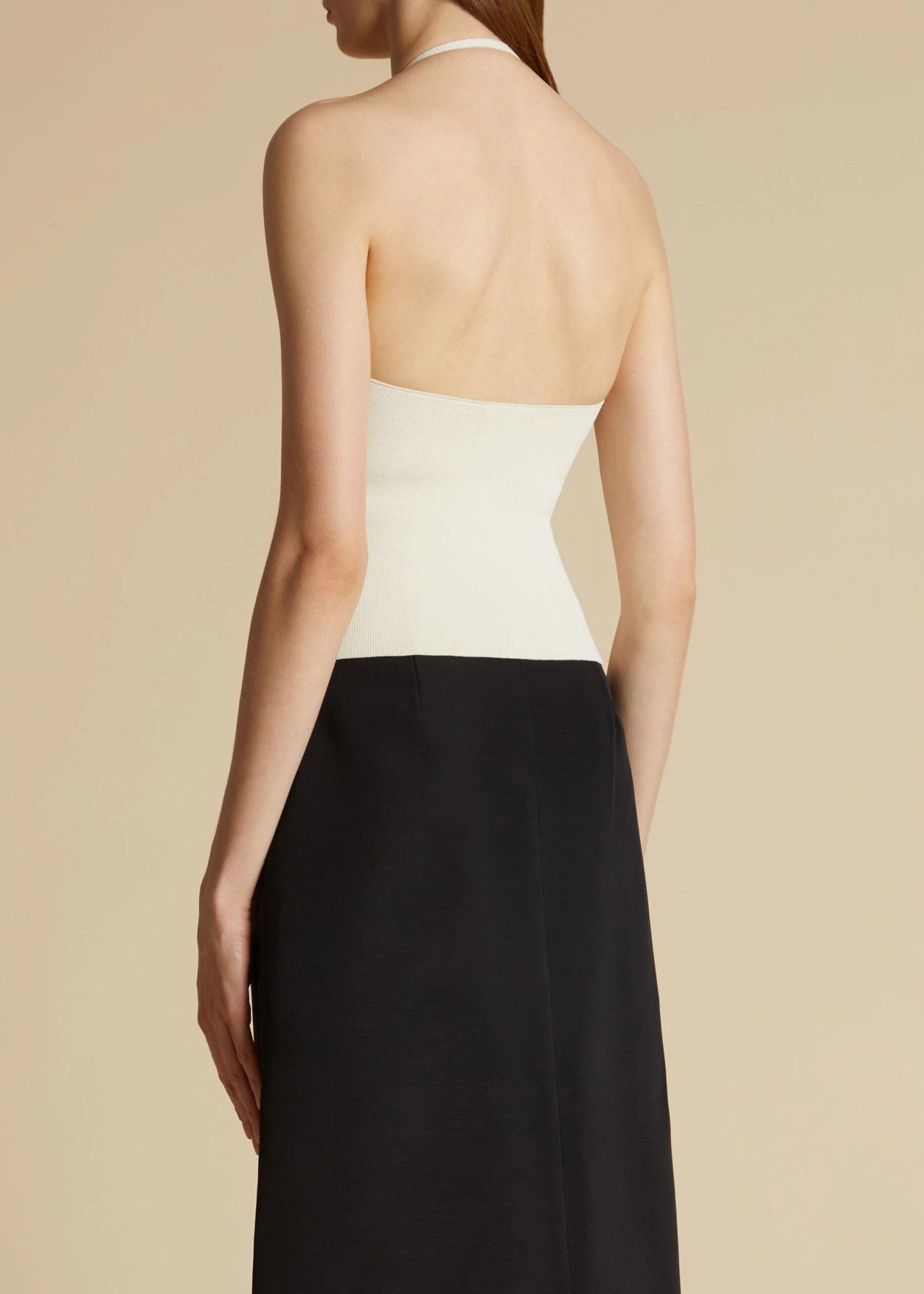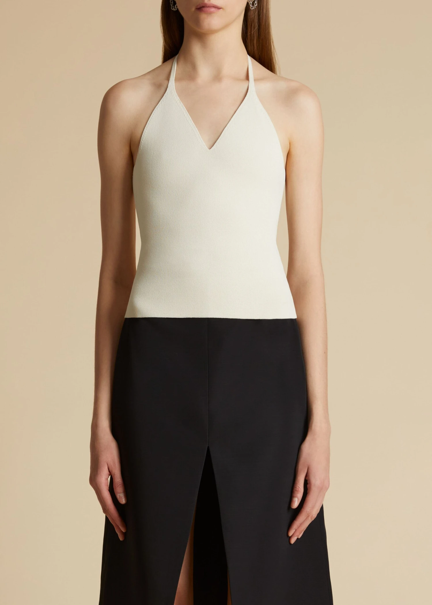 Through intensified silhouettes like this halter-neck knit top, the Pre-Fall collection proposes a wardrobe of intuition. Designed for a close fit in matte viscose selected for its stretch and structure, the sleek, low-back silhouette is refined by Milano stitching. It slips on for a smooth fit.
