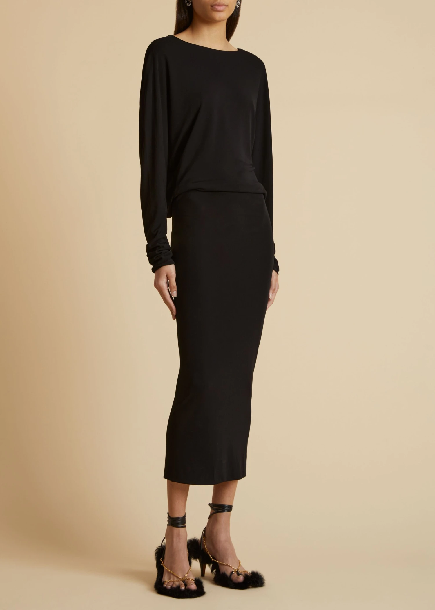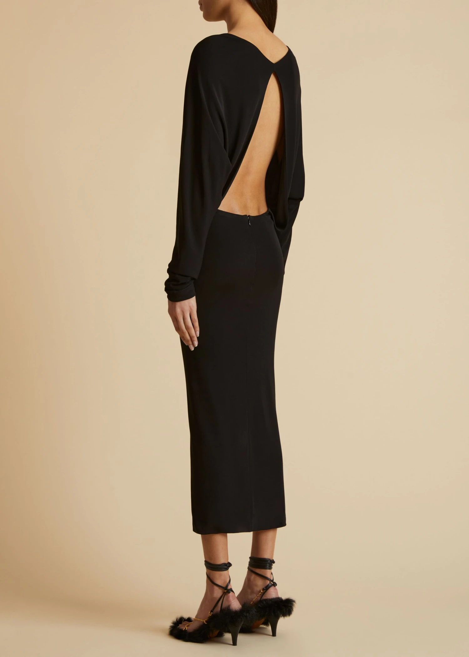 A fluid dress made memorable by its draped, open back. The blouson top is relaxed by seamless armholes. With concealed zipper at the low back.