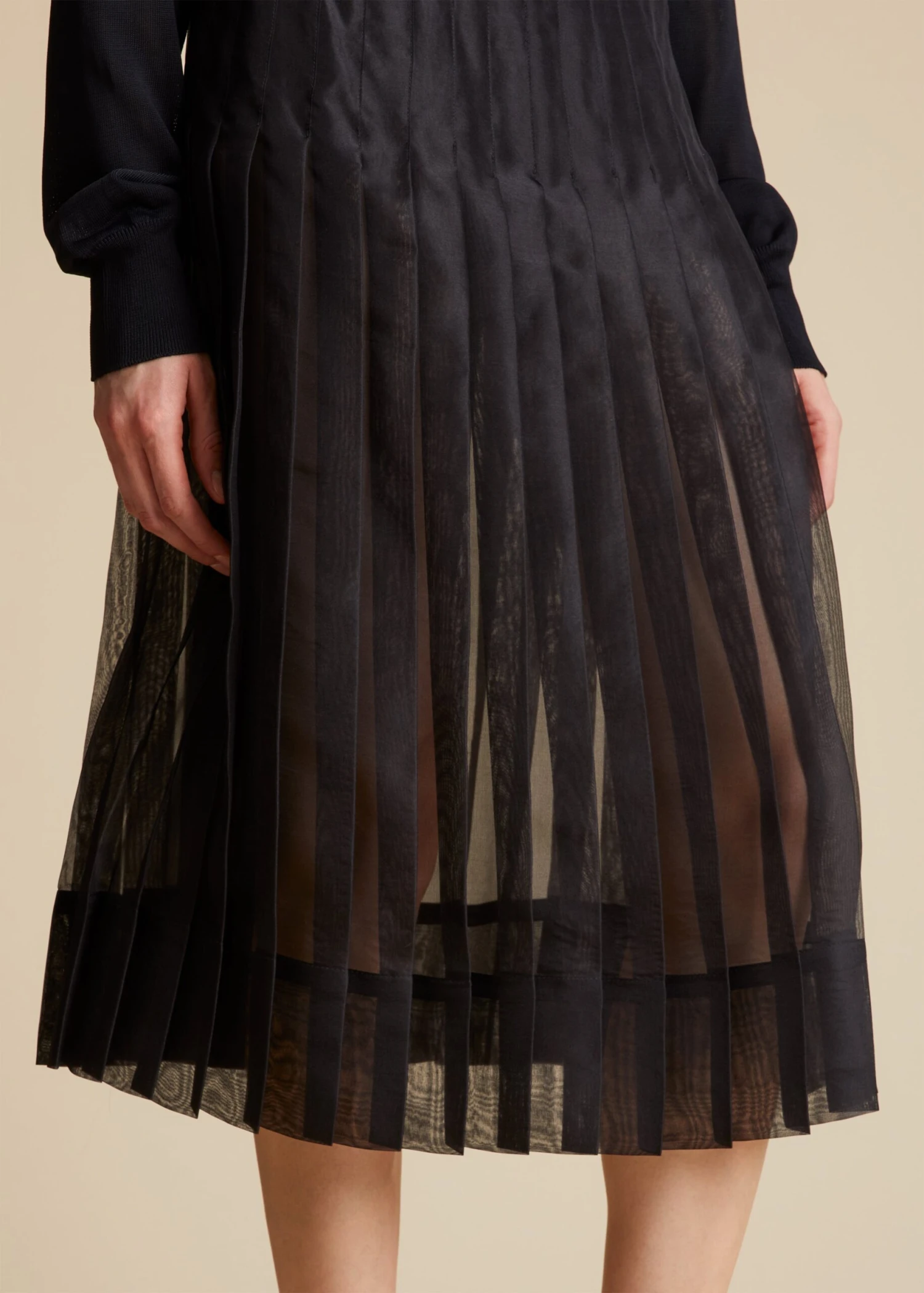 A signature Pre-Fall silhouette, this knife-pleated skirt reveals its construction through the sheer structure of silk organza. Designed to sit lower on the waist, the A-line silhouette is refined by pleats that are stitched at the top and then released. An invisible side zipper ensures a smooth fit.