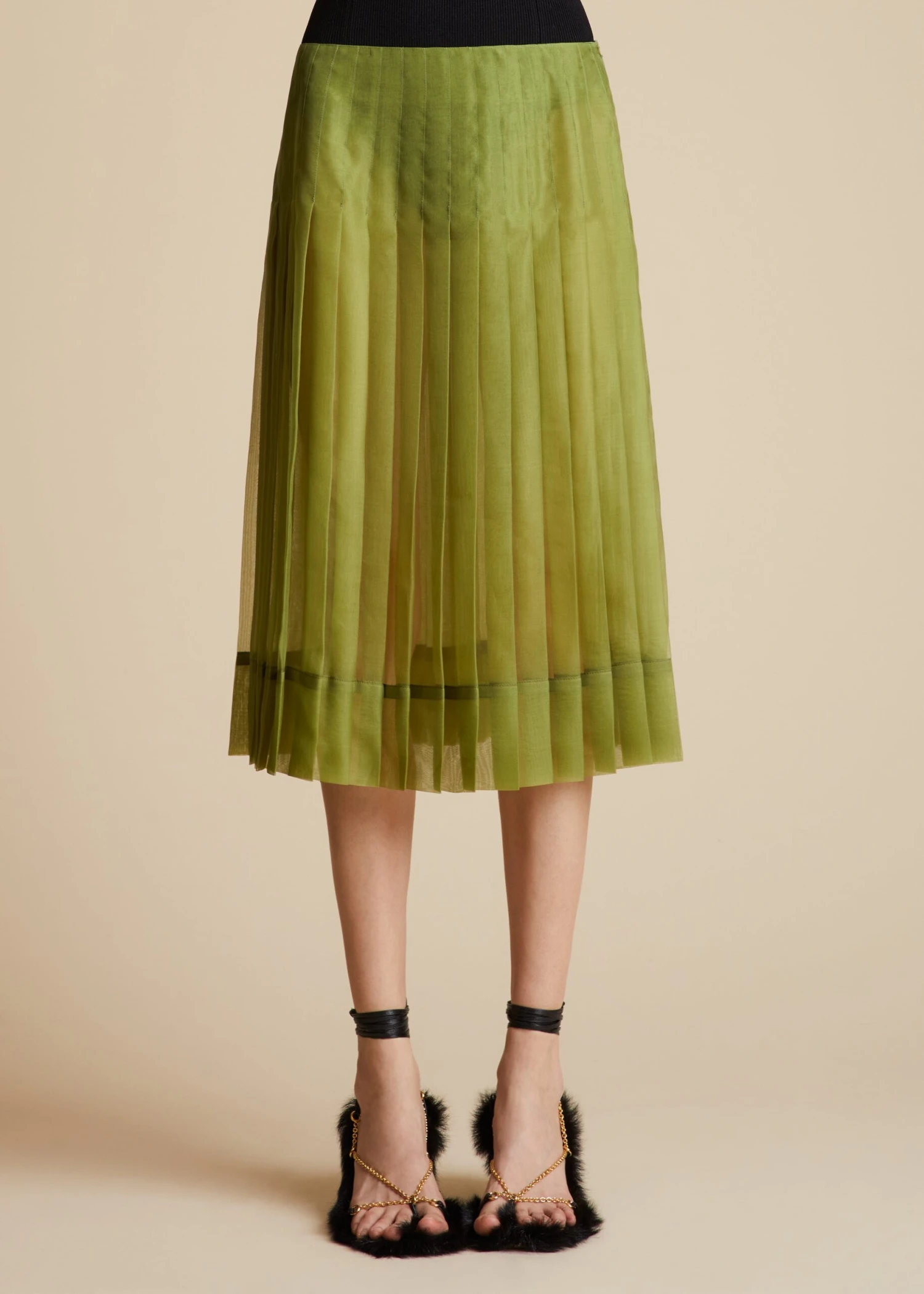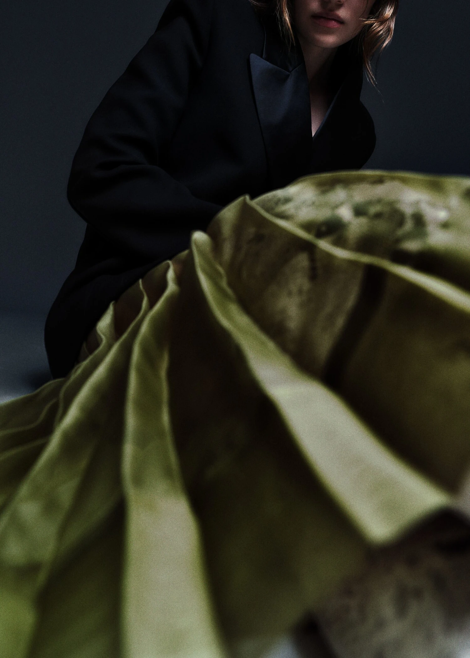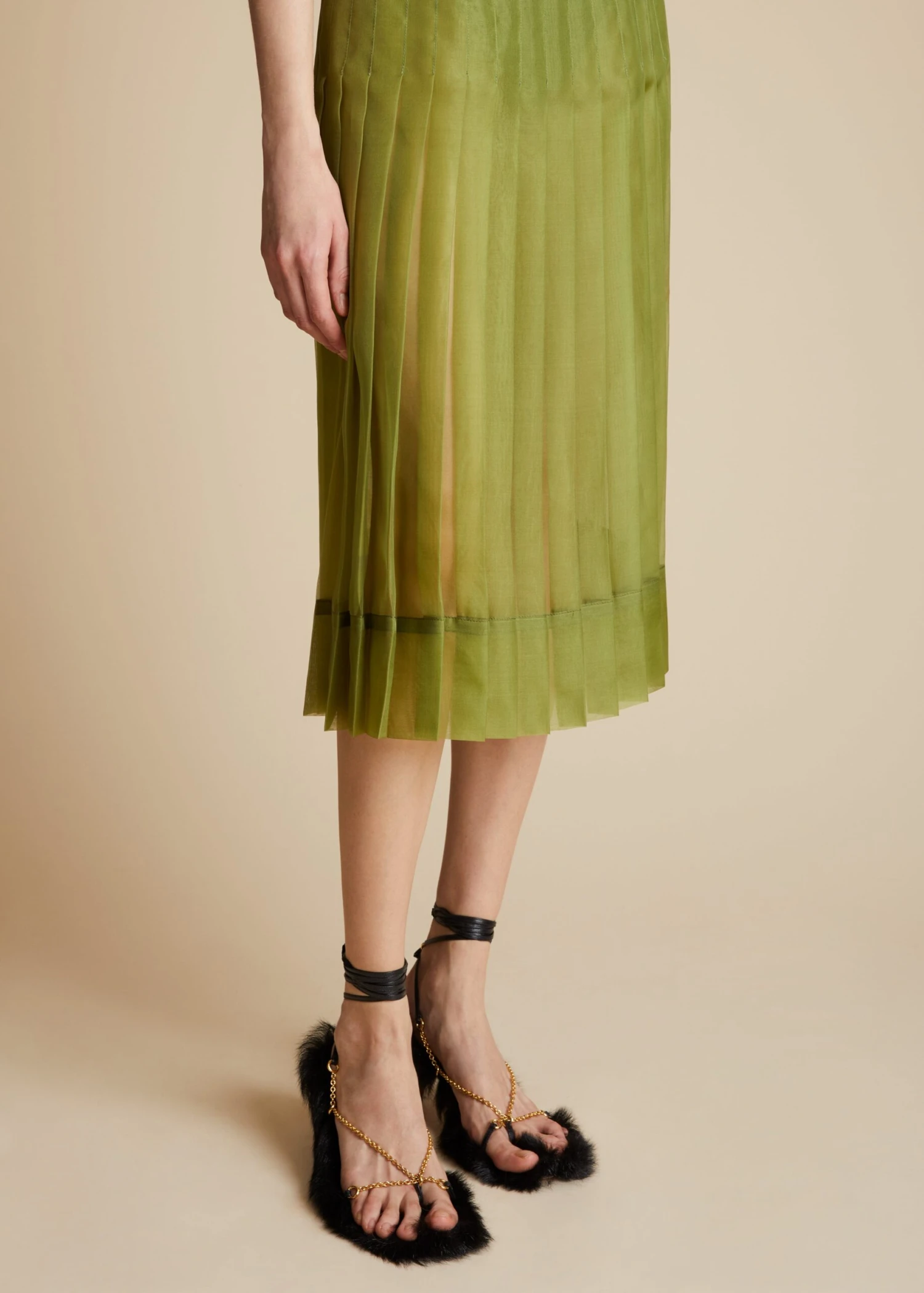 A signature Pre-Fall silhouette, this knife-pleated skirt reveals its construction through the sheer structure of silk organza. Designed to sit lower on the waist, the A-line silhouette is refined by pleats that are stitched at the top and then released. An invisible side zipper ensures a smooth fit.